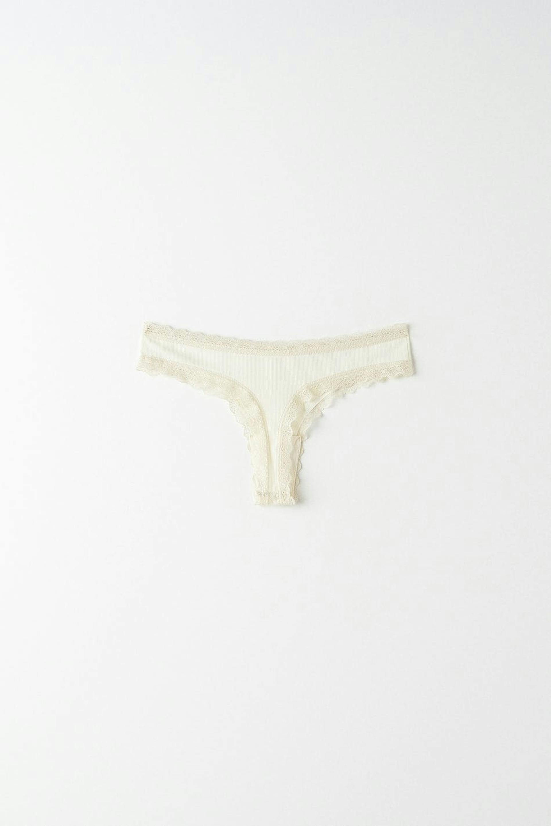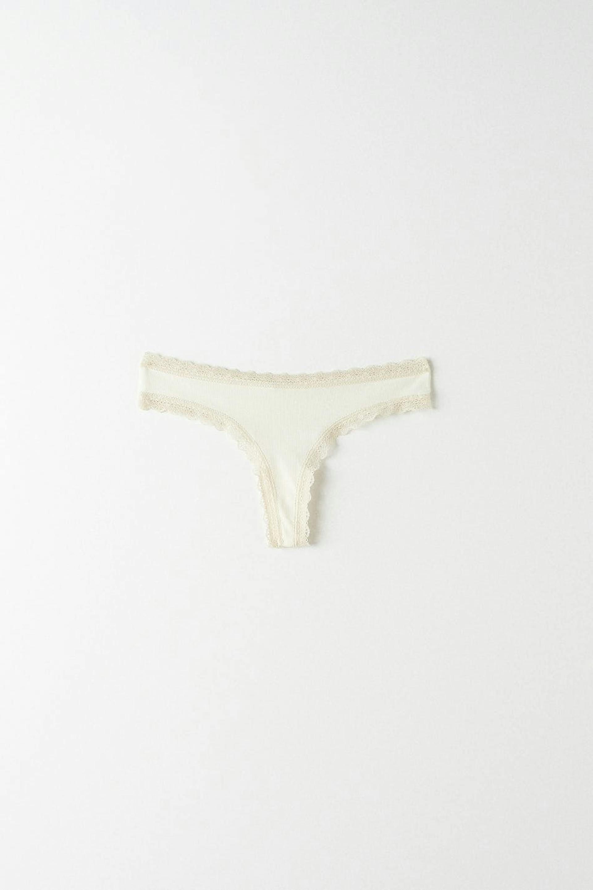 Ribbet stringtruser med blondekanter. Stringtrusene er sjampagnefargede og har et fôret skritt i bomull.