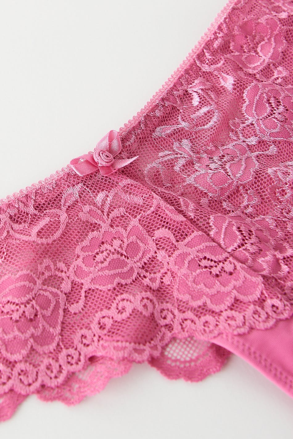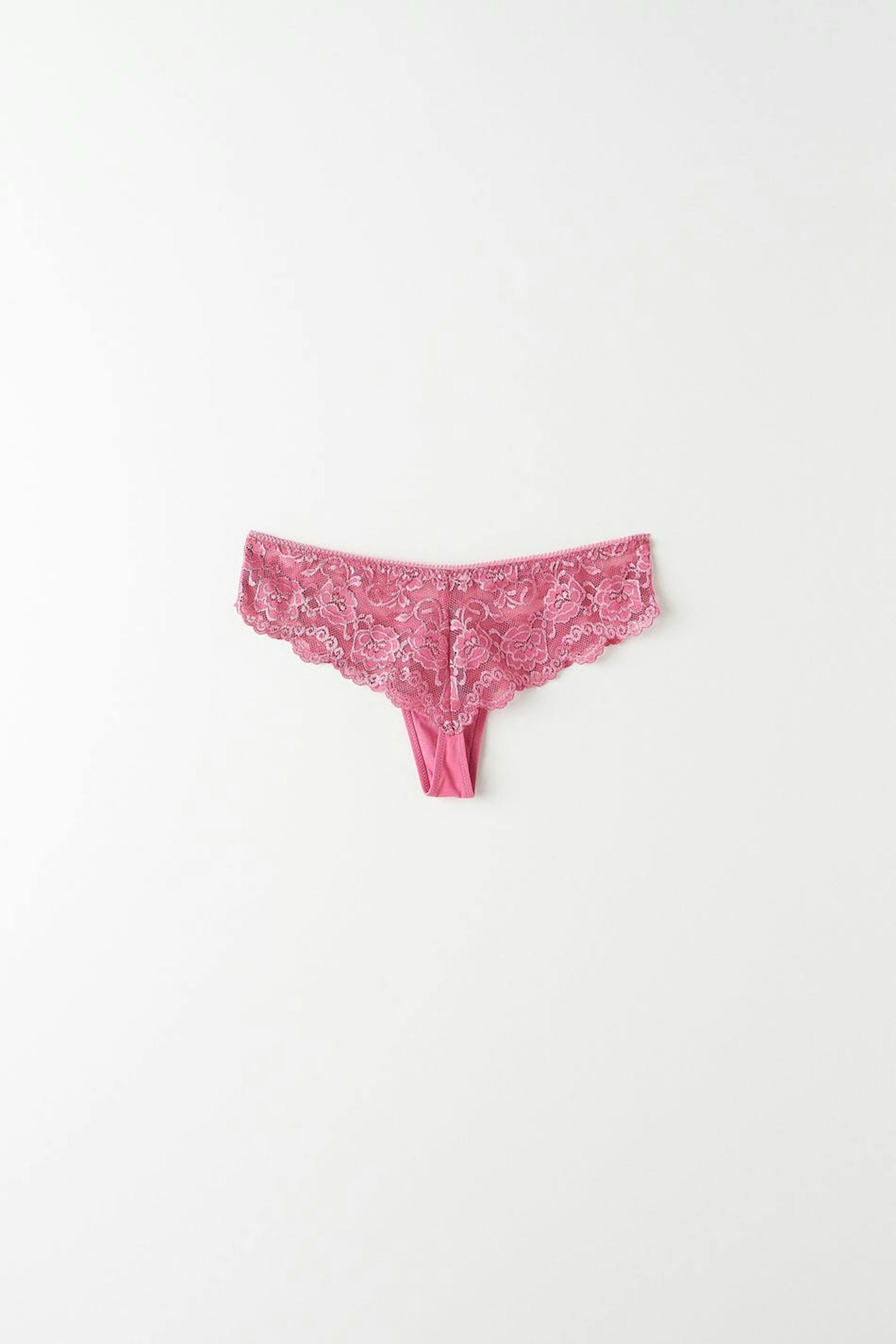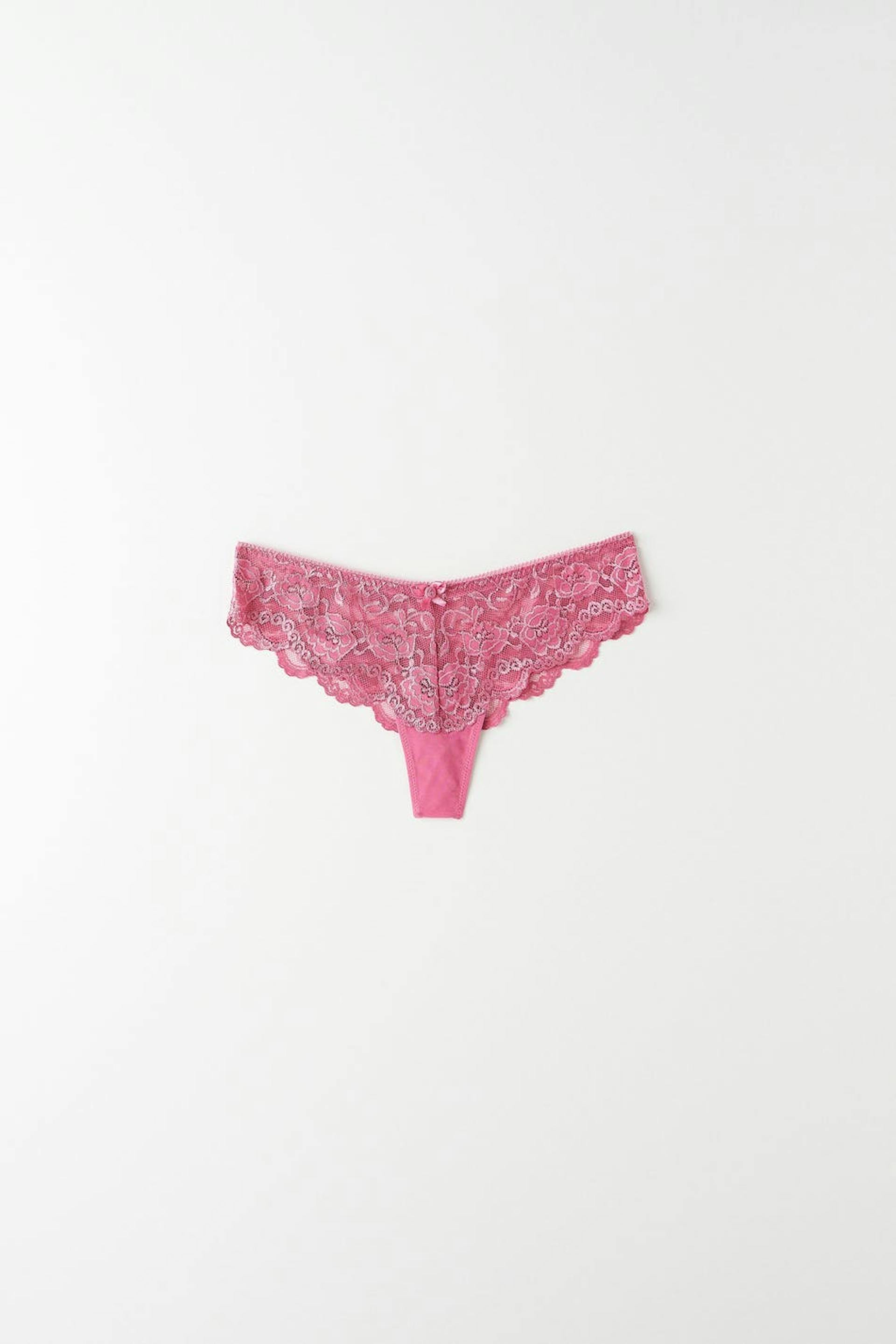 Kniplede stringtruser med fôret skritt. Stringtrusene er rosa og har en sløyfedetalj foran.