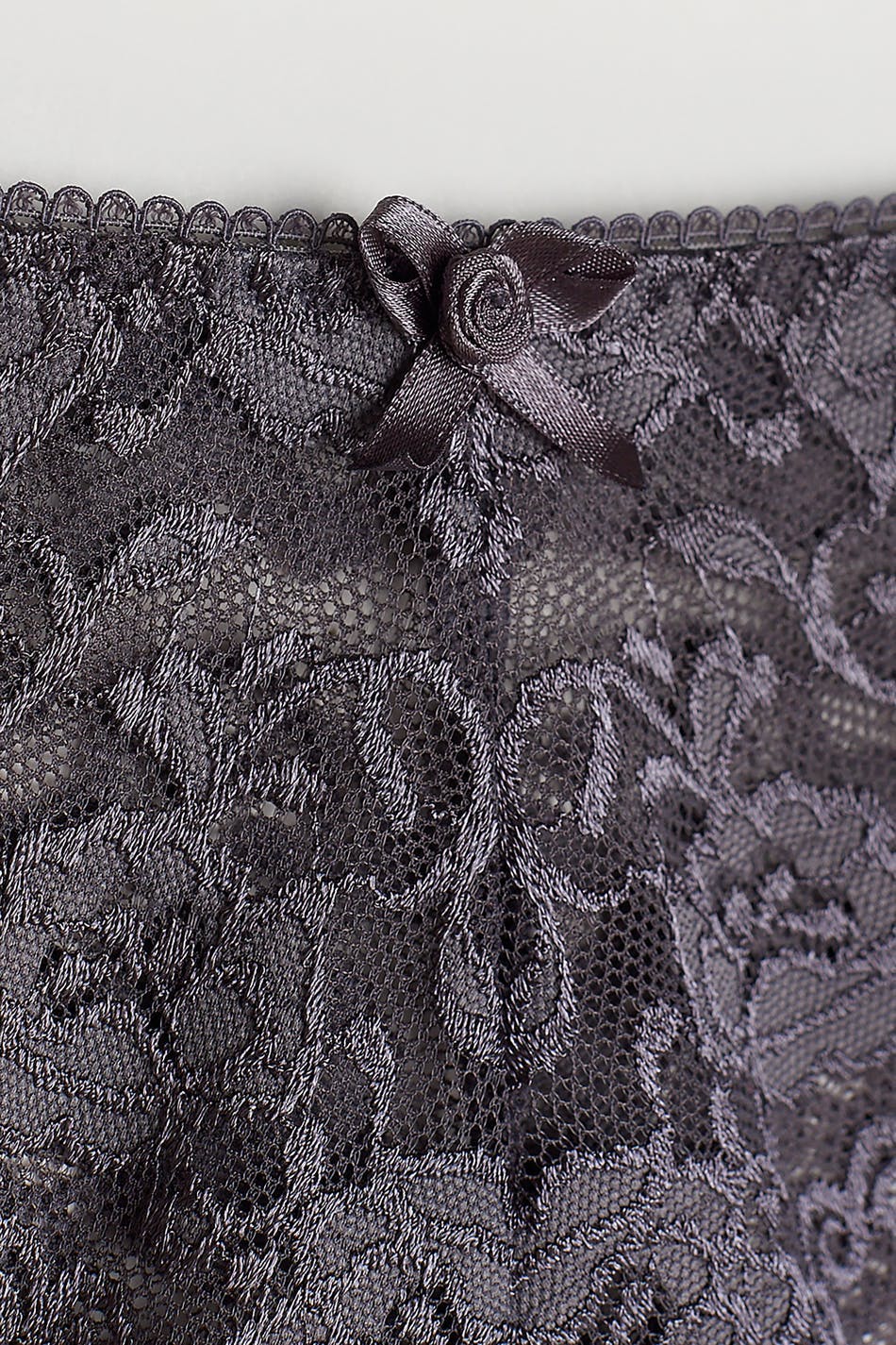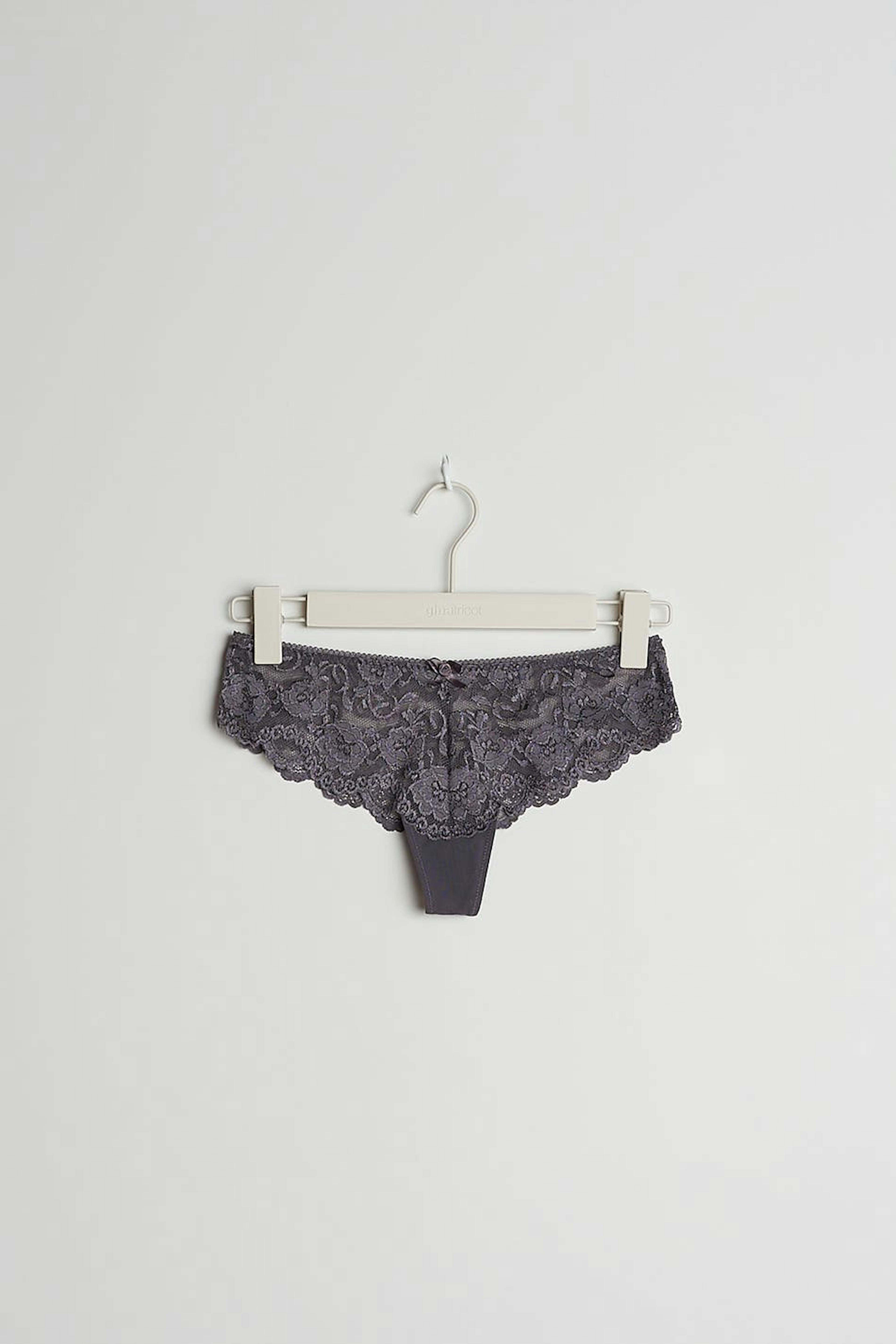 Kniplede stringtruser med fôret skritt. Stringtrusene er grå og har en sløyfedetalj foran.