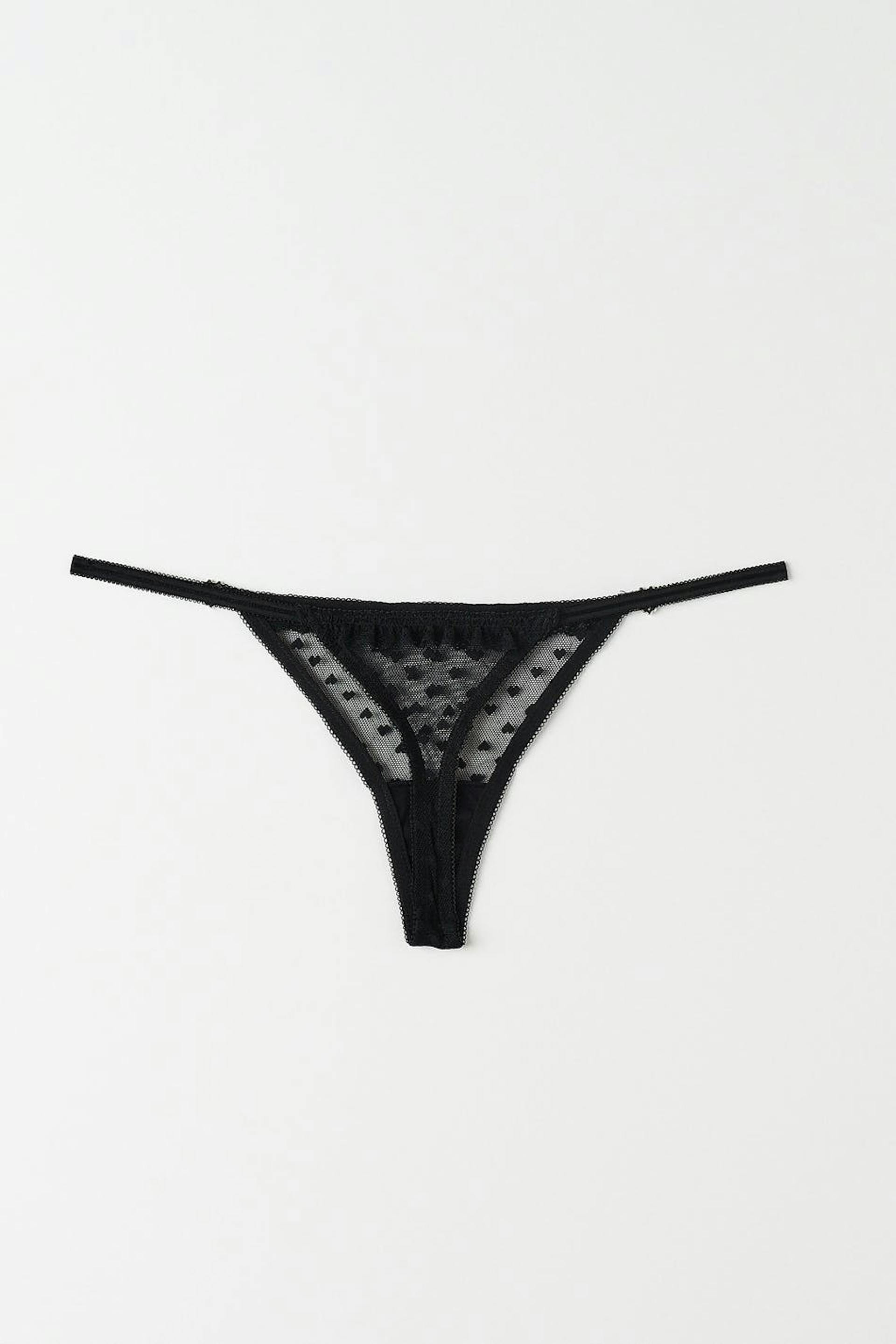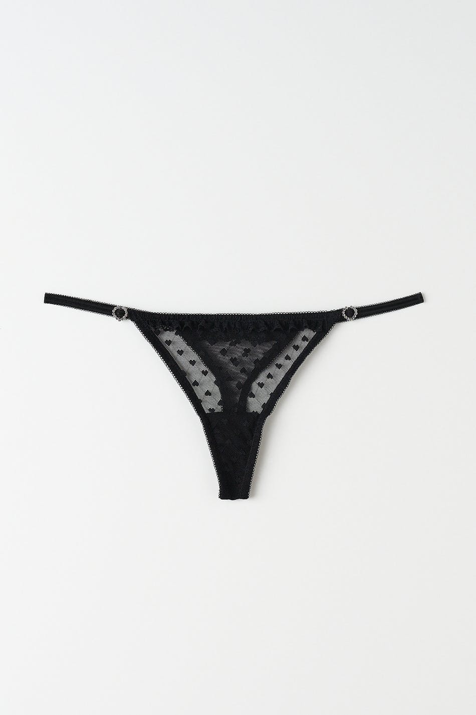 Stringtruser med fôret skritt. Stringtrusene er svarte og har tynne elastiske stropper med rhinestone-detaljer i sidene.