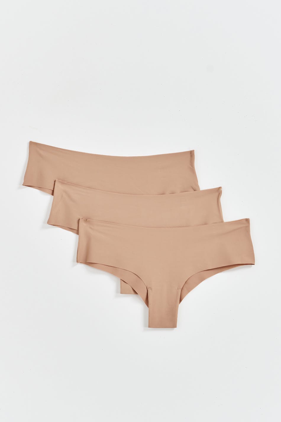 Supermyke brasilianske truser med usynlige trusekanter. De brasilianske trusene er beige og har fôret skritt.