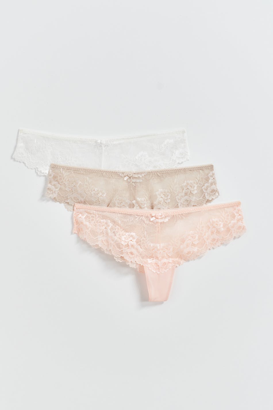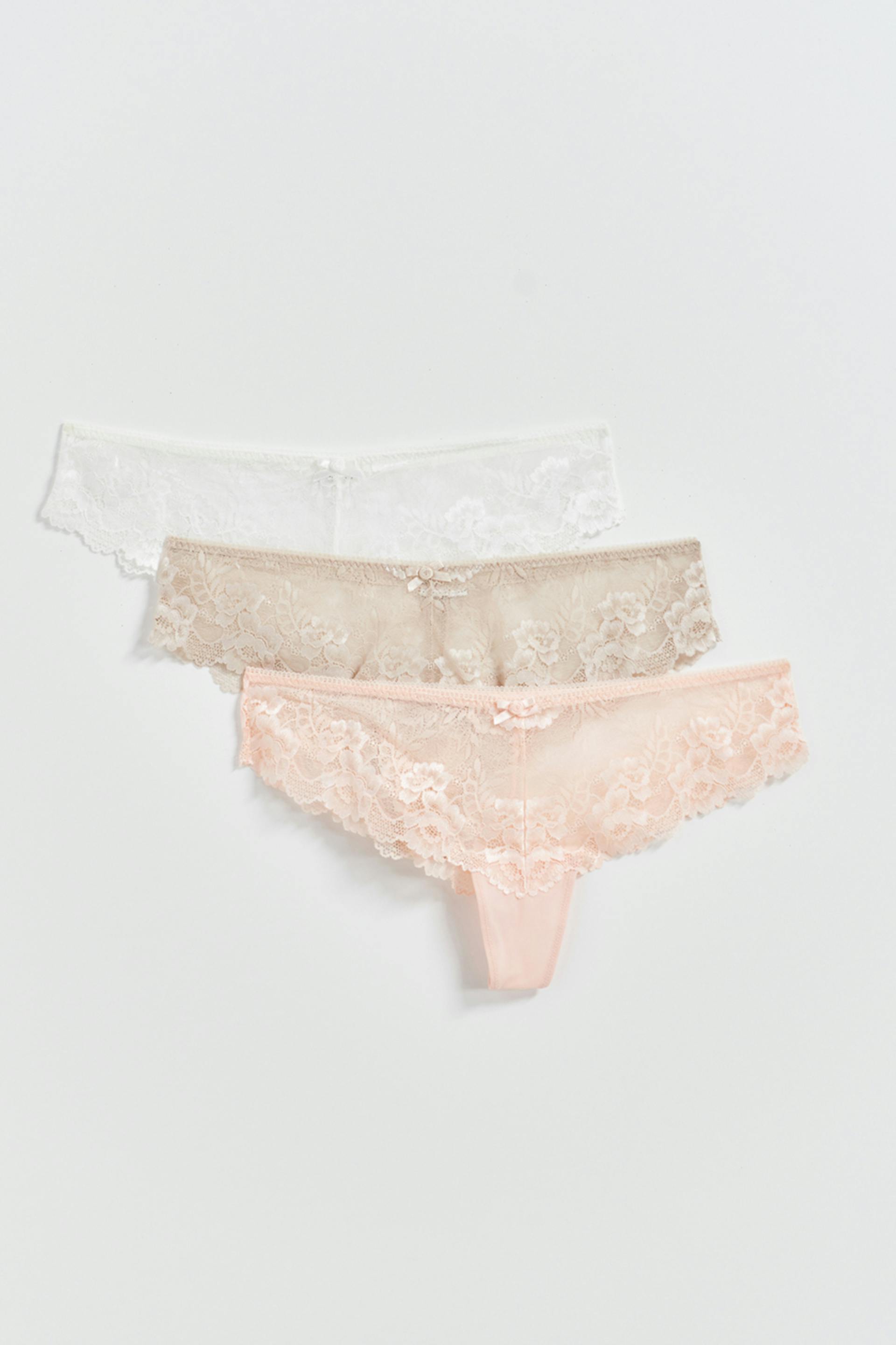 Stringtruser i blonde med fôret skritt. Stringtrusene er rosa og har sløyfedetalj foran. 3-pakning.