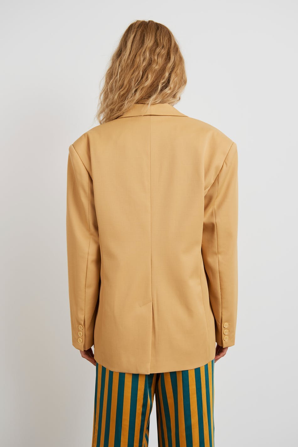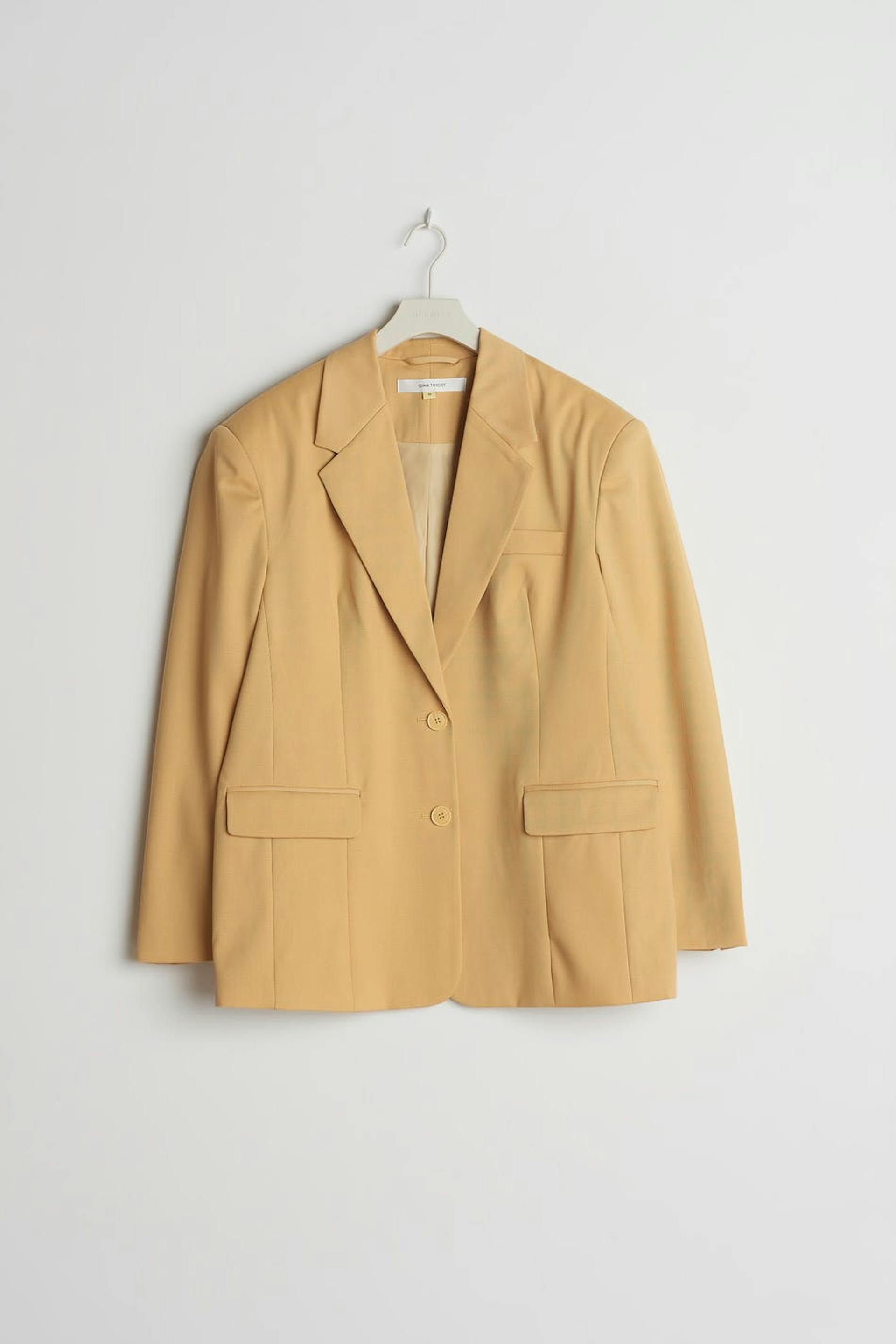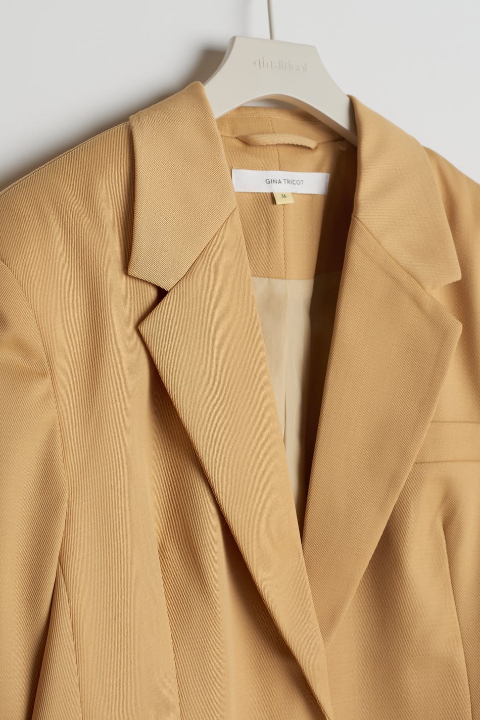 Hobnob X Gina Tricot. Blazeren med dekorative sømdetaljer foran. Blazer er gul og har en krage. Den har definerte skuldre, delte lommer med lokk og knapper foran og på enden av ermene.