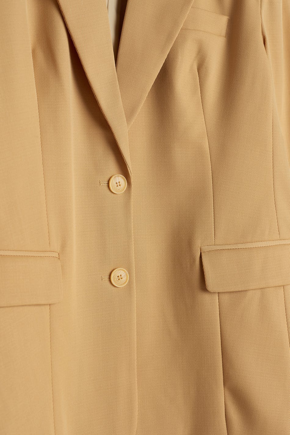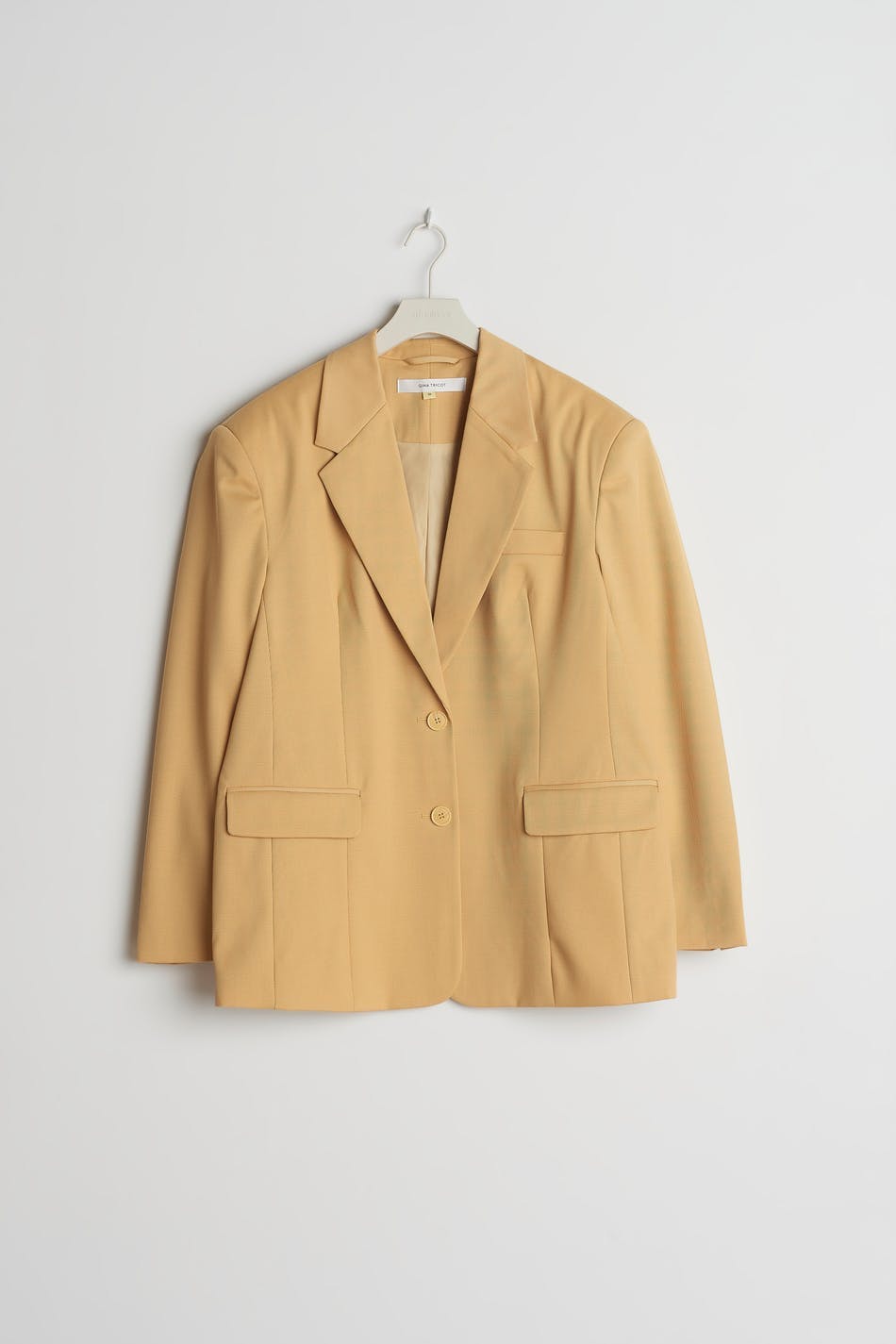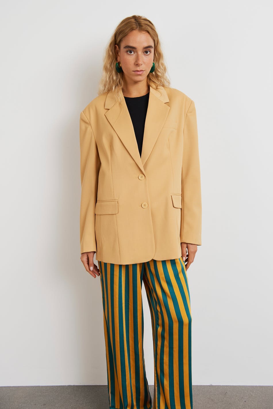 Hobnob X Gina Tricot. Blazeren med dekorative sømdetaljer foran. Blazer er gul og har en krage. Den har definerte skuldre, delte lommer med lokk og knapper foran og på enden av ermene.