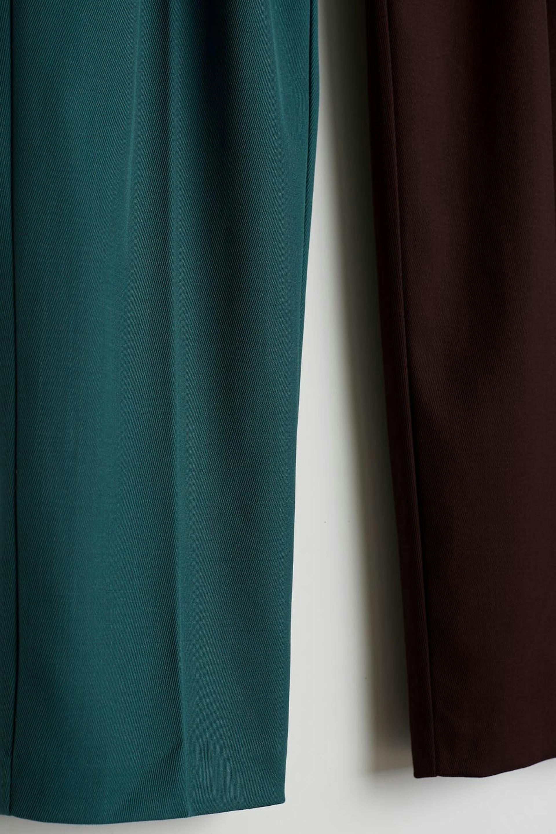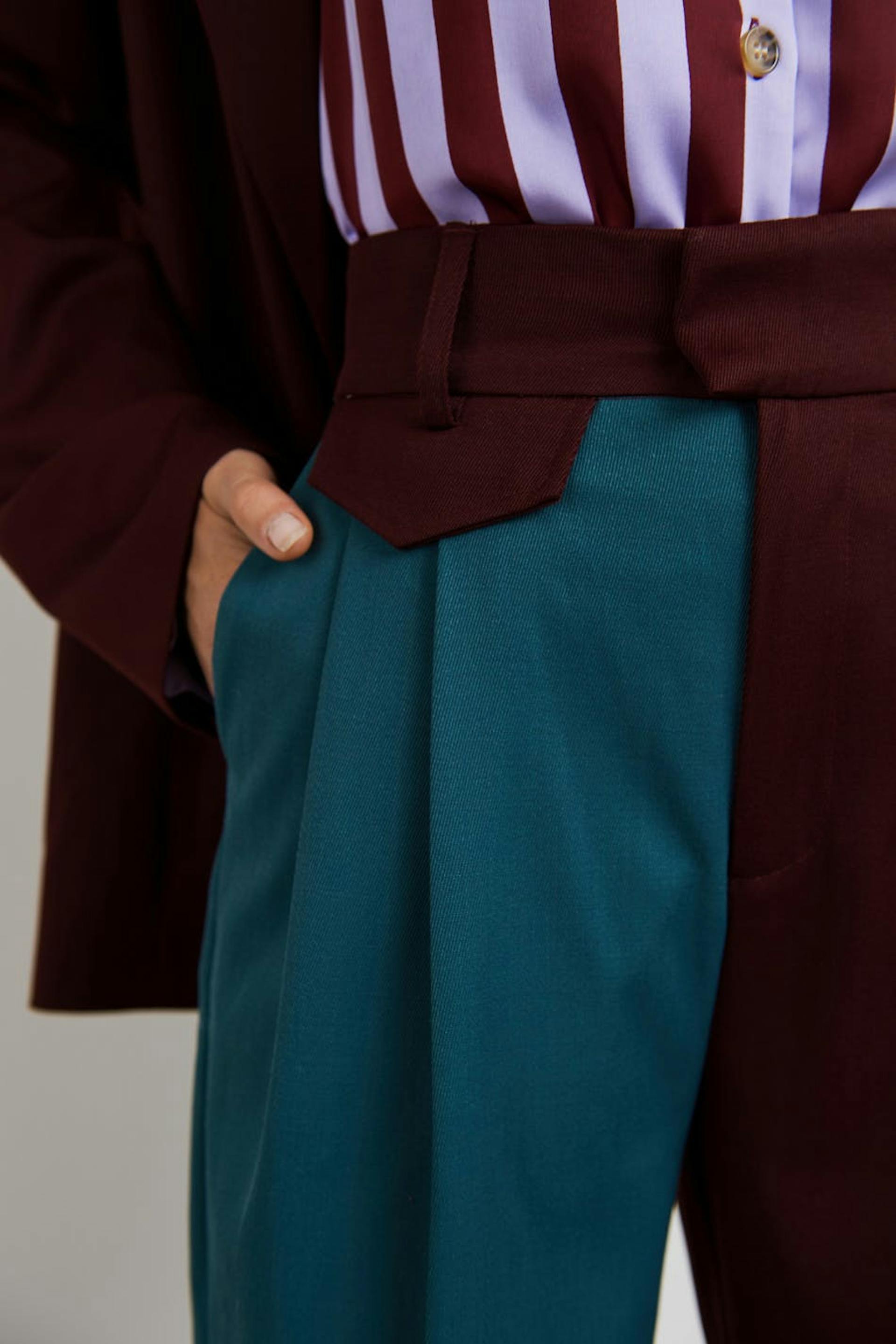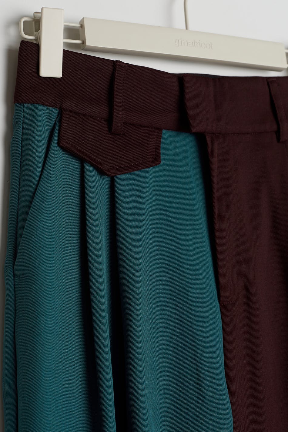 Hobnob X Gina Tricot. Dressbukser med krøllede detaljer foran. Buksene er røde og blå og har fargeblokkdetaljer. De har skråe lommer i sidene og rette buksebein med en full lengde.