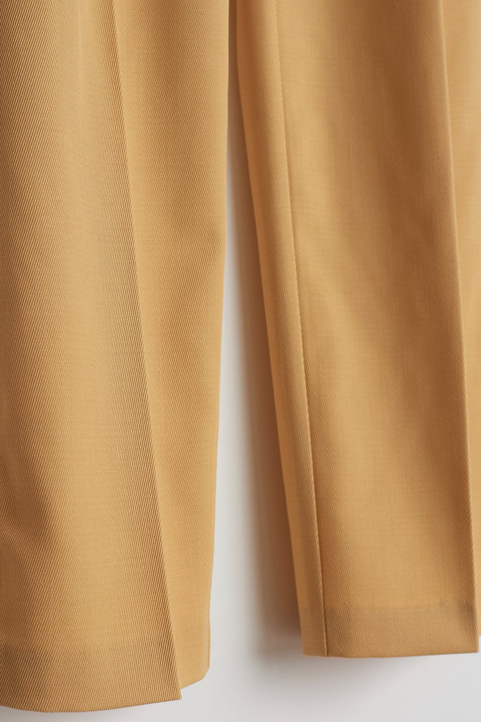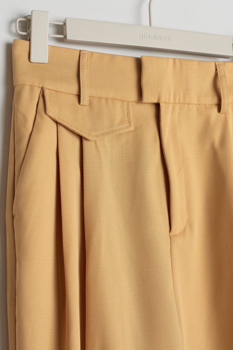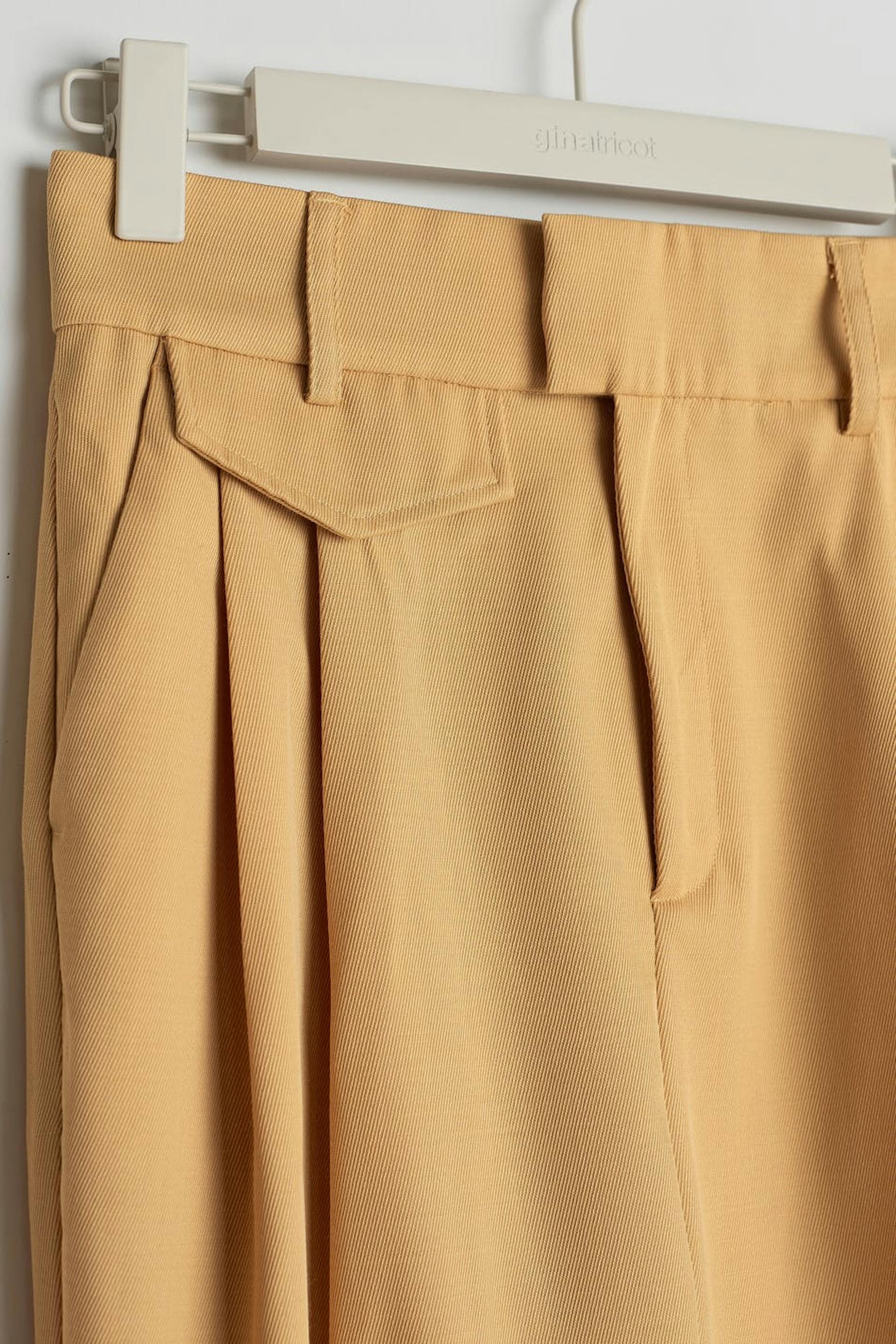 Hobnob X Gina Tricot. Dressbukser med dekorative krøllede detaljer foran. Buksene er gule og har skråe lommer i sidene. De har rette buksebein med en full lengde.