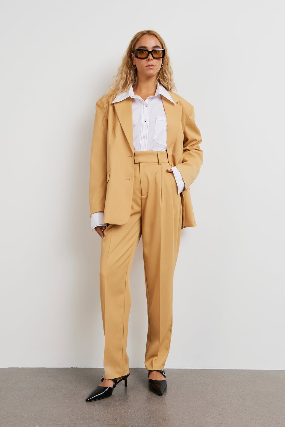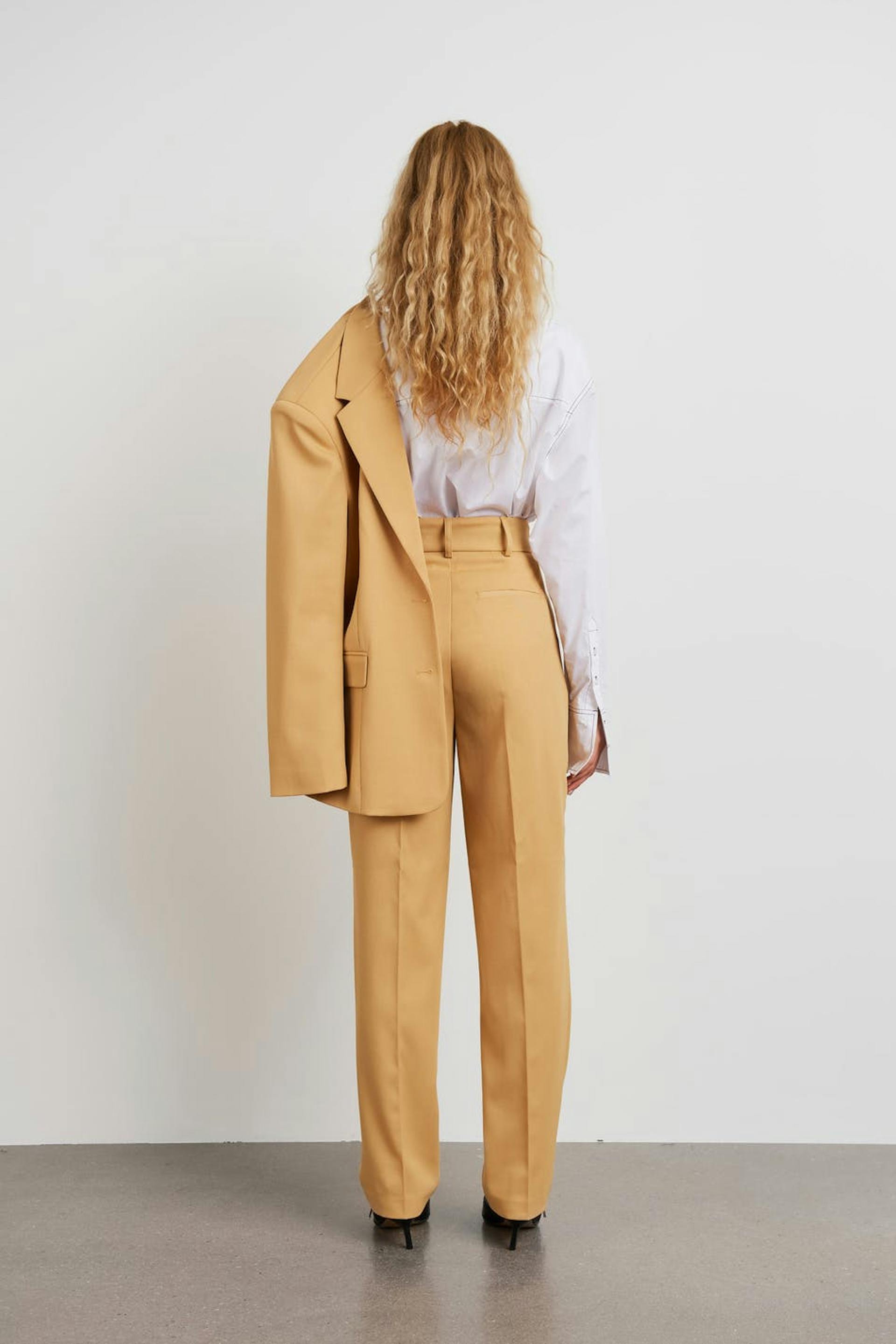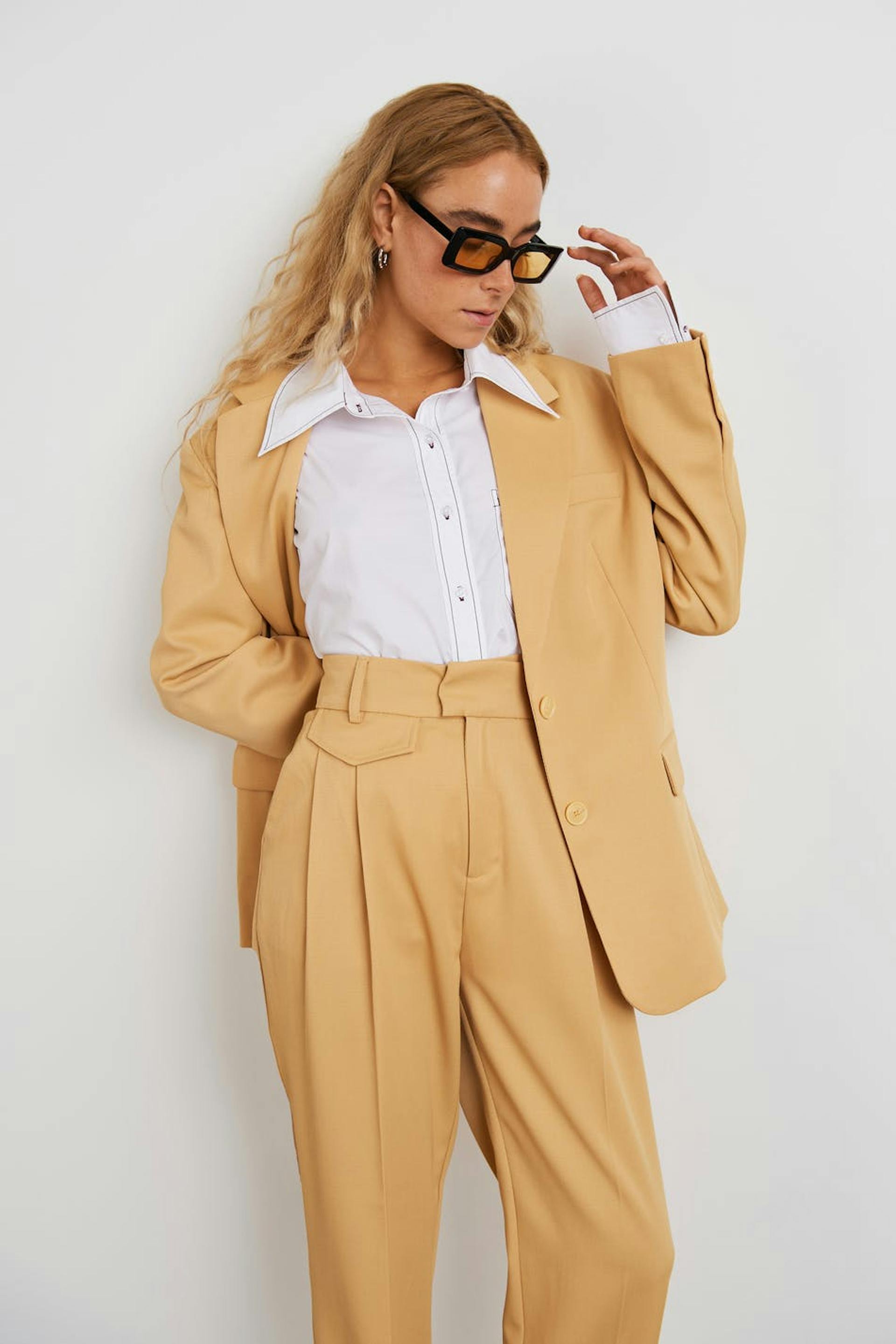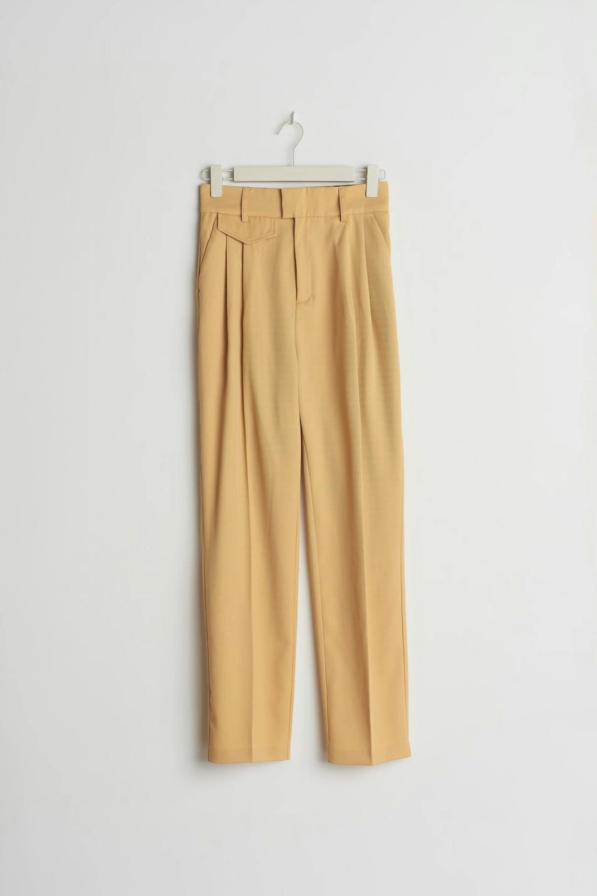 Hobnob X Gina Tricot. Dressbukser med dekorative krøllede detaljer foran. Buksene er gule og har skråe lommer i sidene. De har rette buksebein med en full lengde.