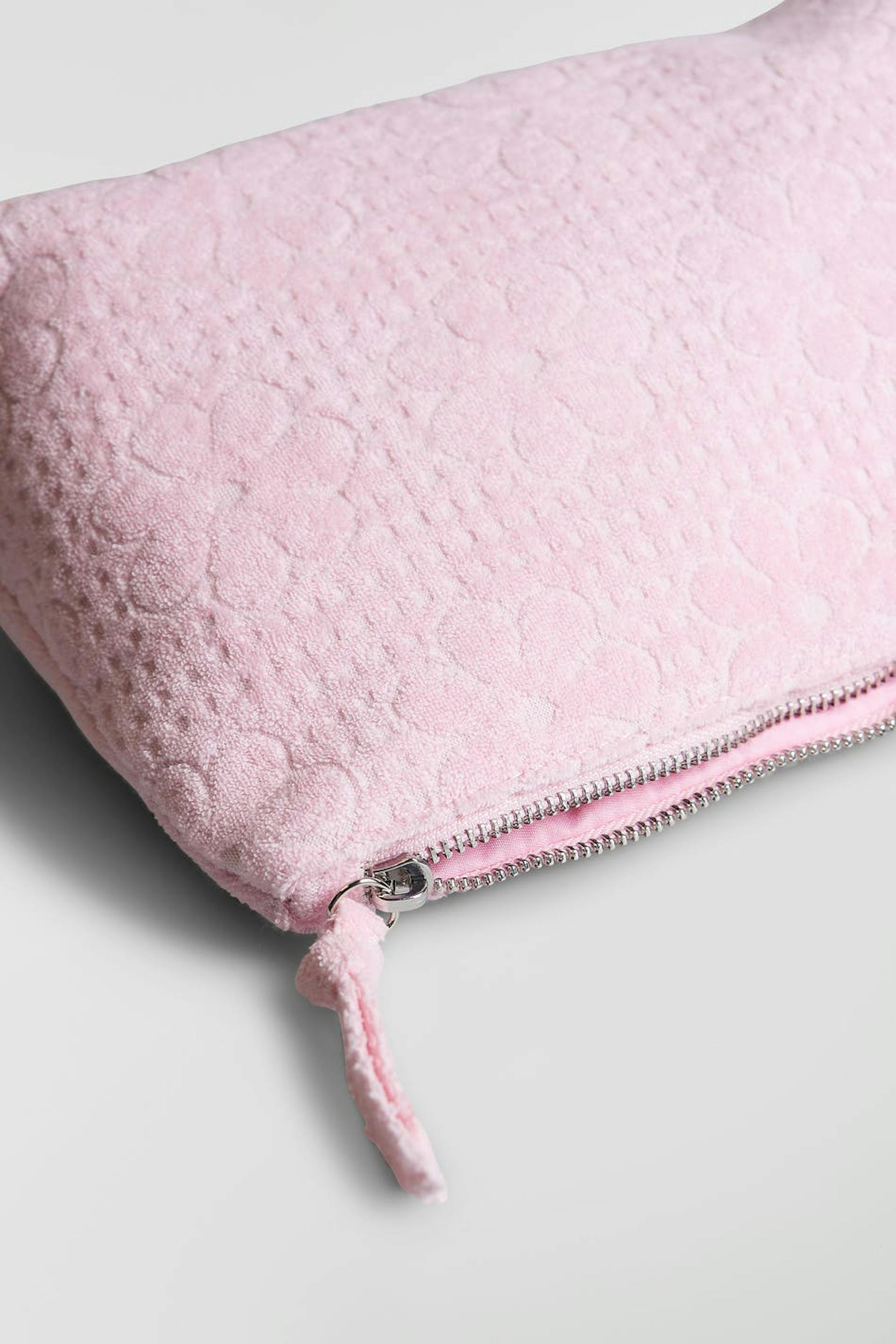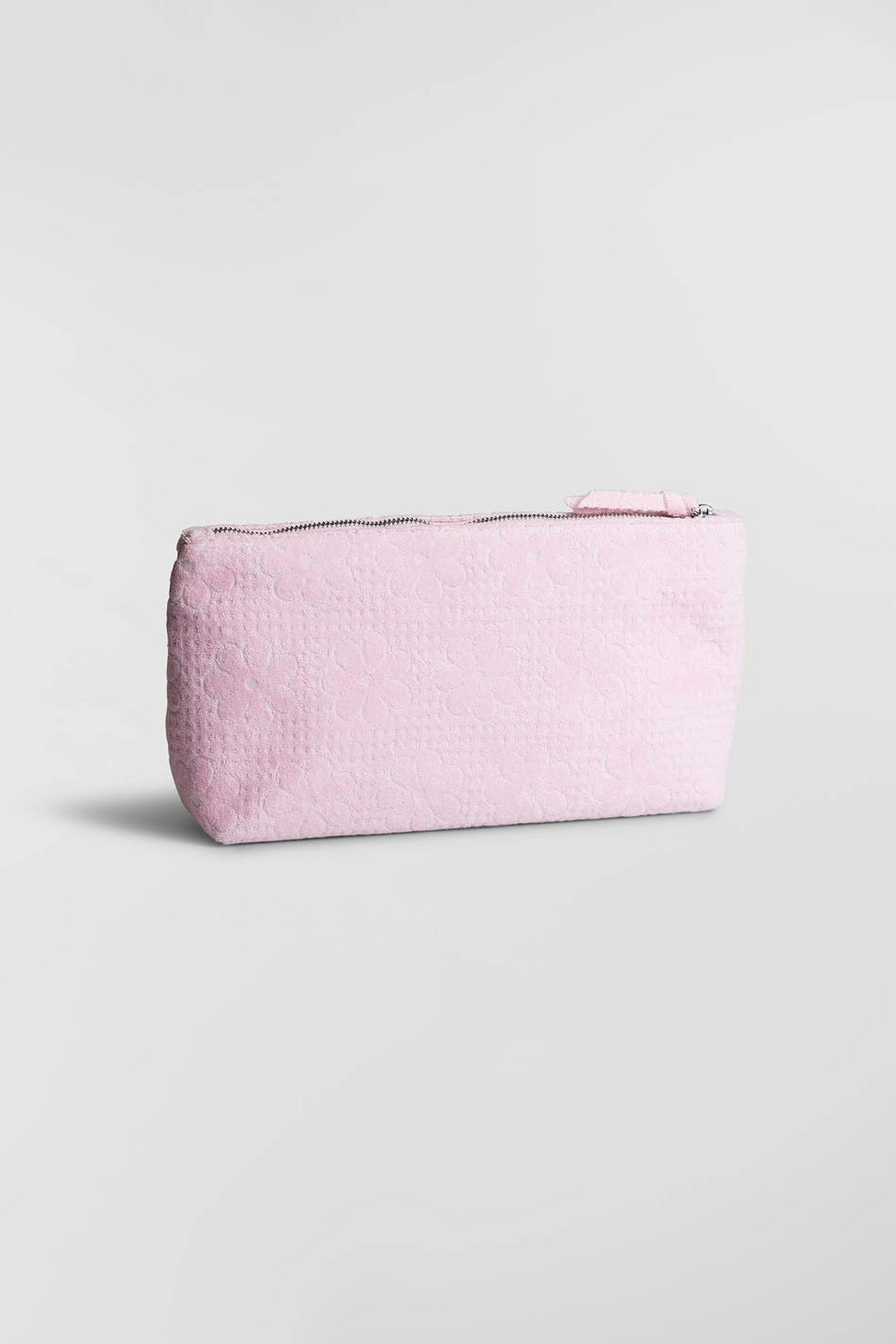 Toalettmappe med et blomstermønster og en glidelås på topp. Toalettmappen er lyse rosa og myk. Den er laget av frotté.