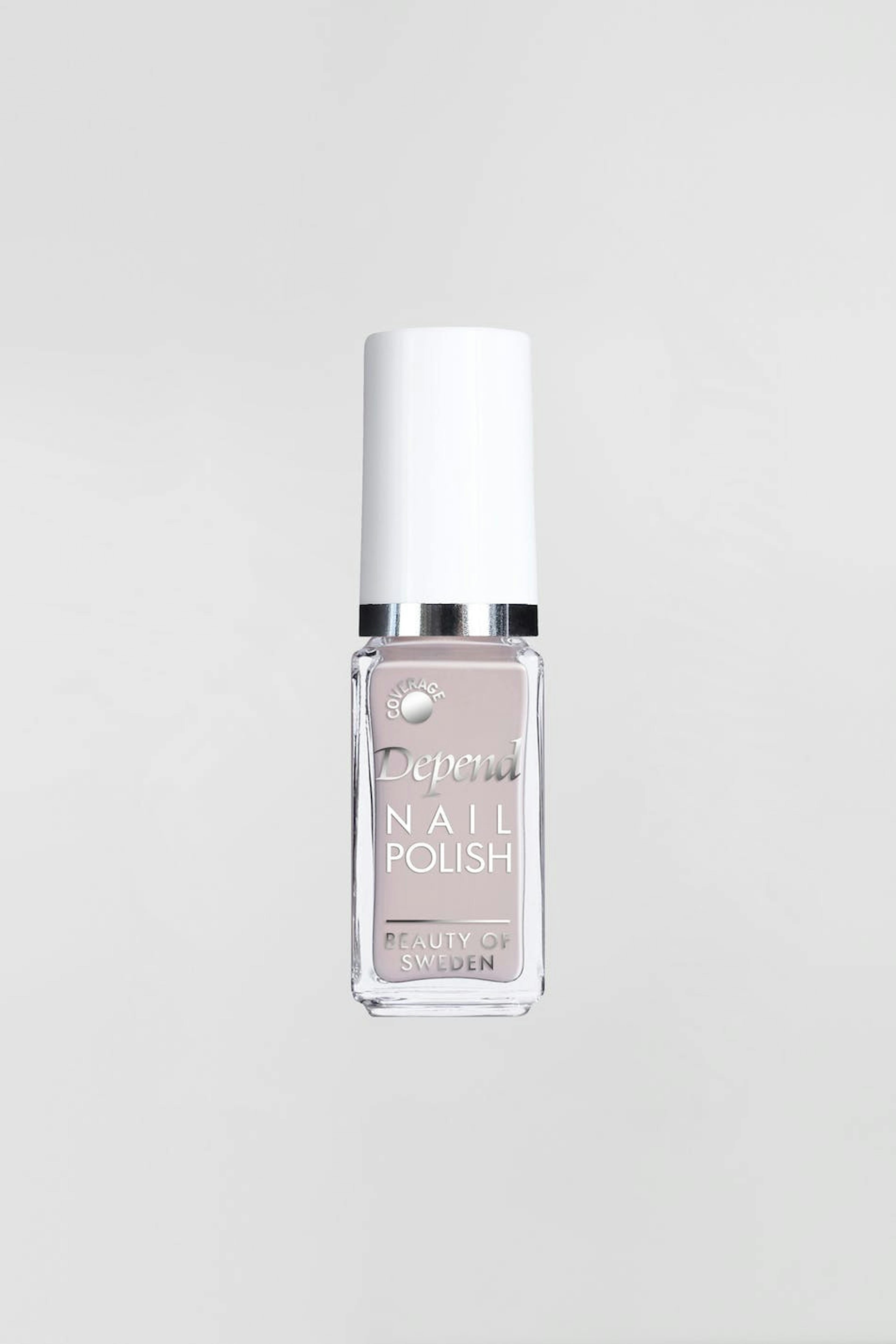 Liten neglelakk fra Depend med en flat børste med en avrundet kant. Neglelakken er grå.