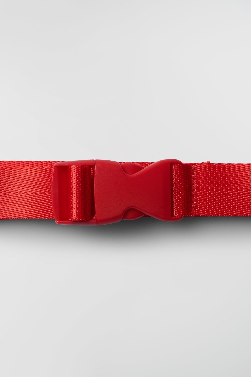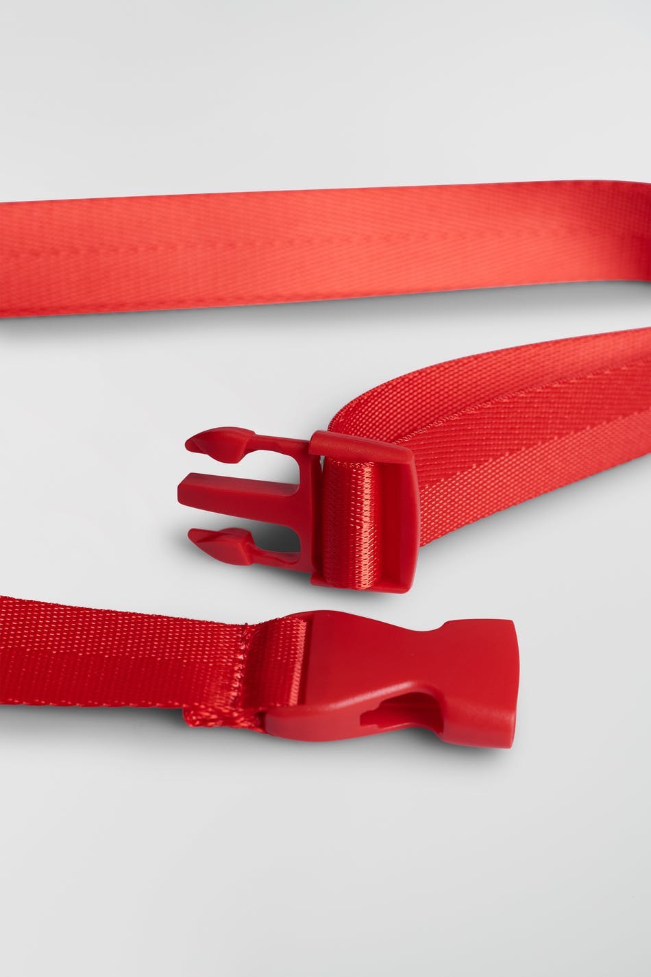 Belte med et stilrent design. Beltet er rødt og har en spenne i plast.
