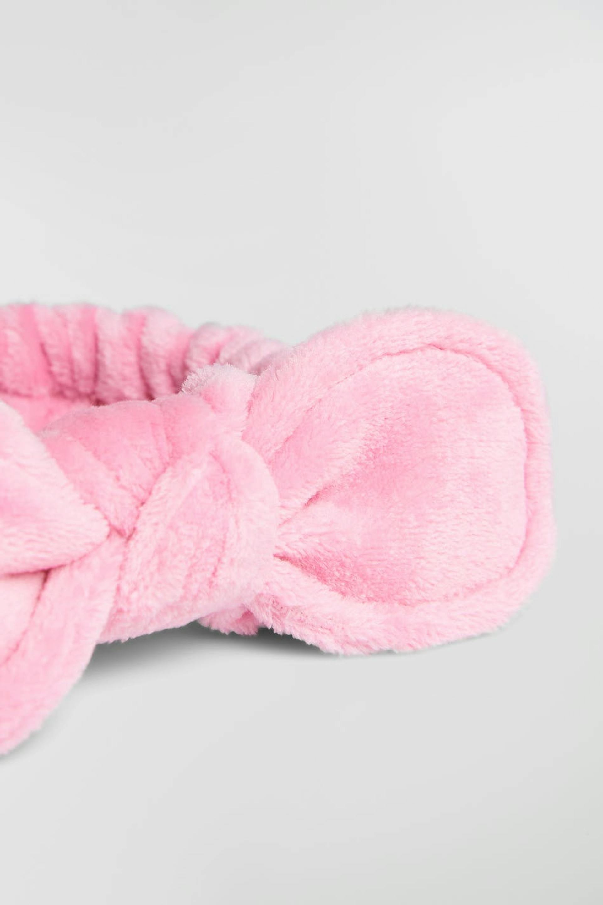 Makeup-hårbånd med en sløyfedetalj foran. Hårbåndet er rosa og har et mykt materiale i bomull.