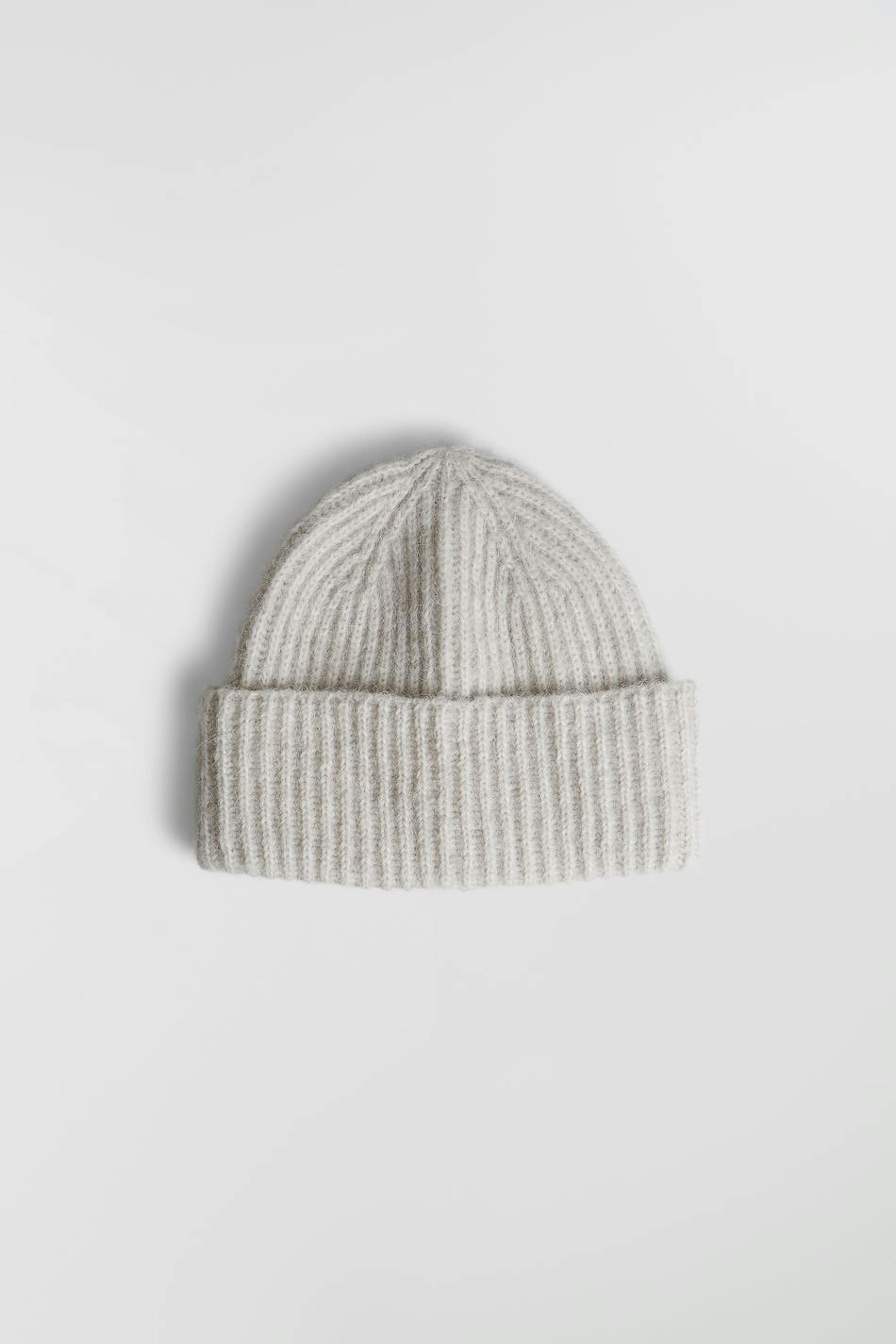 Ribbestrikket lue med oppbrettet kant. Hatten er grå.