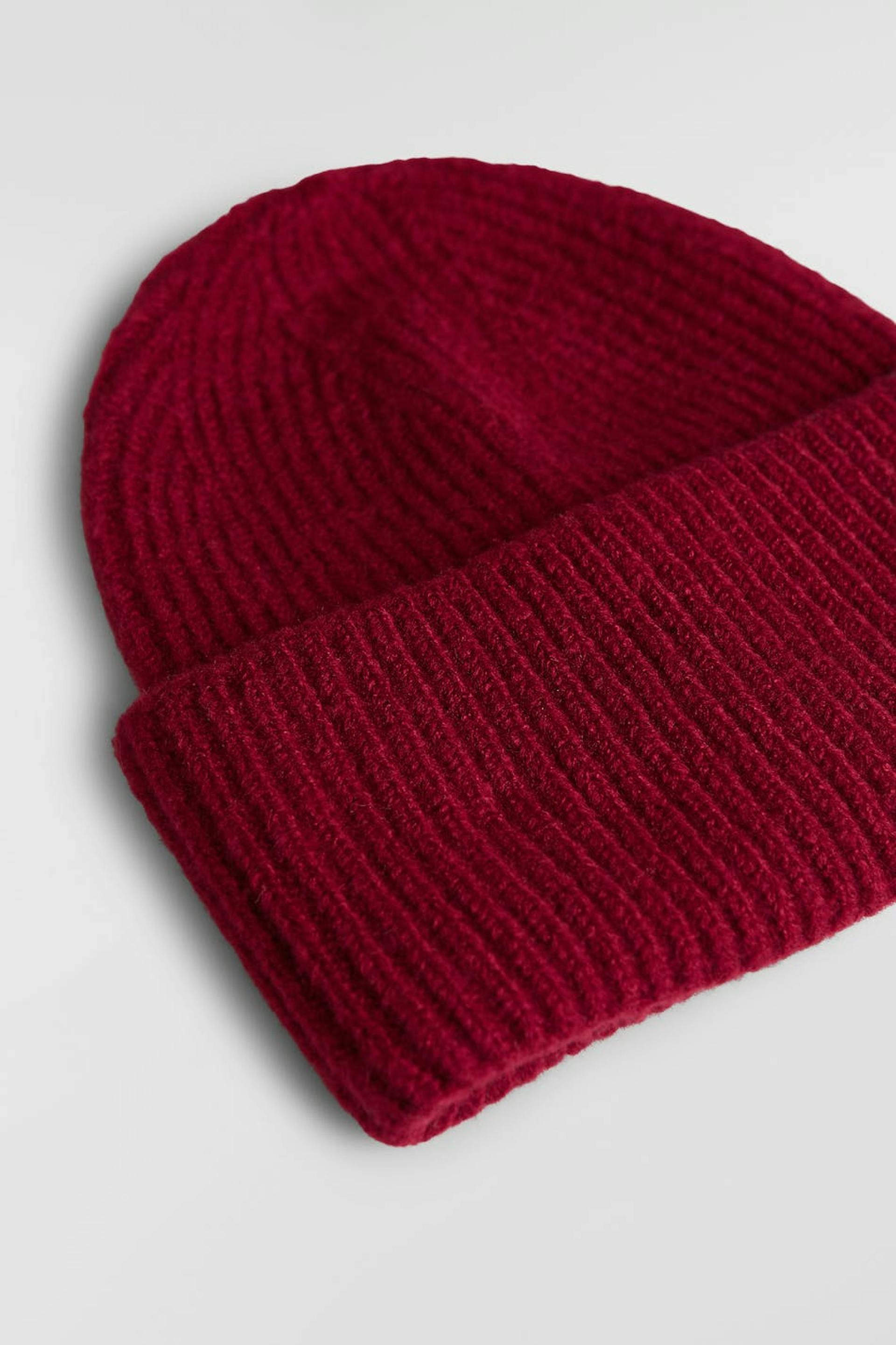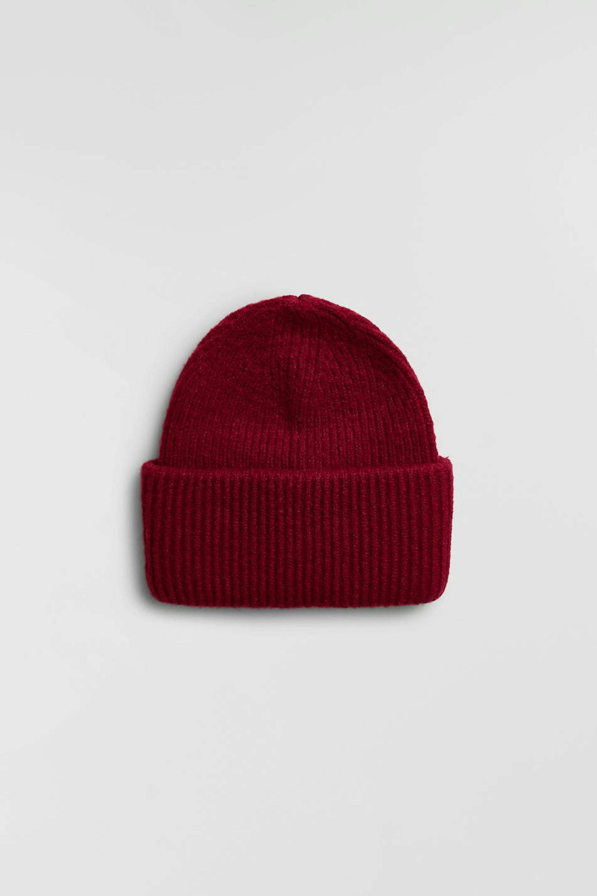 Ribbestrikket lue med en brettet kant. Lua er vinrød.