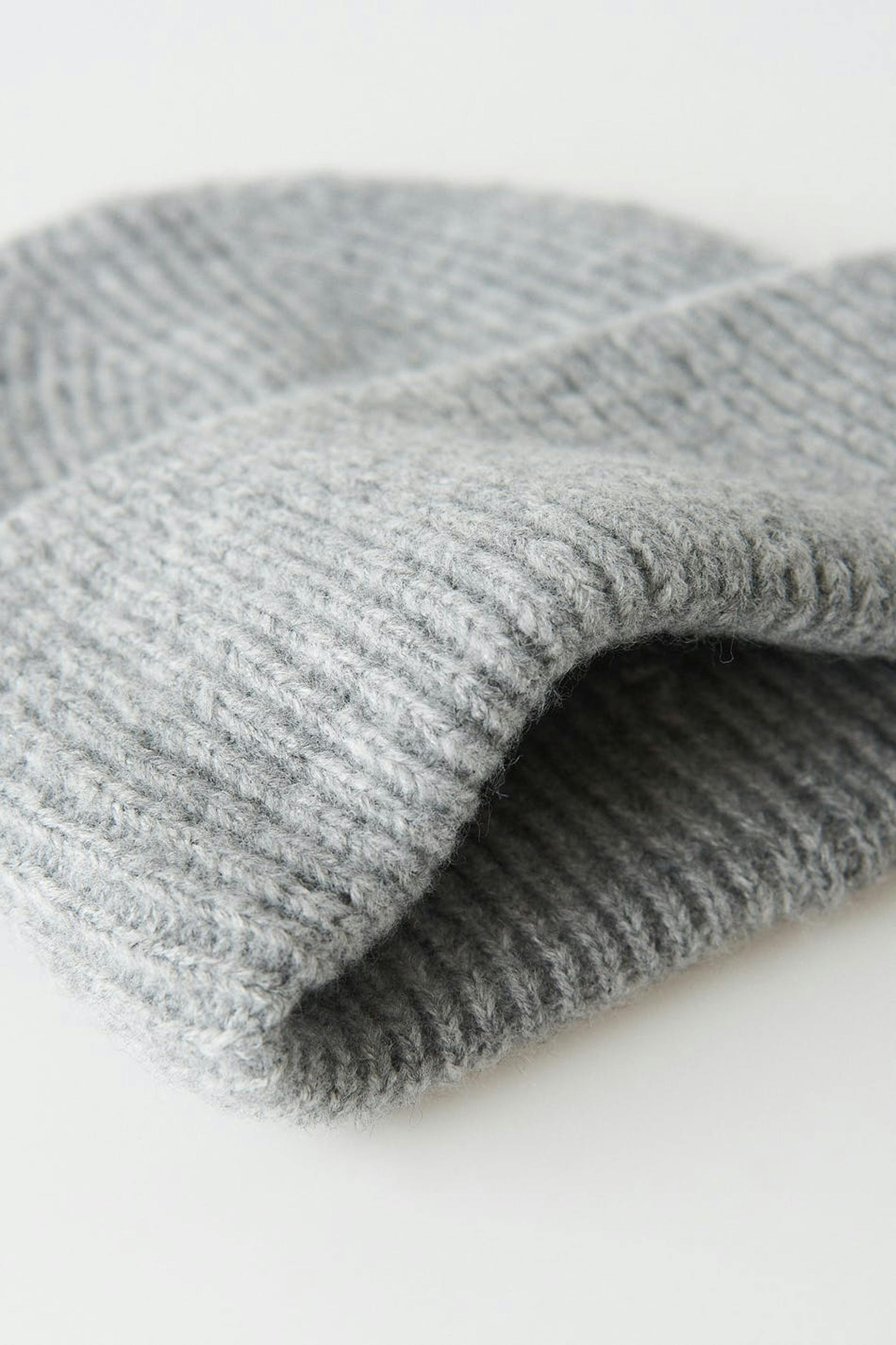 Ribbestrikket lue med brettet kant. Lua er grå og har et chunky design.