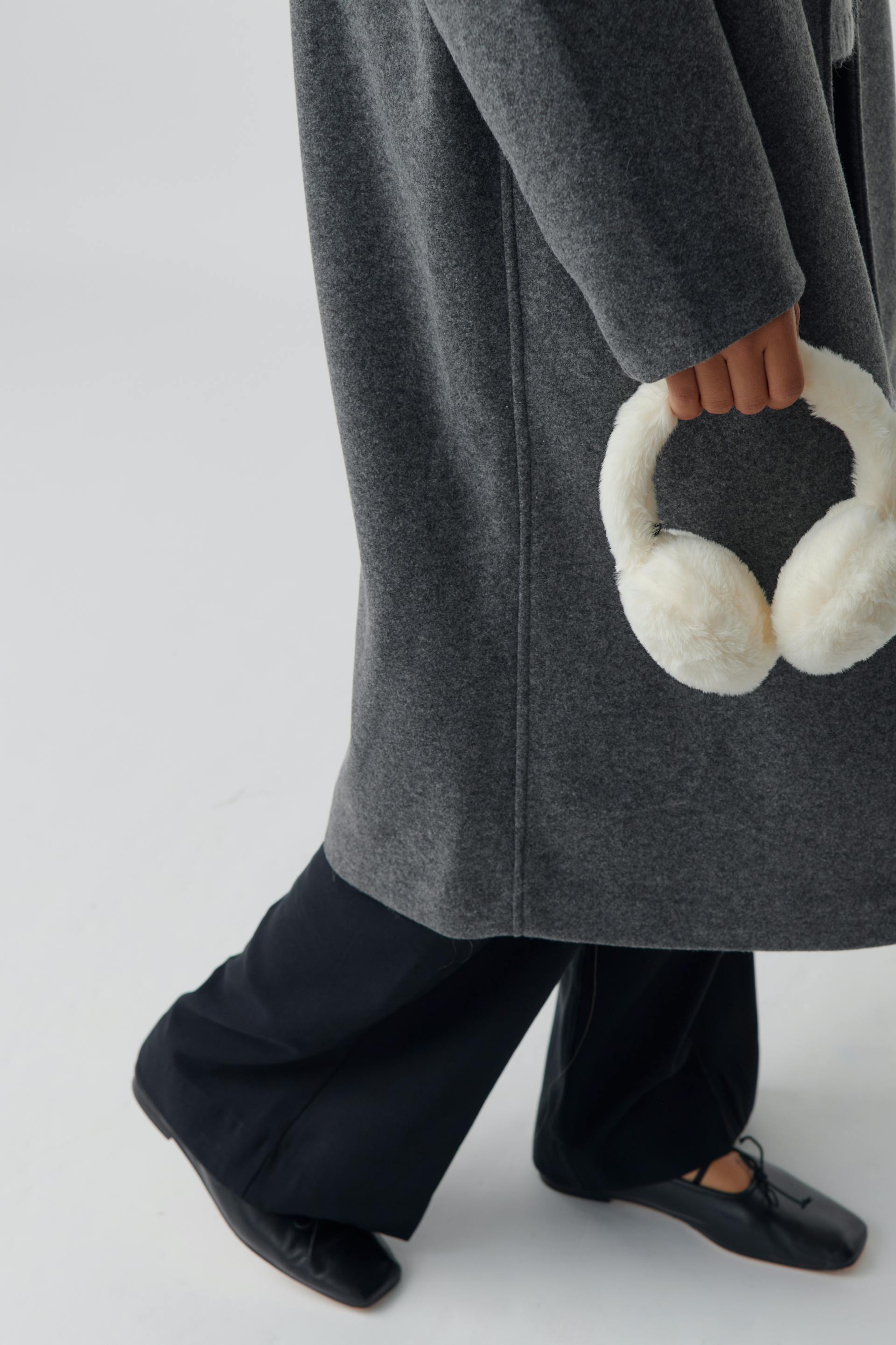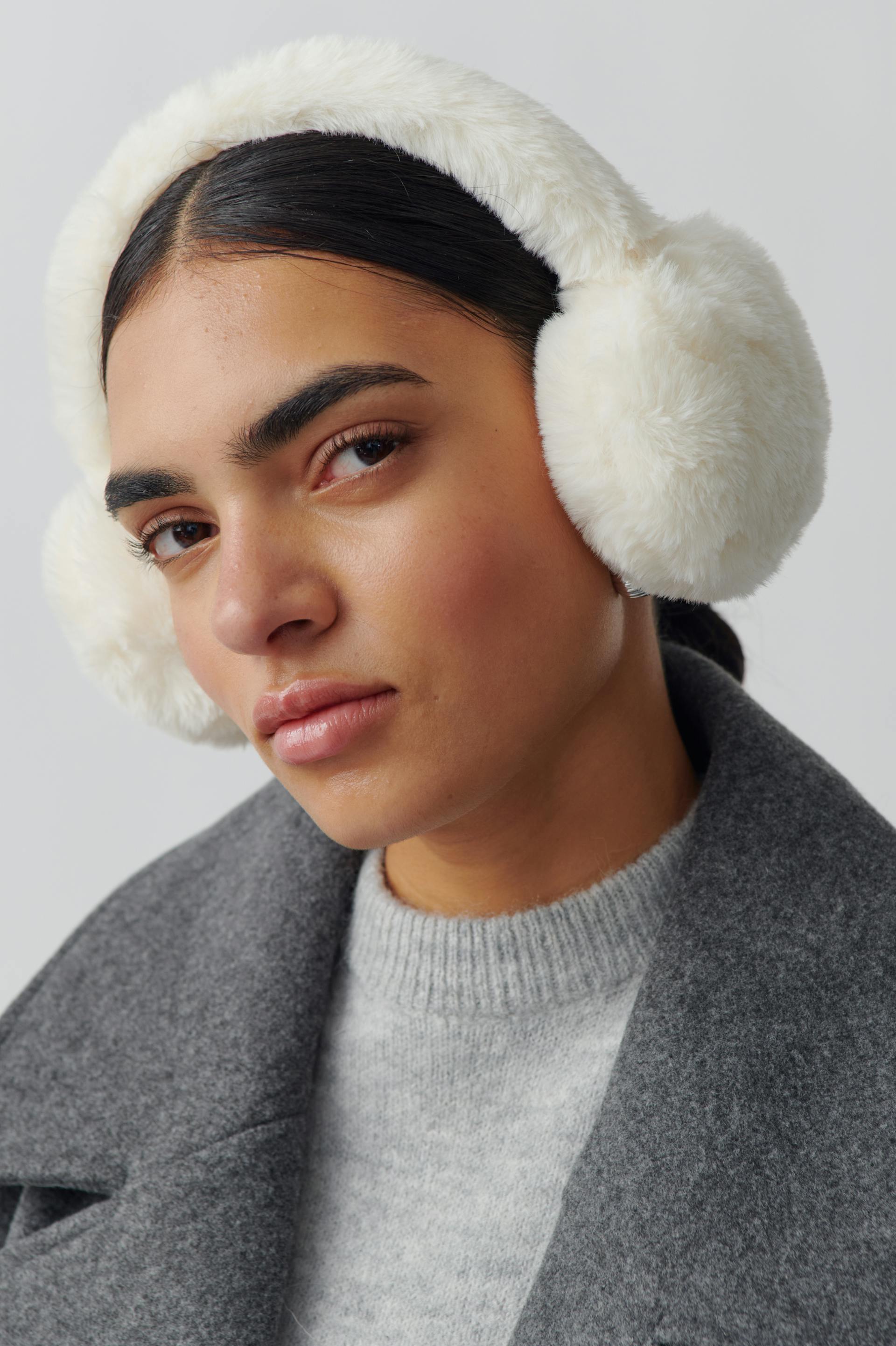 Fluffy ørevarmere i kunstig skinn. Ørevarmerene er hvite.