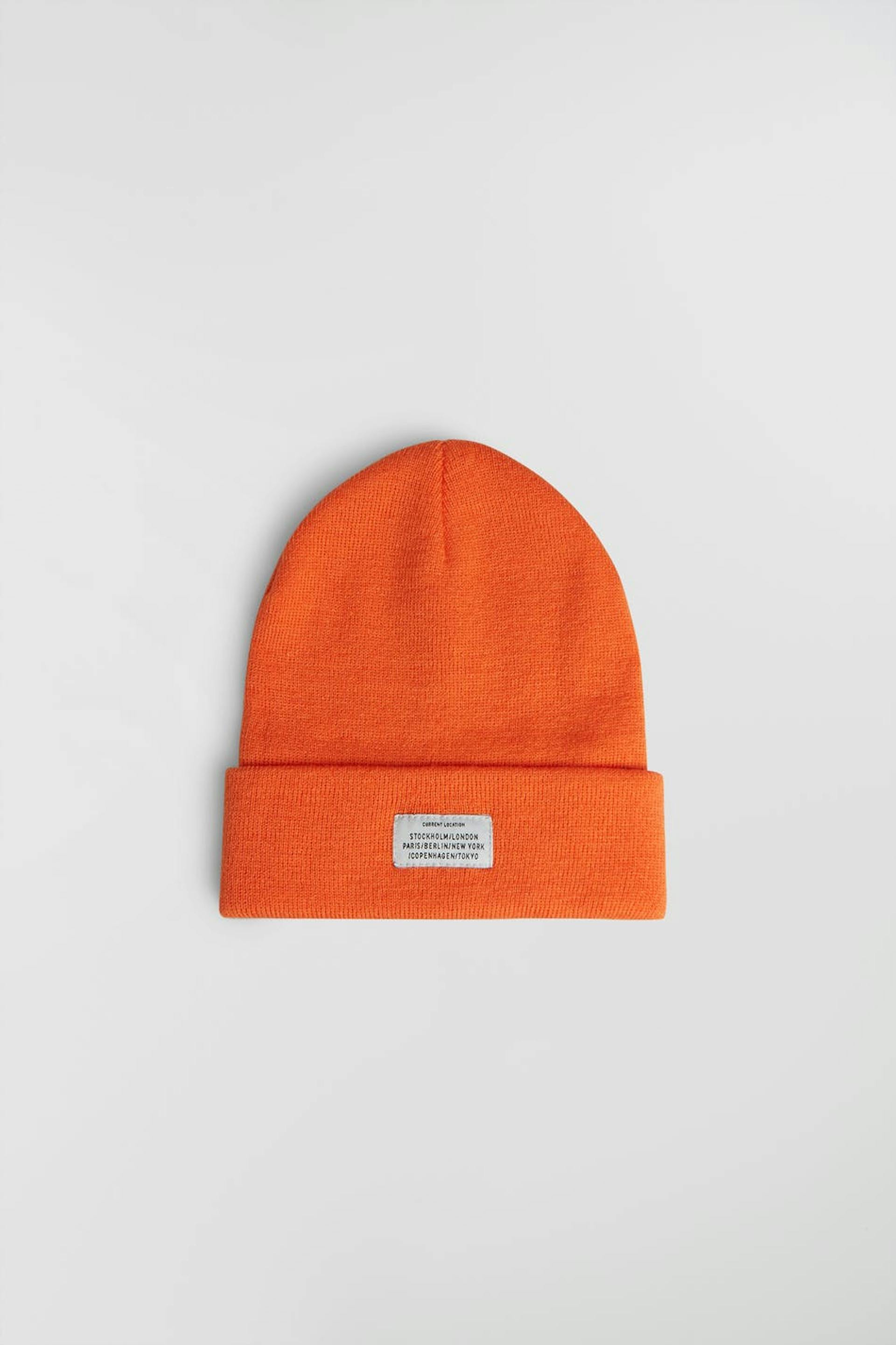 Lue med brodert tekst. Luen er oransje og har en brettet kant.