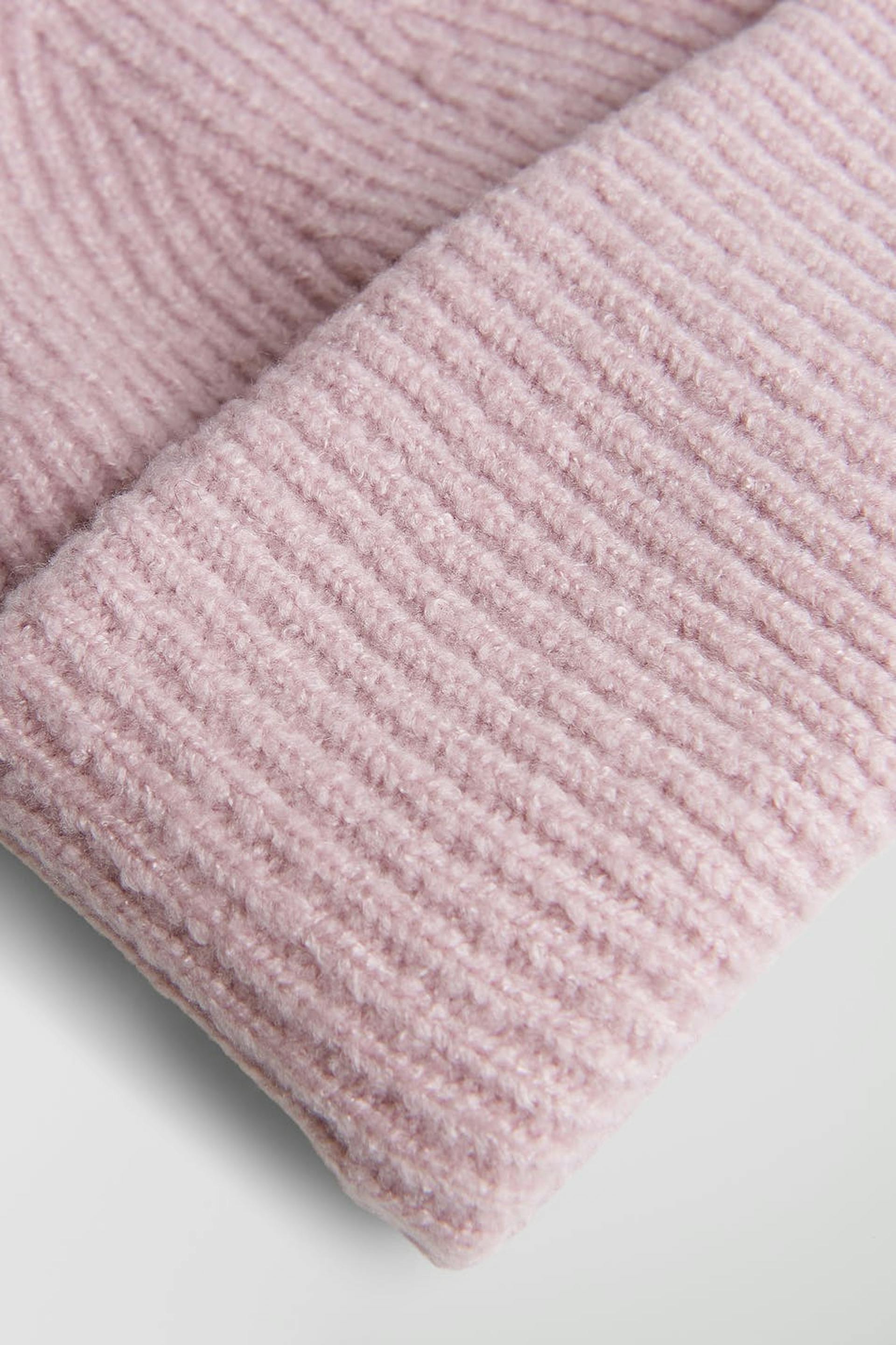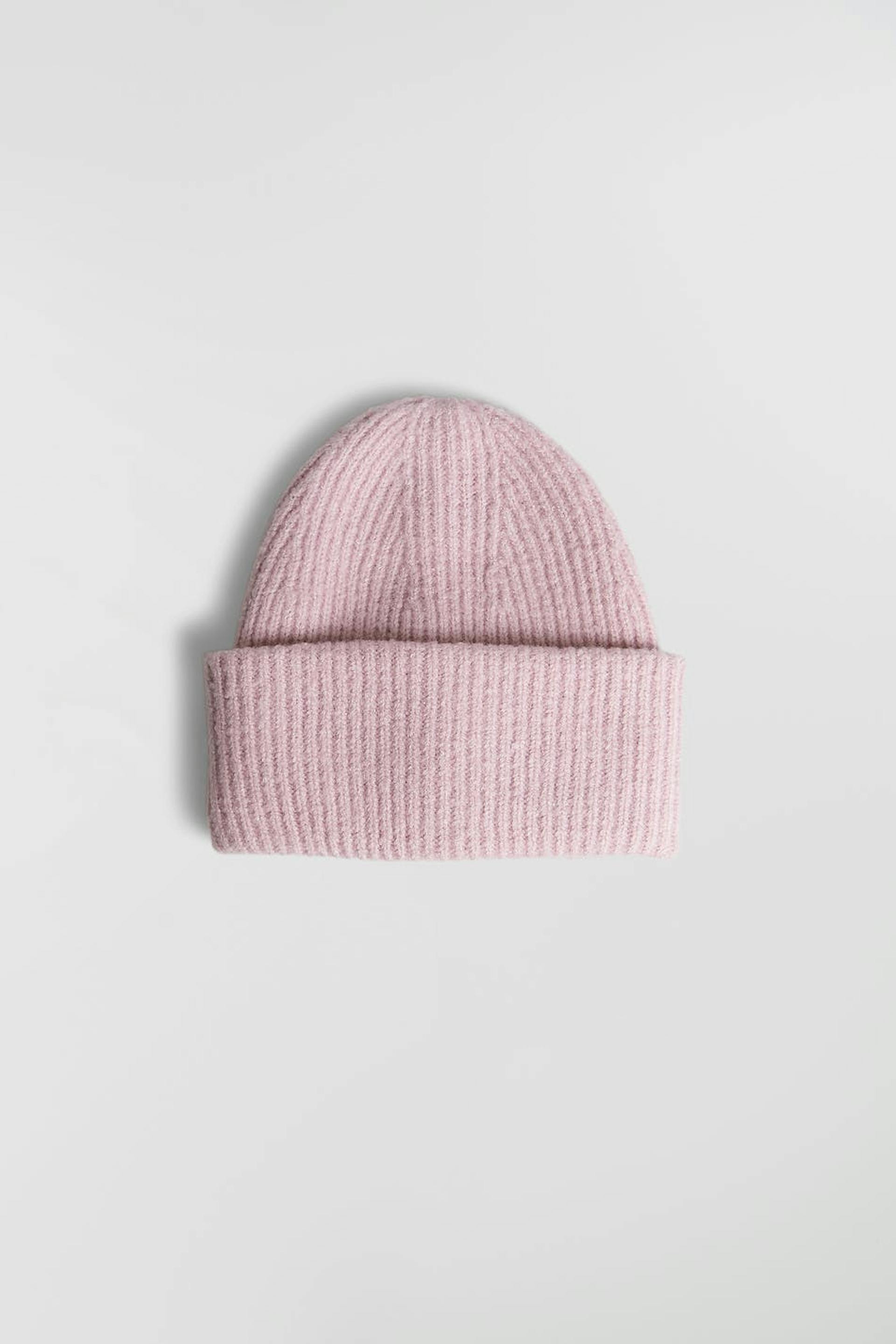 Ribbestrikket lue med brettet kant. Hatten er lavendel og rosa og har et chunky design.