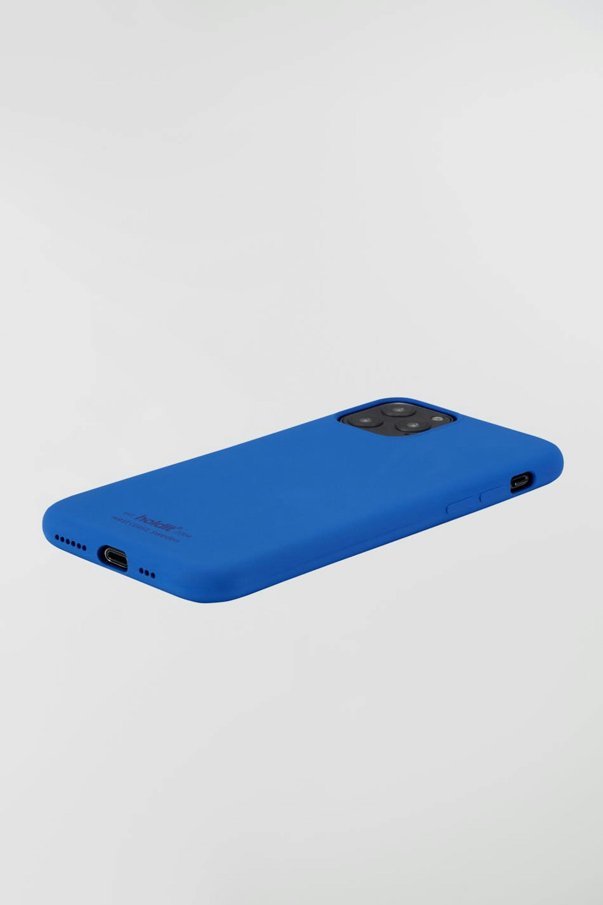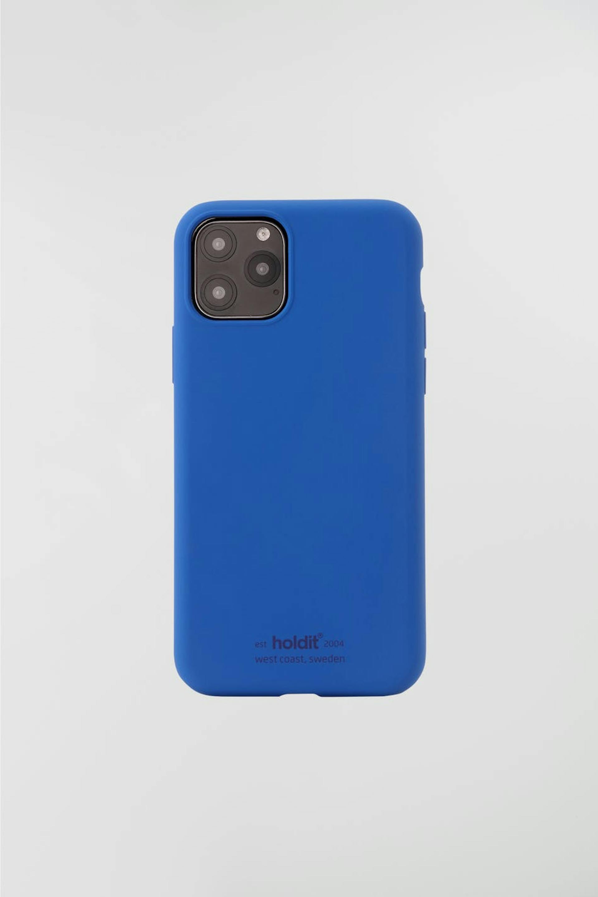 Mobildeksel fra Holdit. Mobildekslet er blå. Den er laget av silikon. iPhone 11 pro.