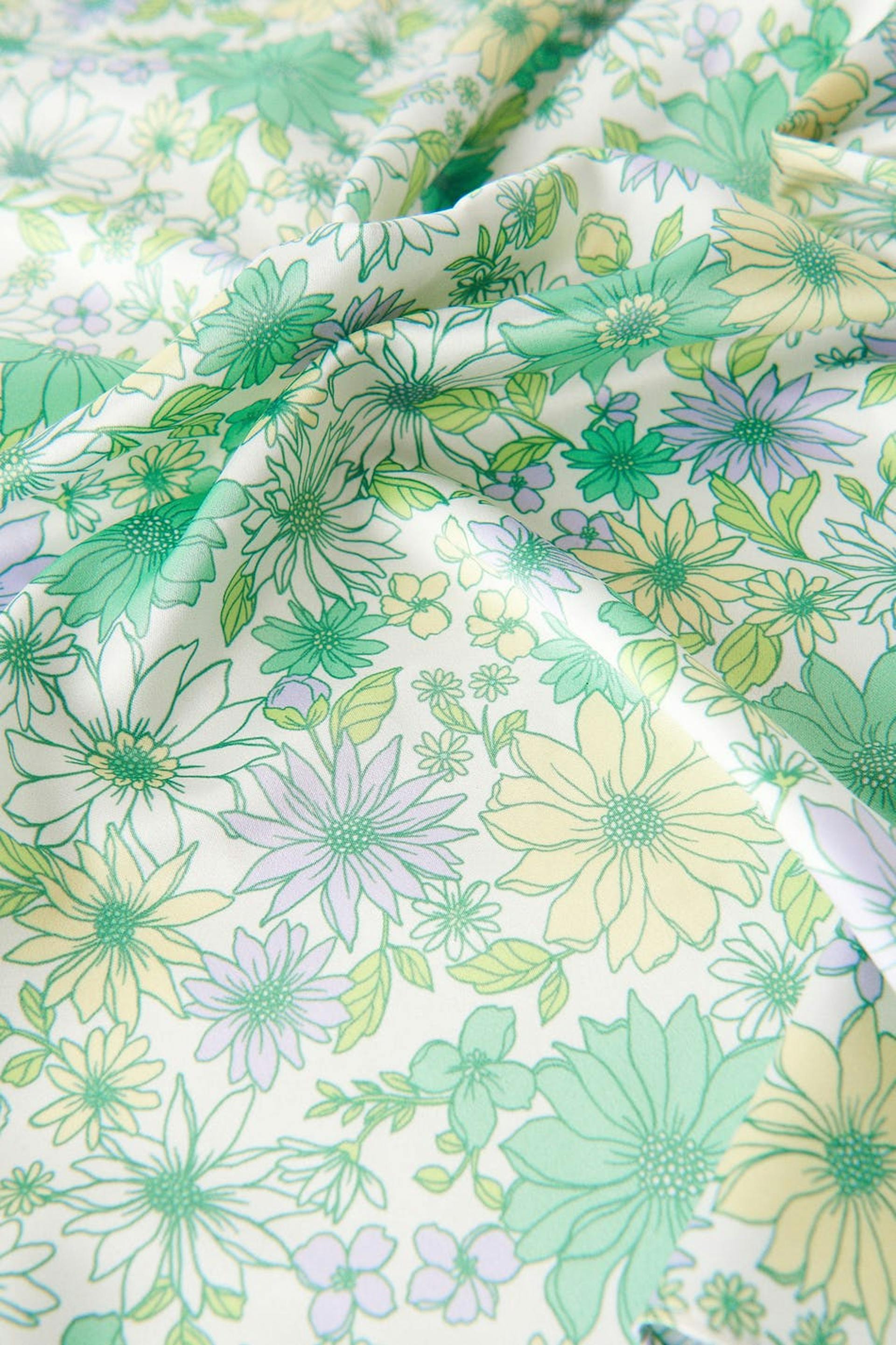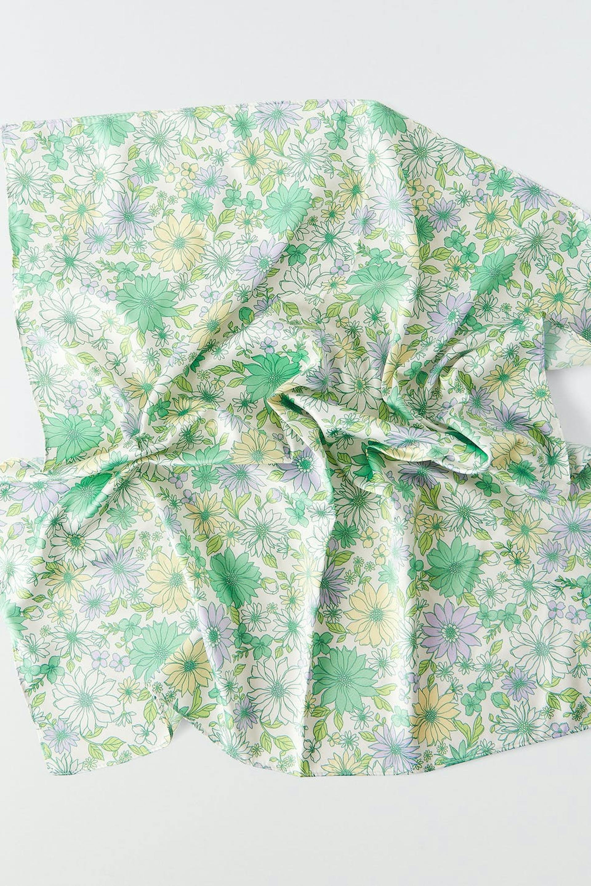 Skjerf i sateng med et blomstret mønster. Skjerfet er grønn.