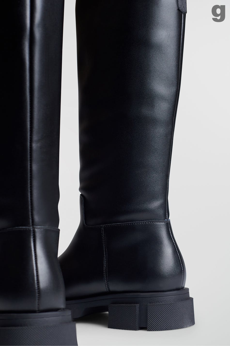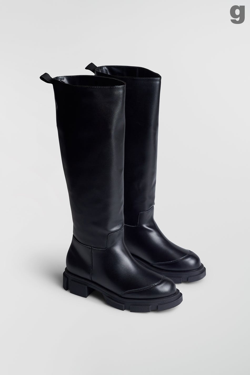 Knehøye boots med et chunky design. Bootsene er svarte og har tykke såler.