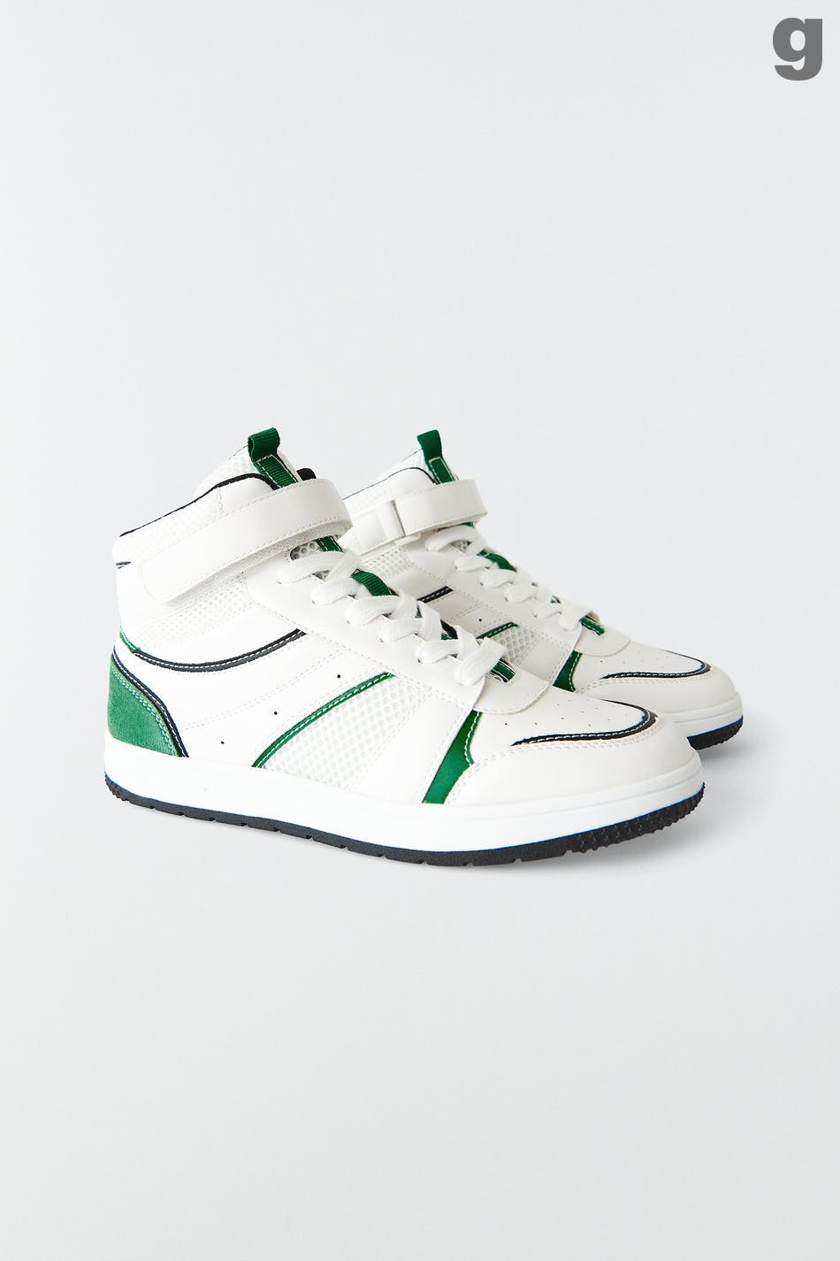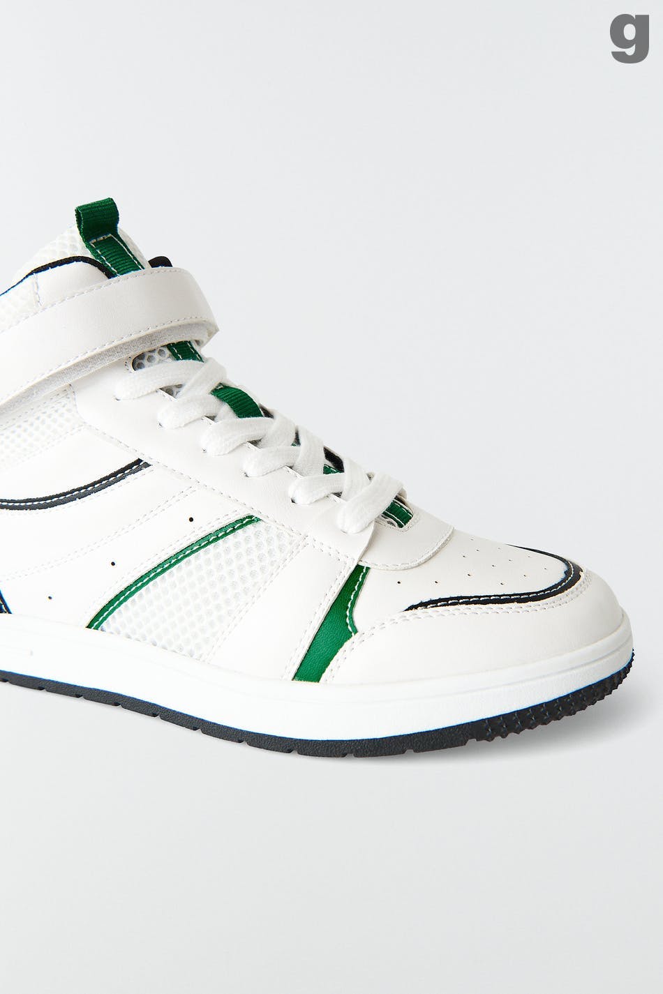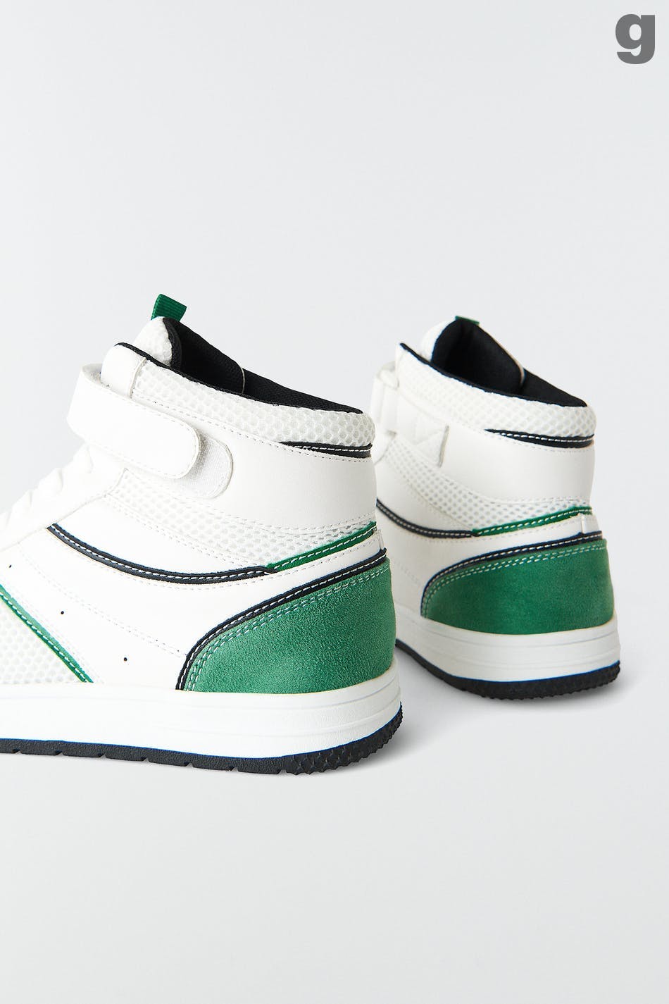 Retro joggesko med snøring. Joggeskoene er grønne og har høyt skaft med borrelåsfeste. De har rund tå og lav såle.