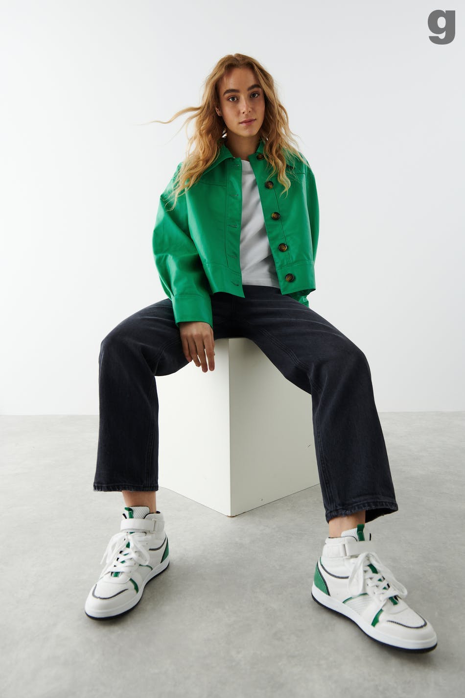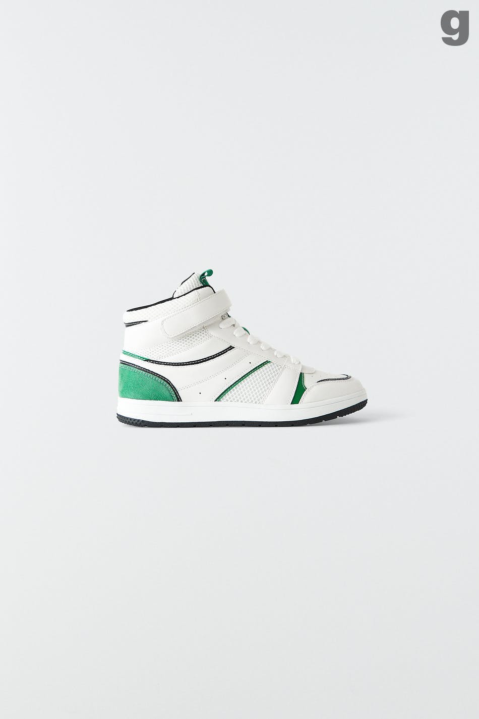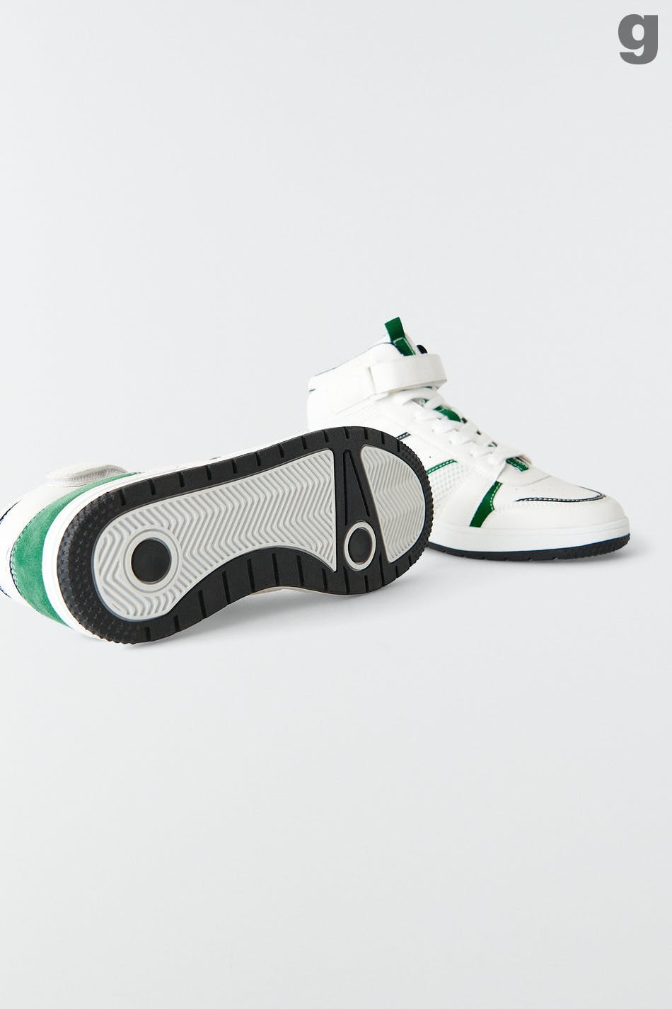 Retro joggesko med snøring. Joggeskoene er grønne og har høyt skaft med borrelåsfeste. De har rund tå og lav såle.