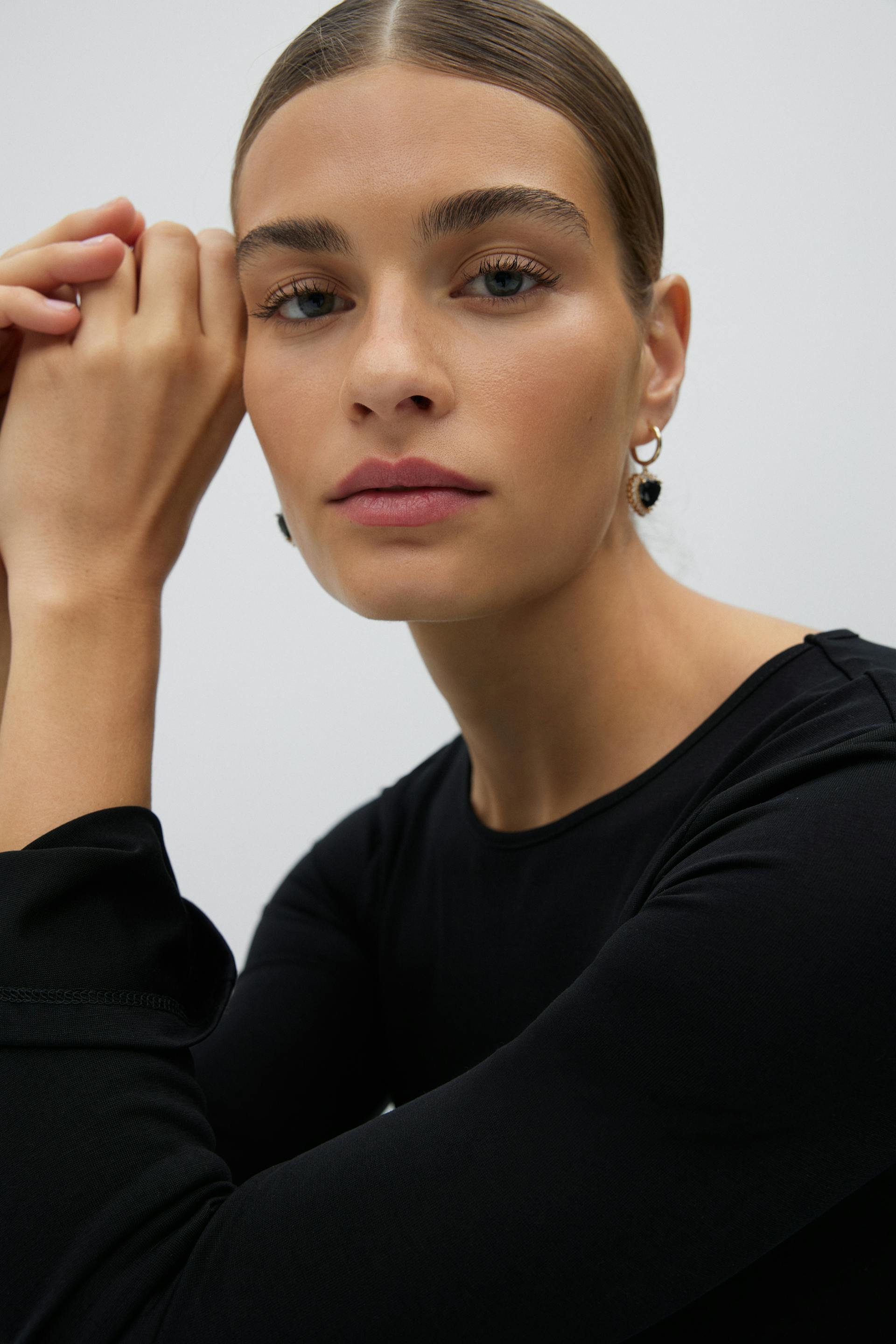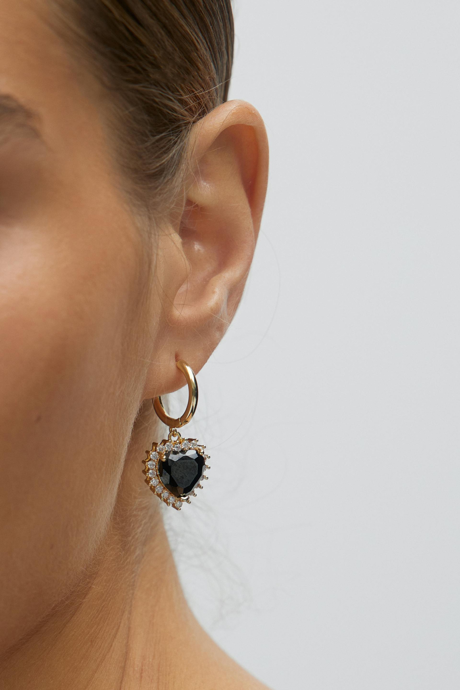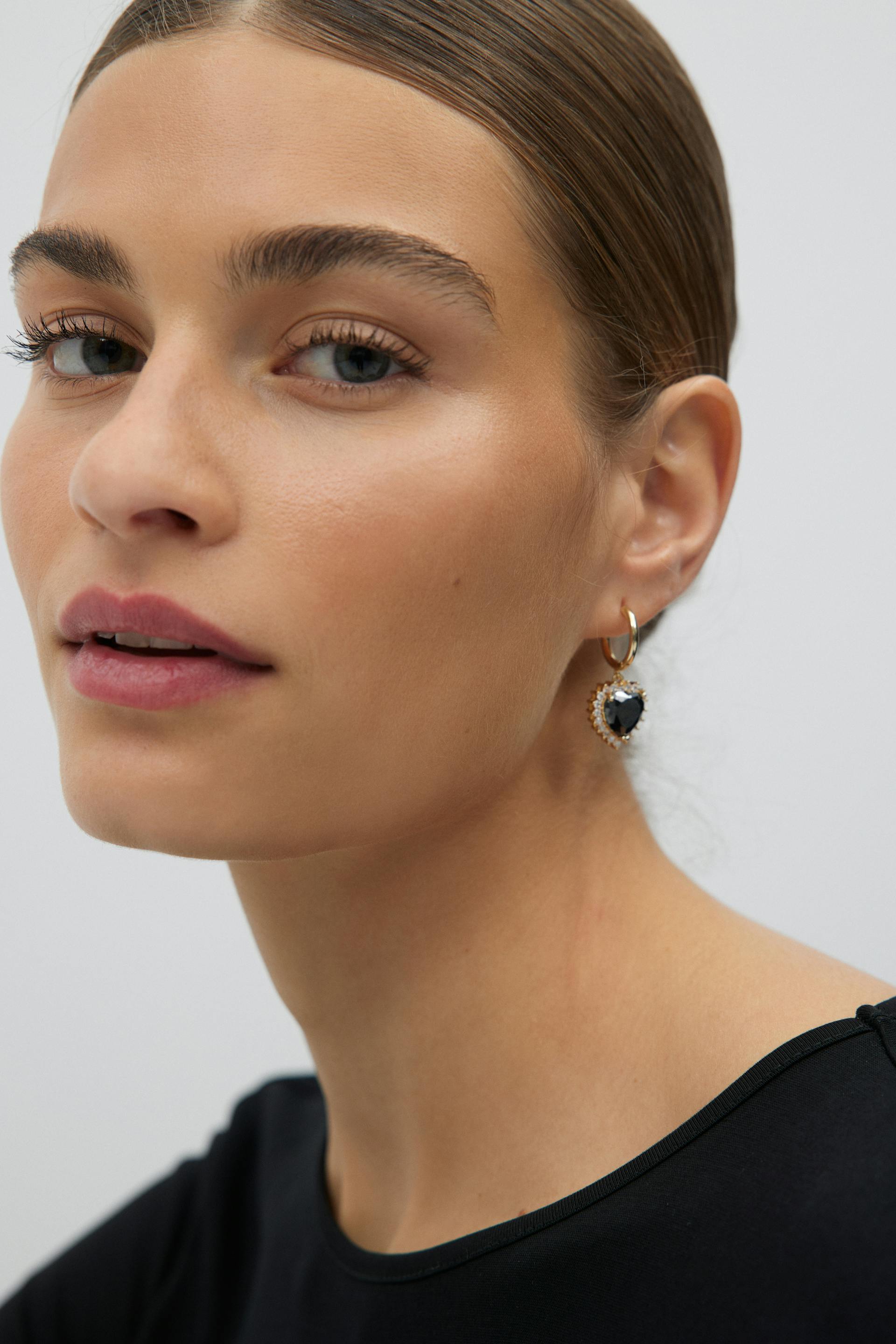 Hjerteformede øreringer med steiner. Øreringene er gullfargede og har rhinestone-detaljer.