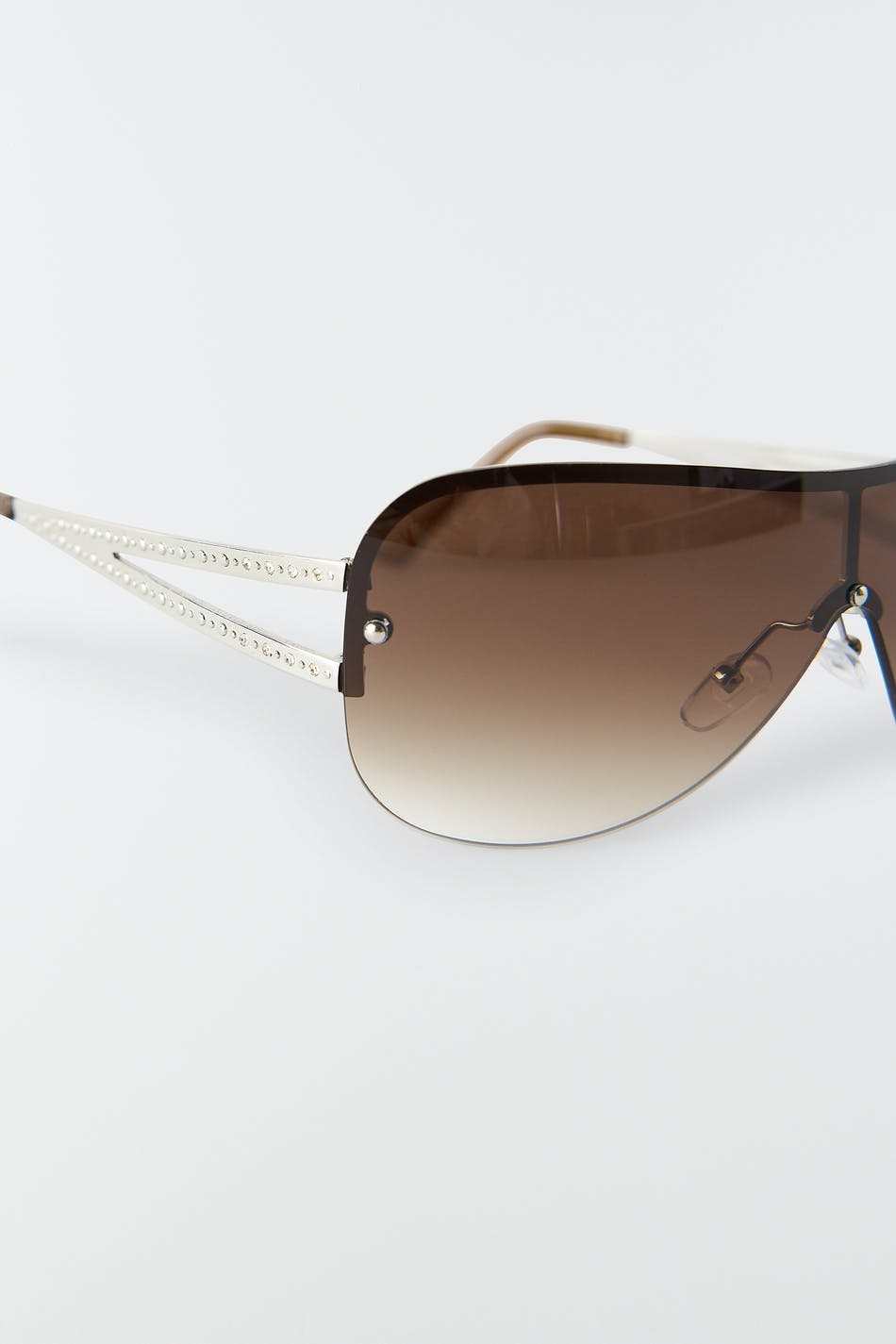 Futuristiske solbrille med en ramme av plastikk. Solbrillen er brun og har en kattøye-design.