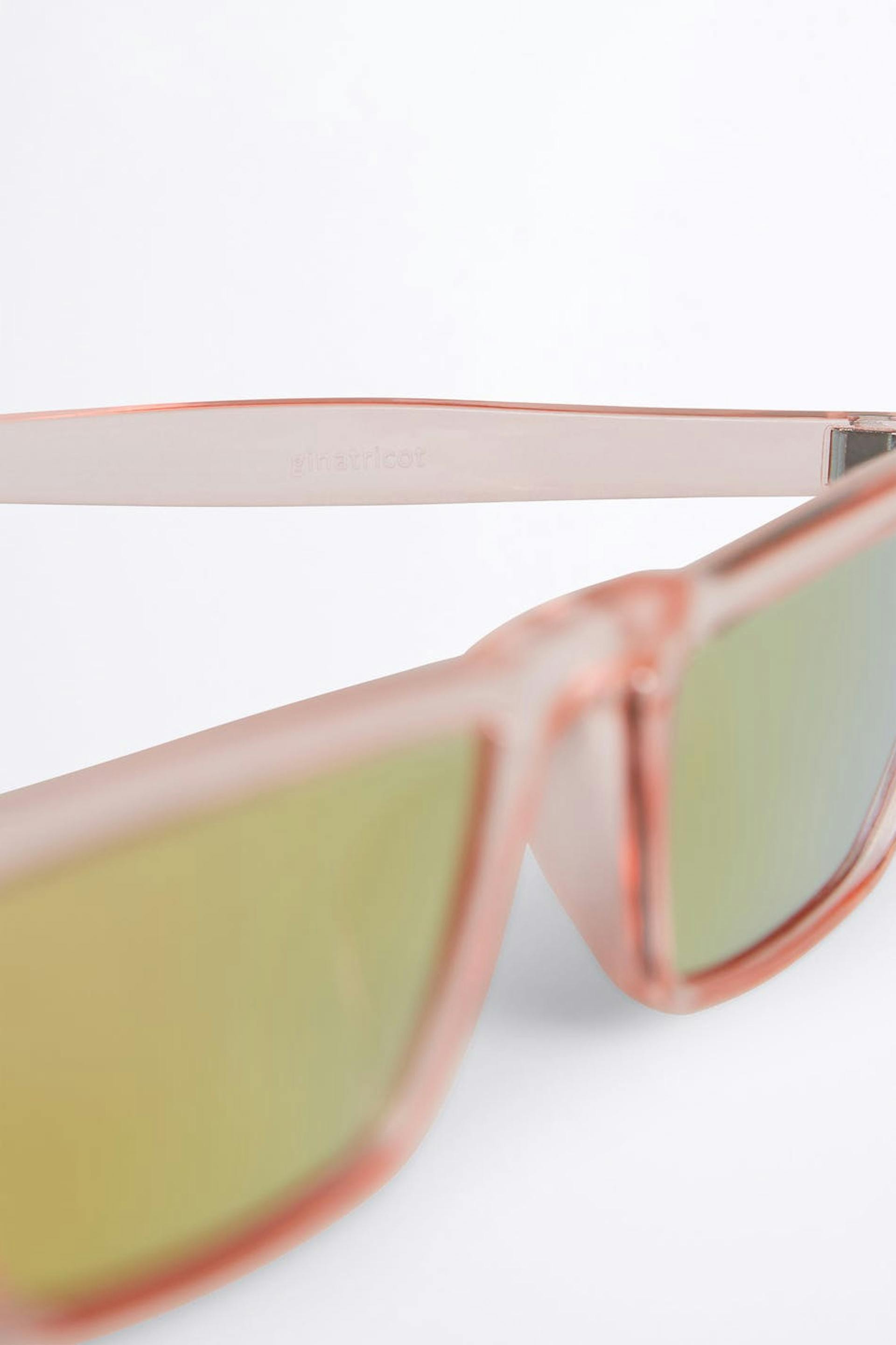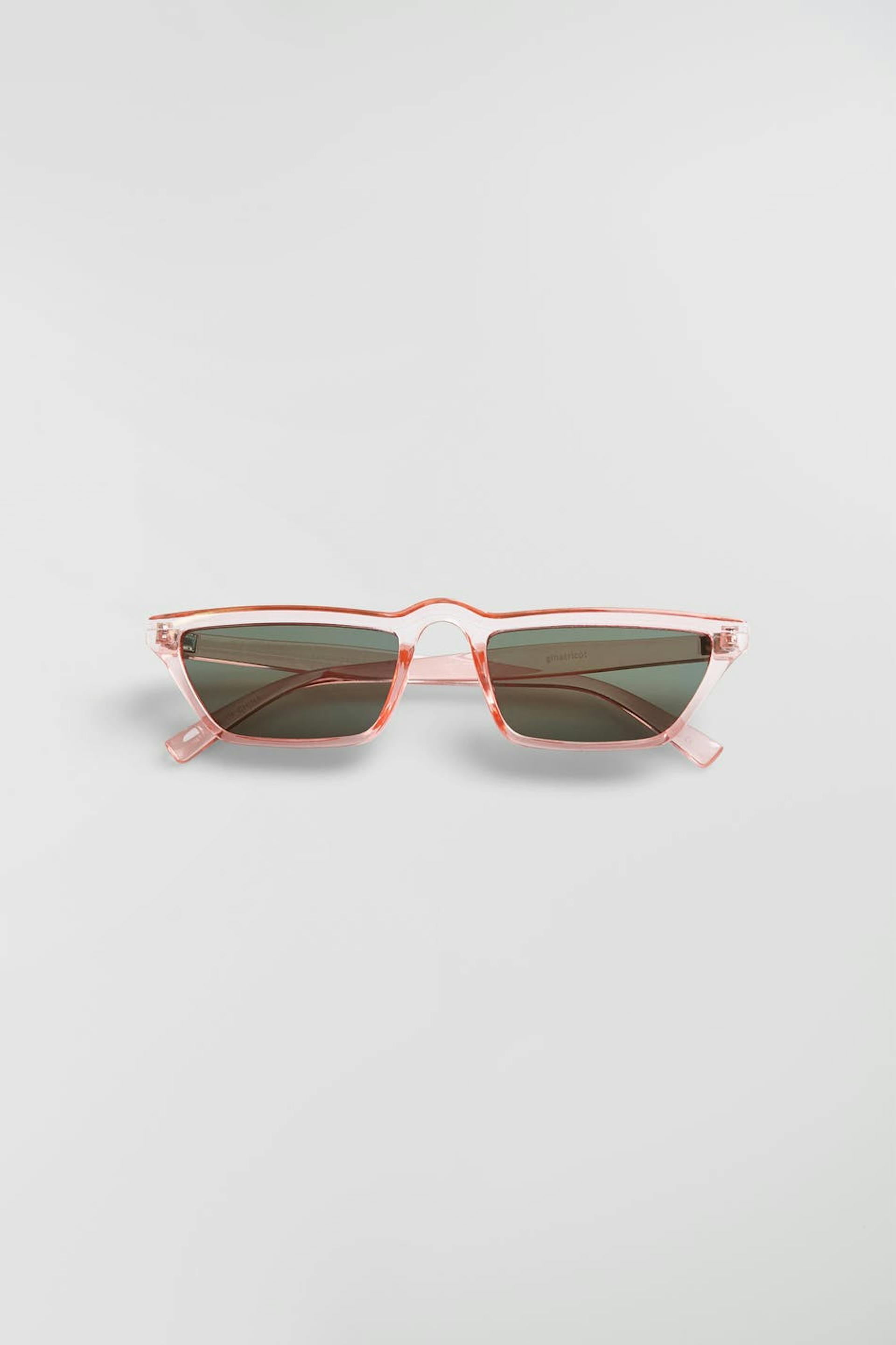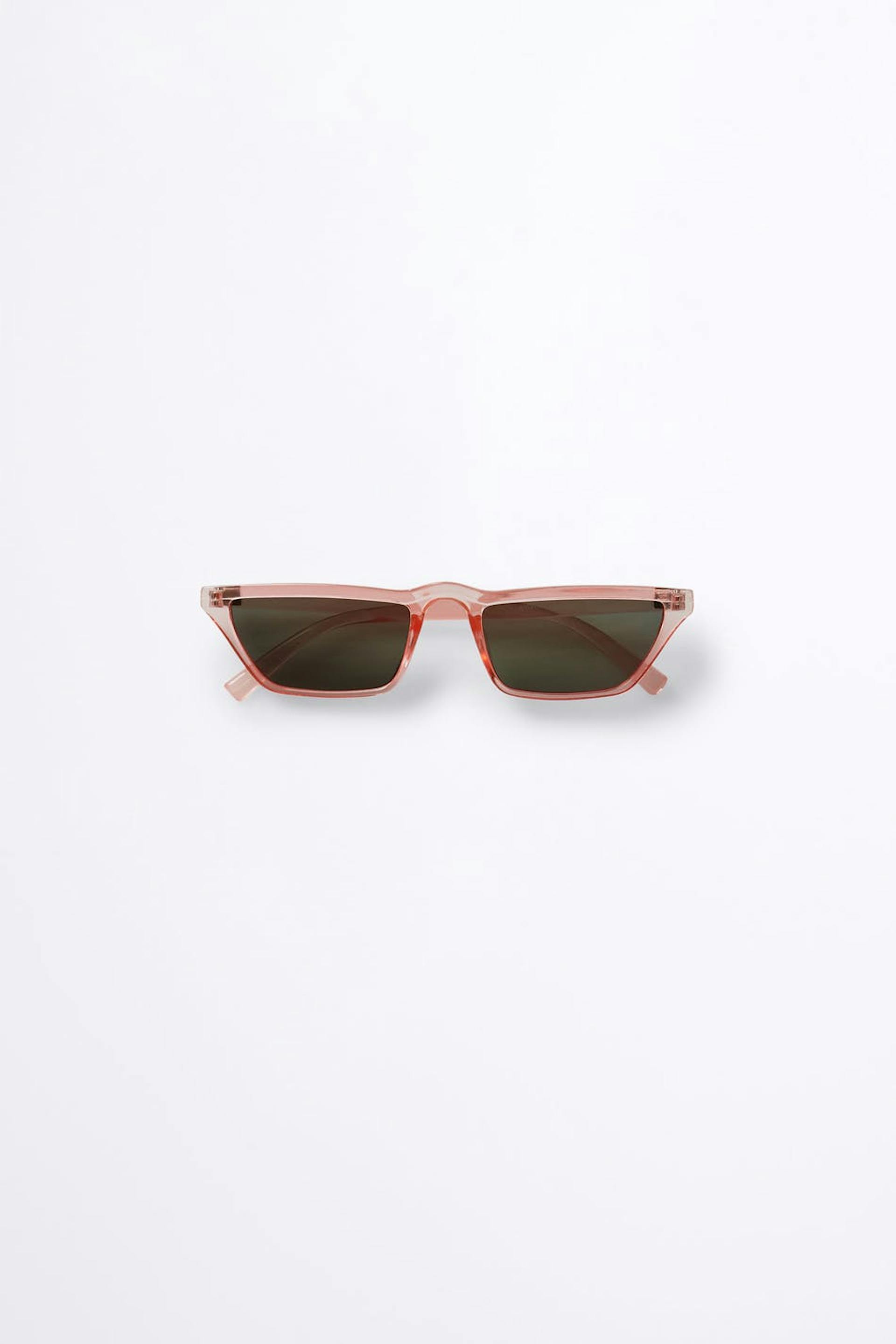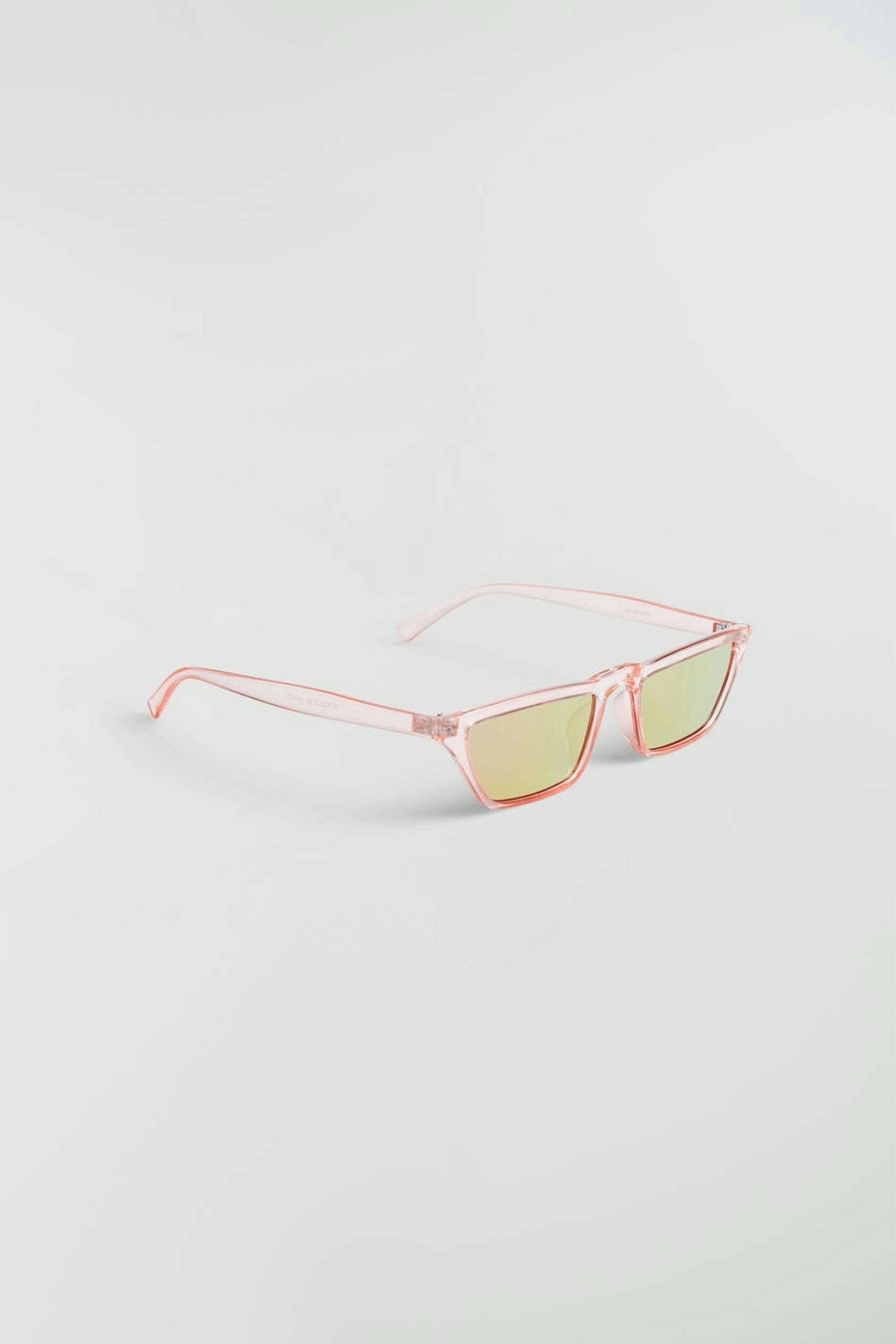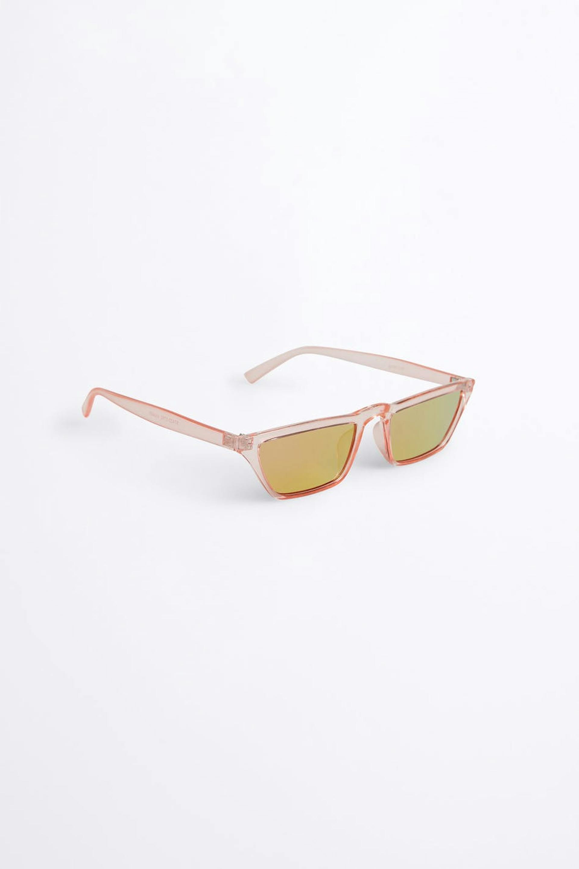 Vinklet solbriller. Solbrillene er rosa. De er laget av plast.