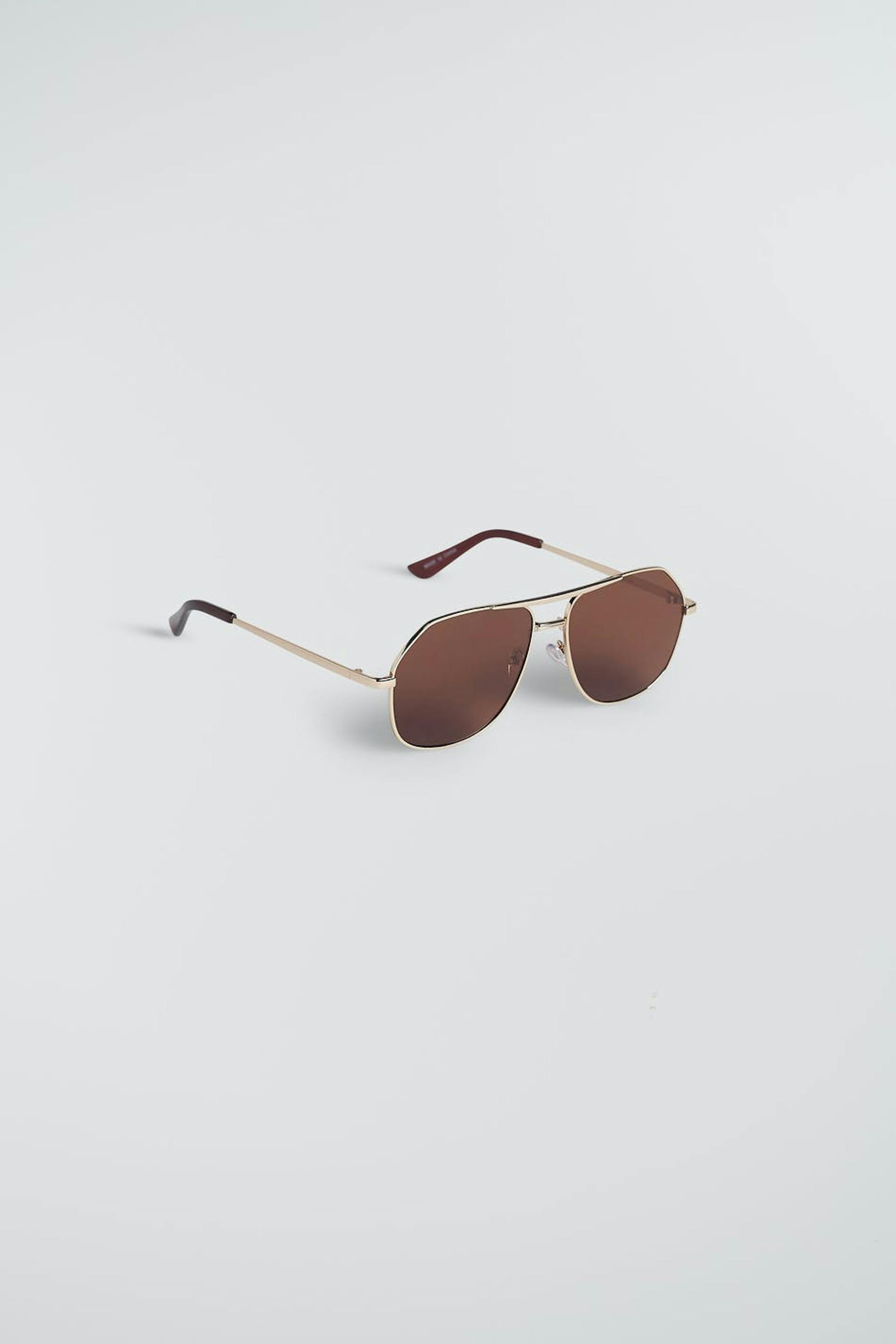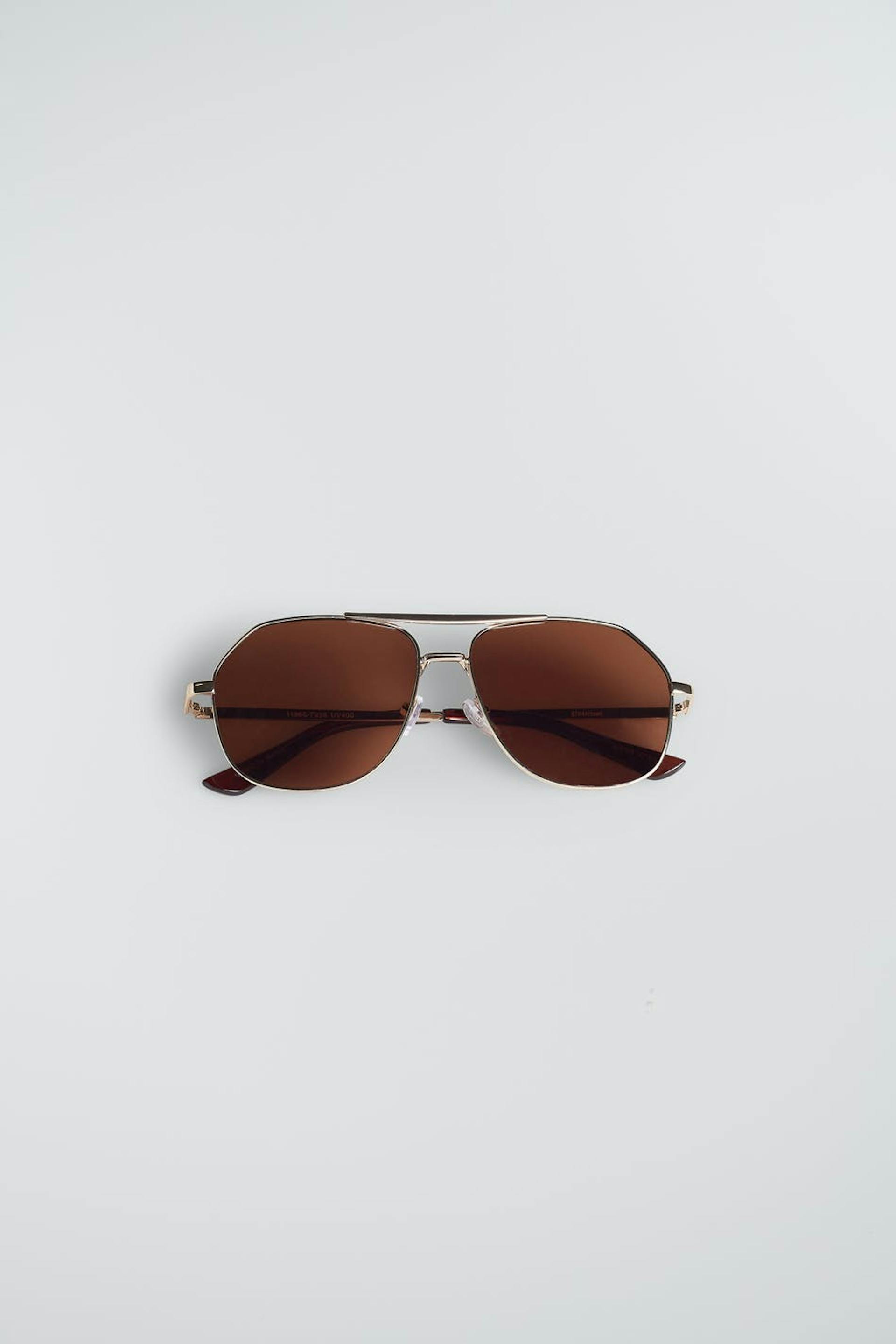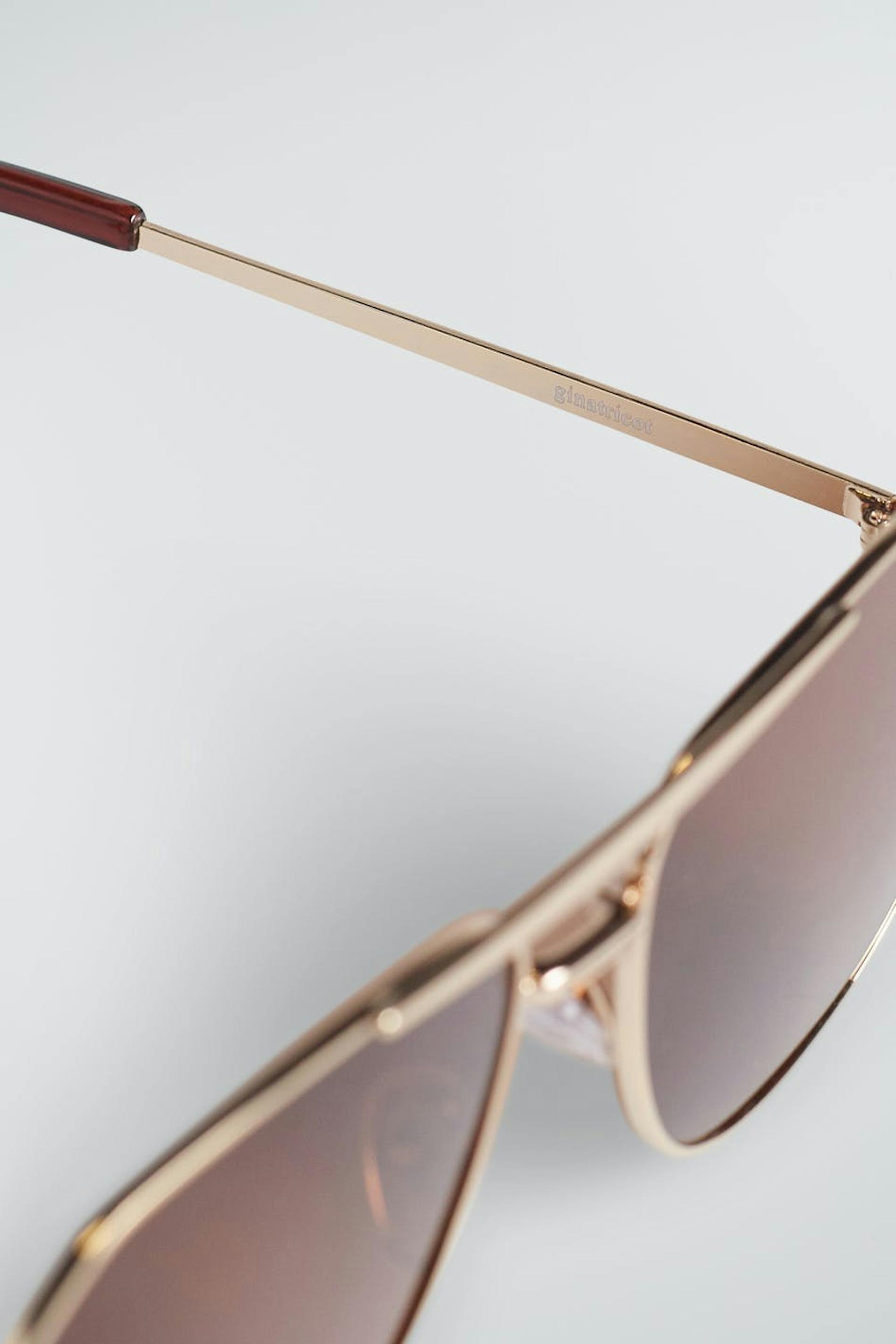 Pilotsolbriller med en ramme i metall. Solbrillene er brune.