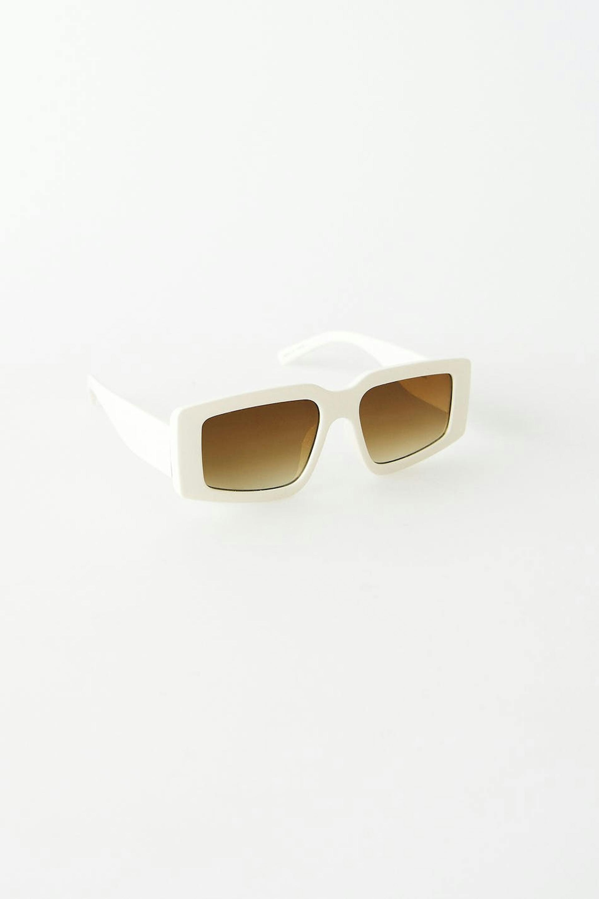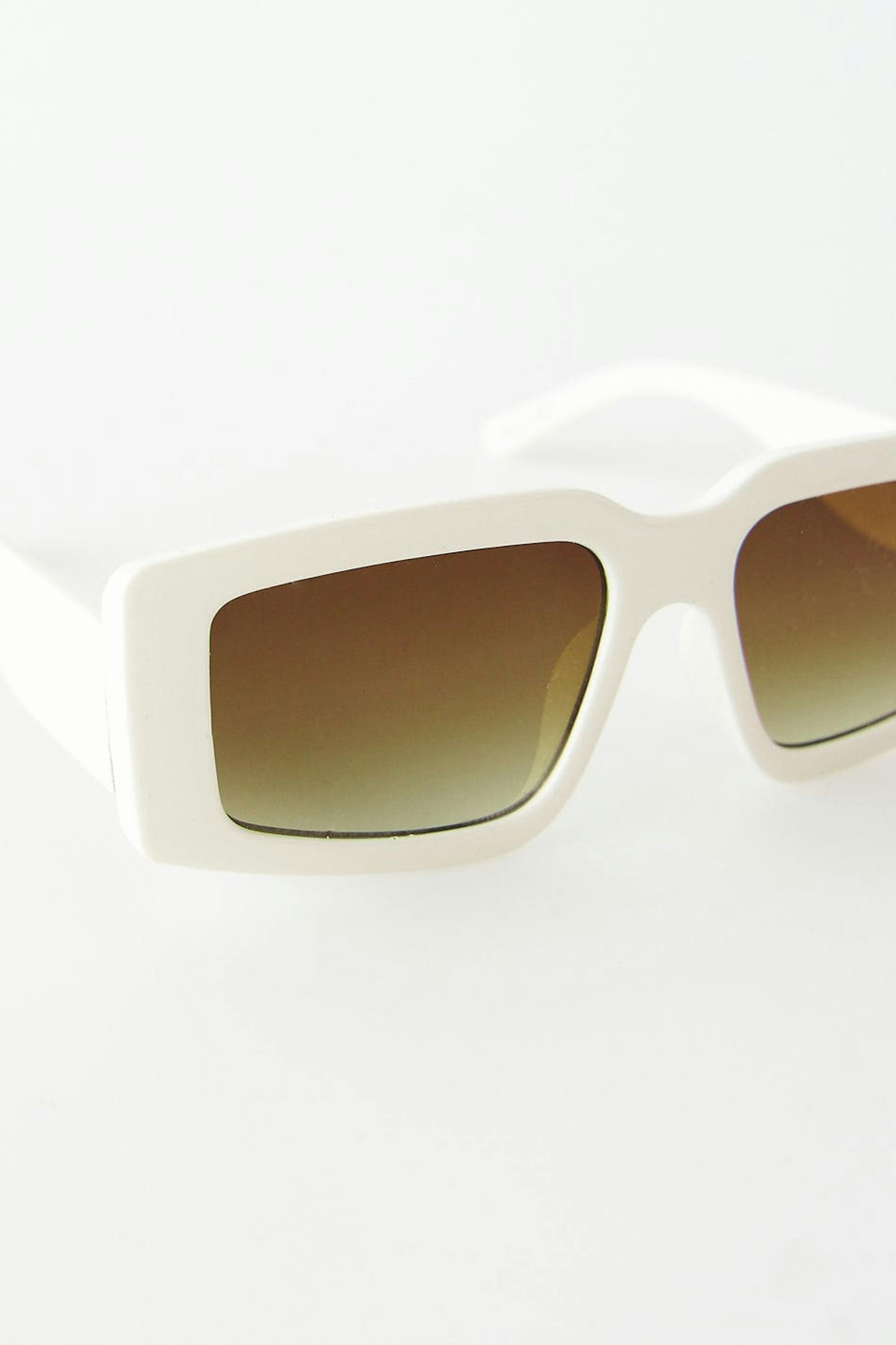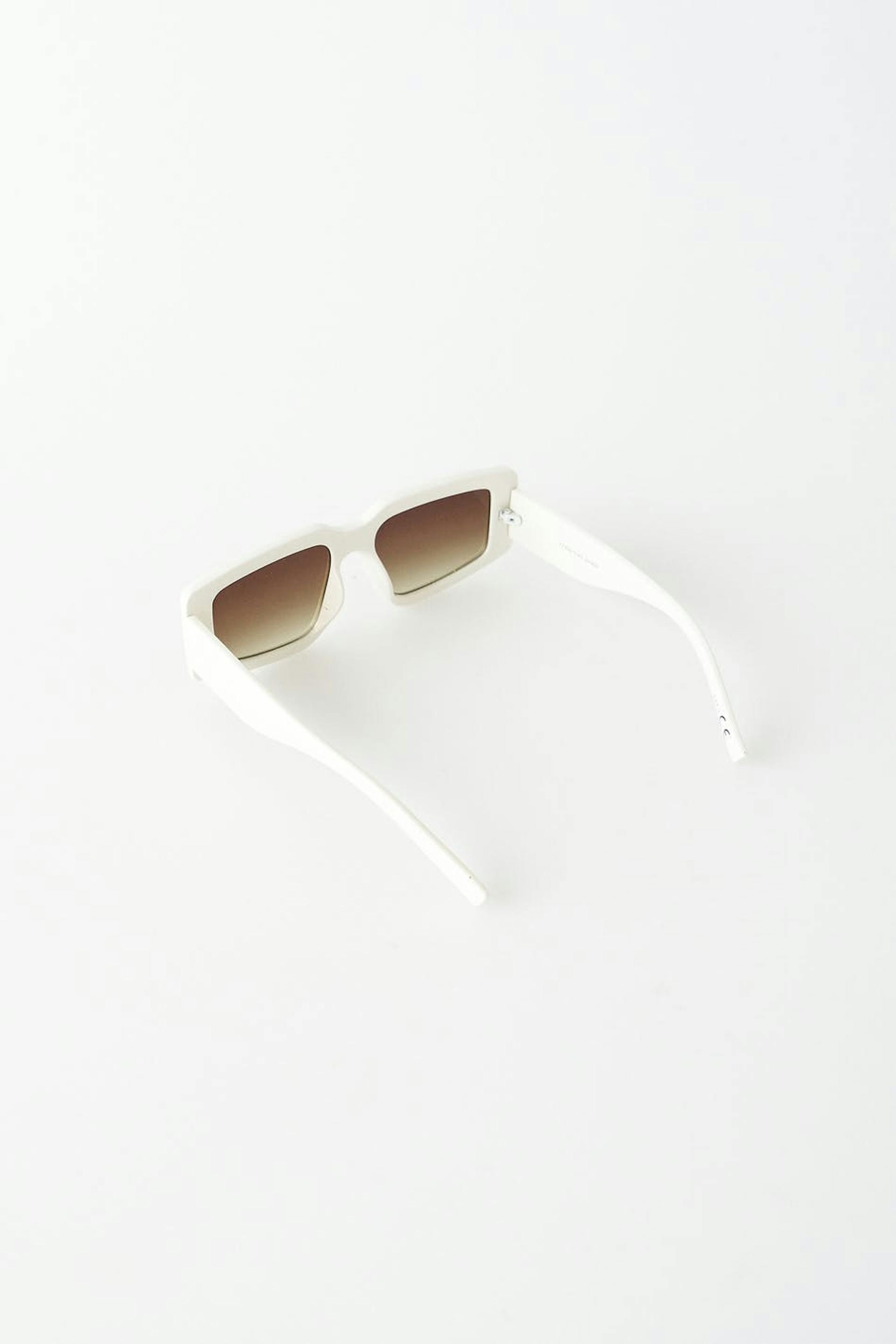 Rektangulær solbrille med ei ramme i plast. Solbrillen er hvit og har fargede glass.