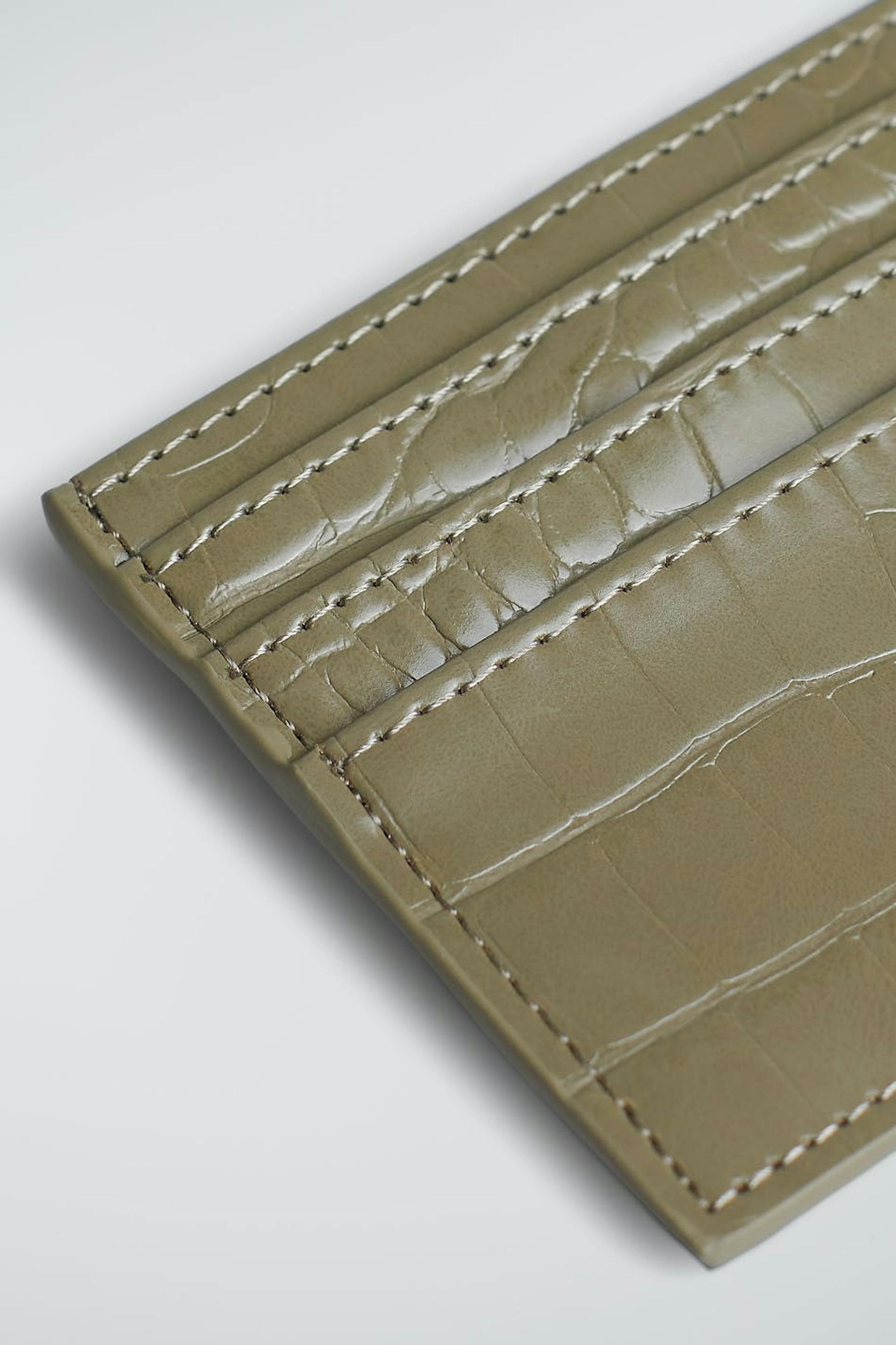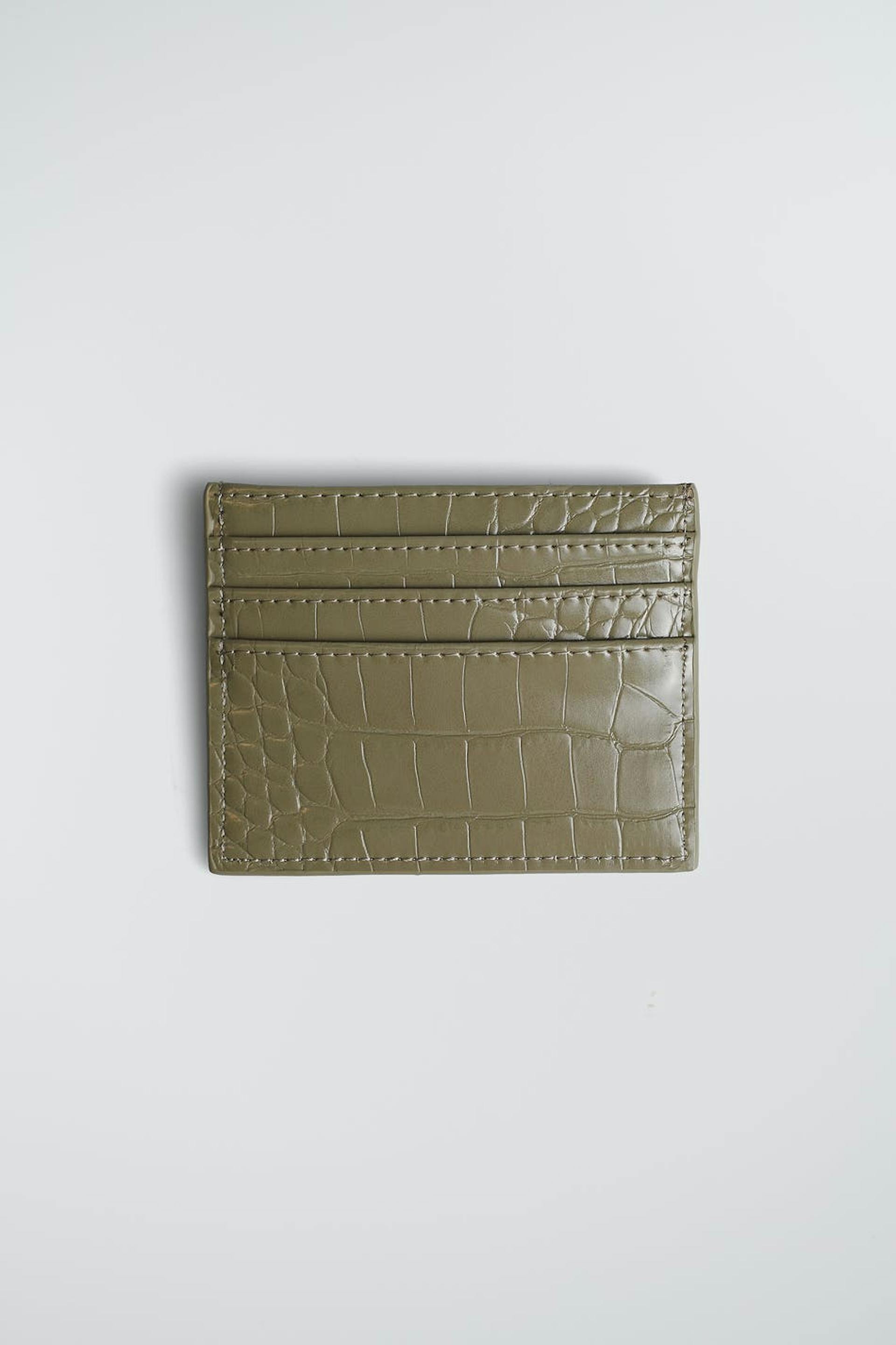 Kortholder med et krokodillemønster og flertallige beholdere. Kortholderen er grønn.