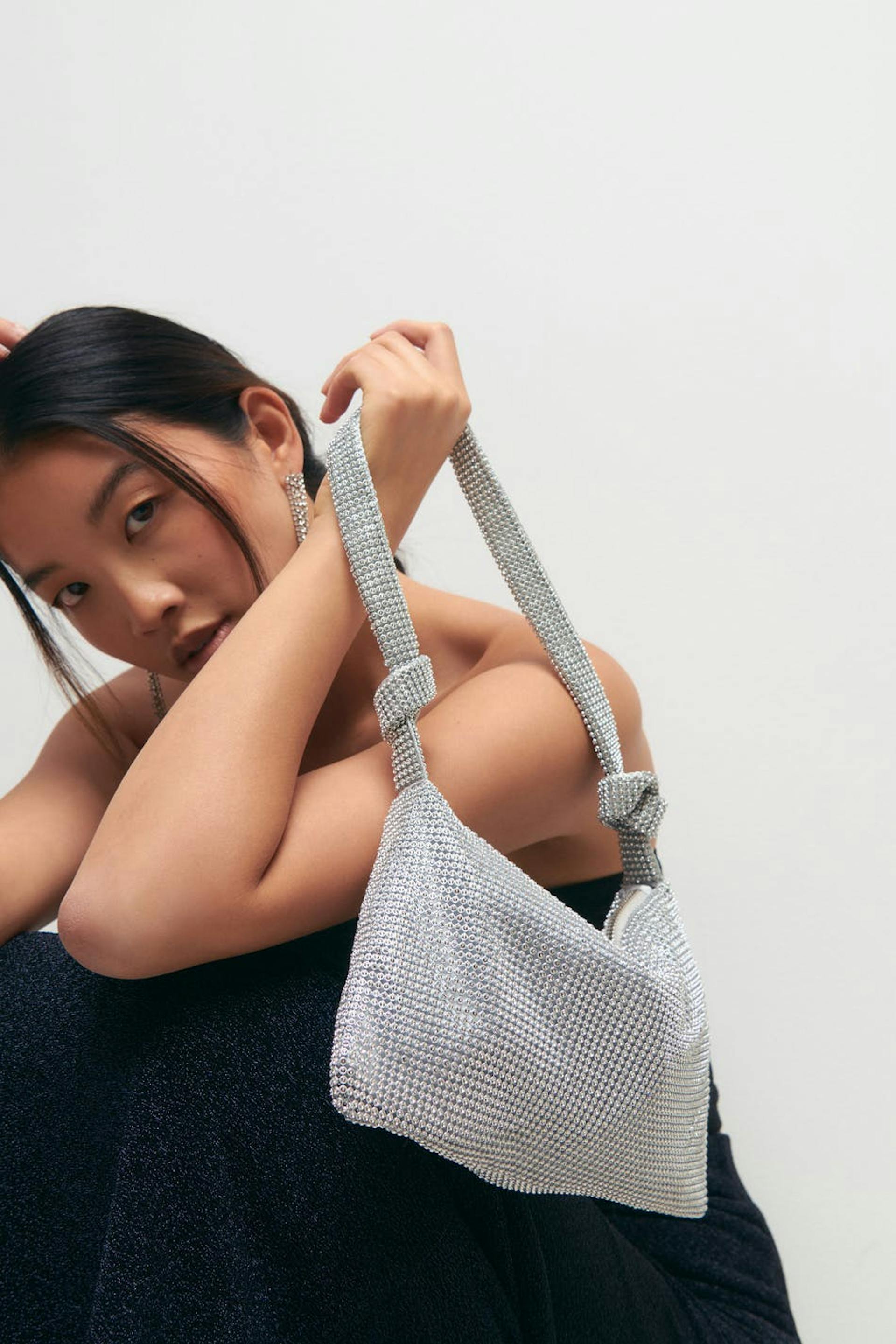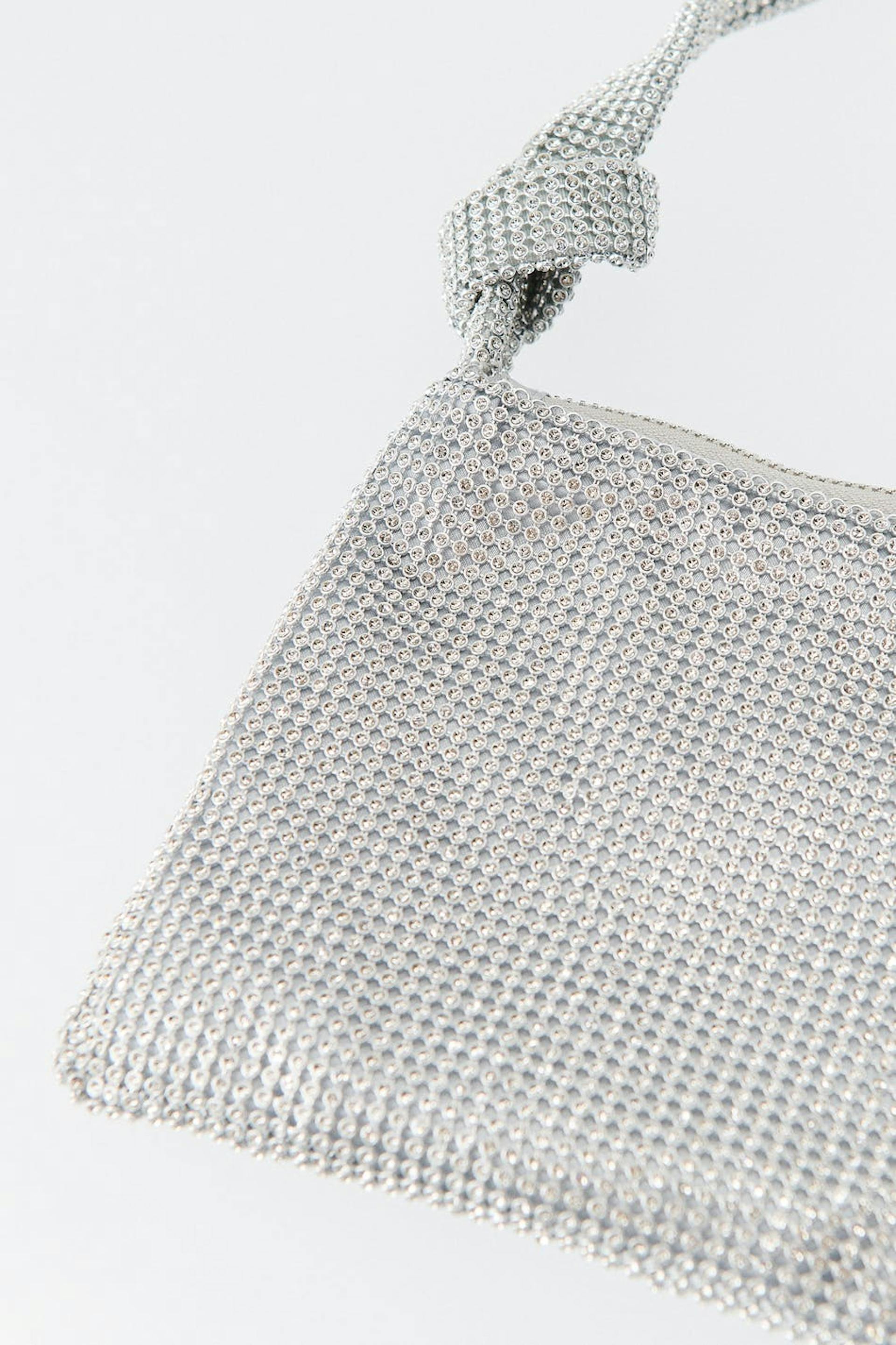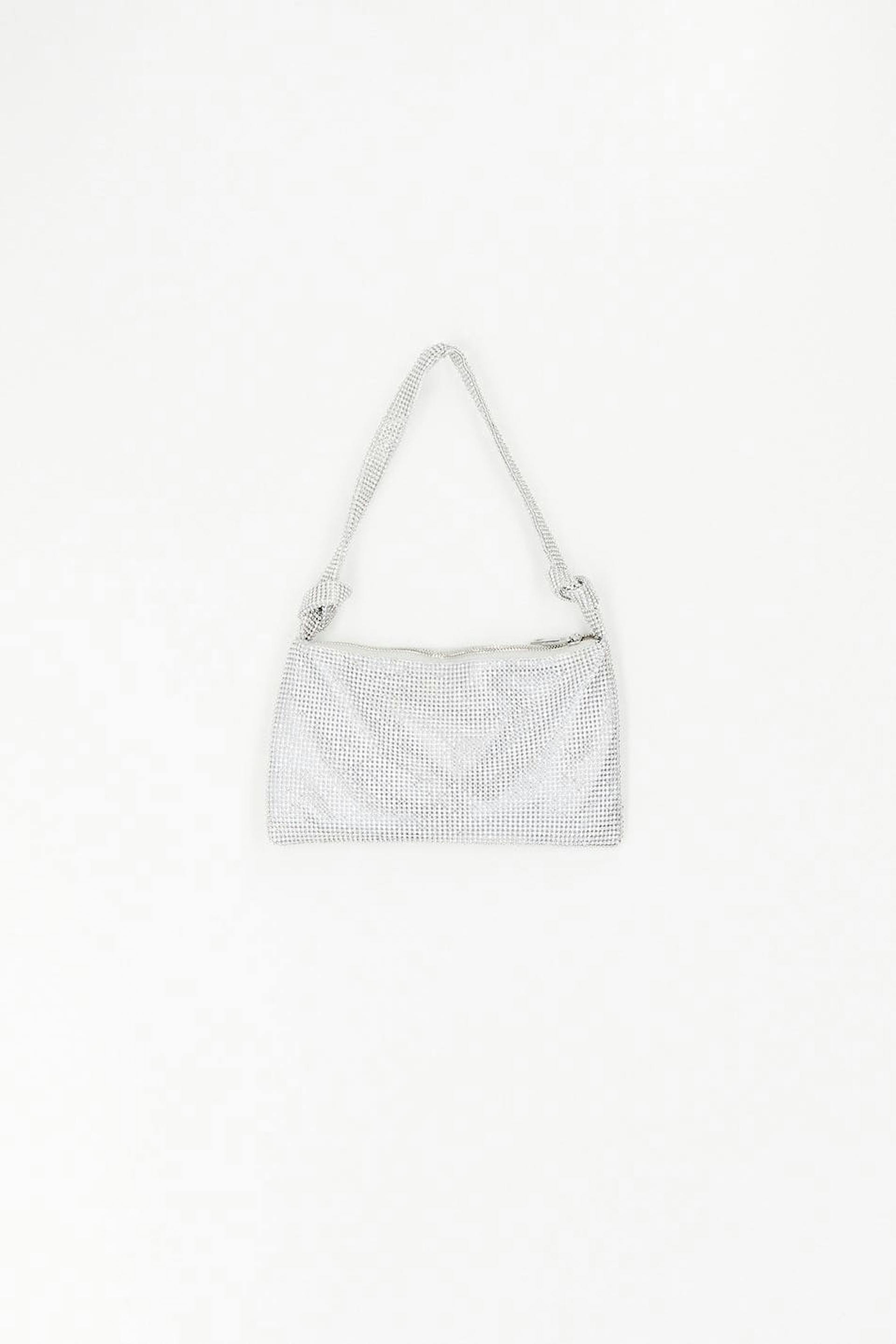 Vesken med strass. Veske er sølvfarget og har kort skulderstropp med dekorative knuter i sidene. Den har glidelåslukking på toppen.