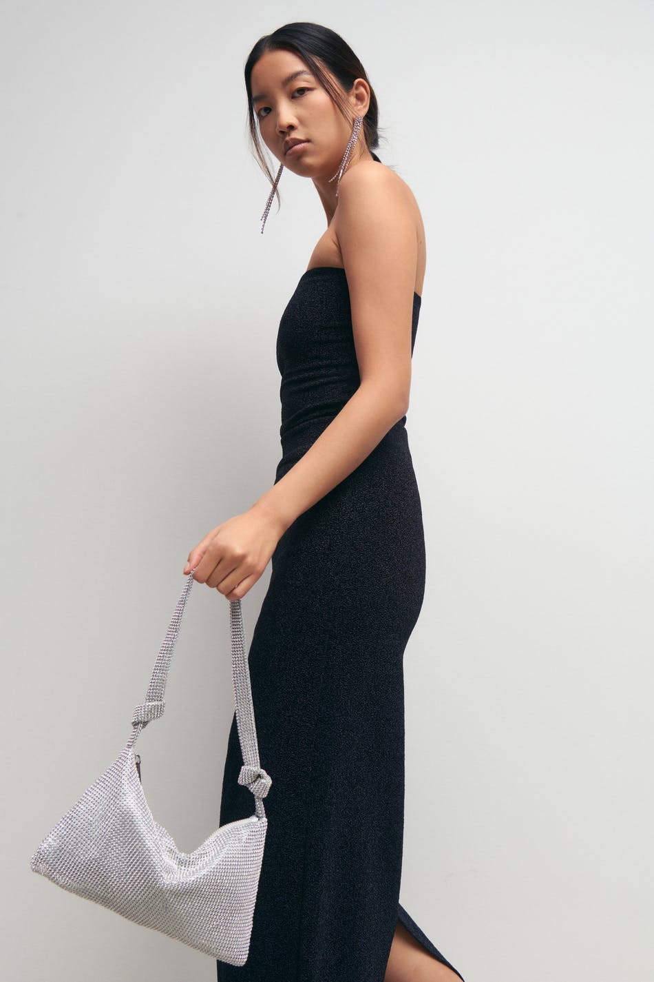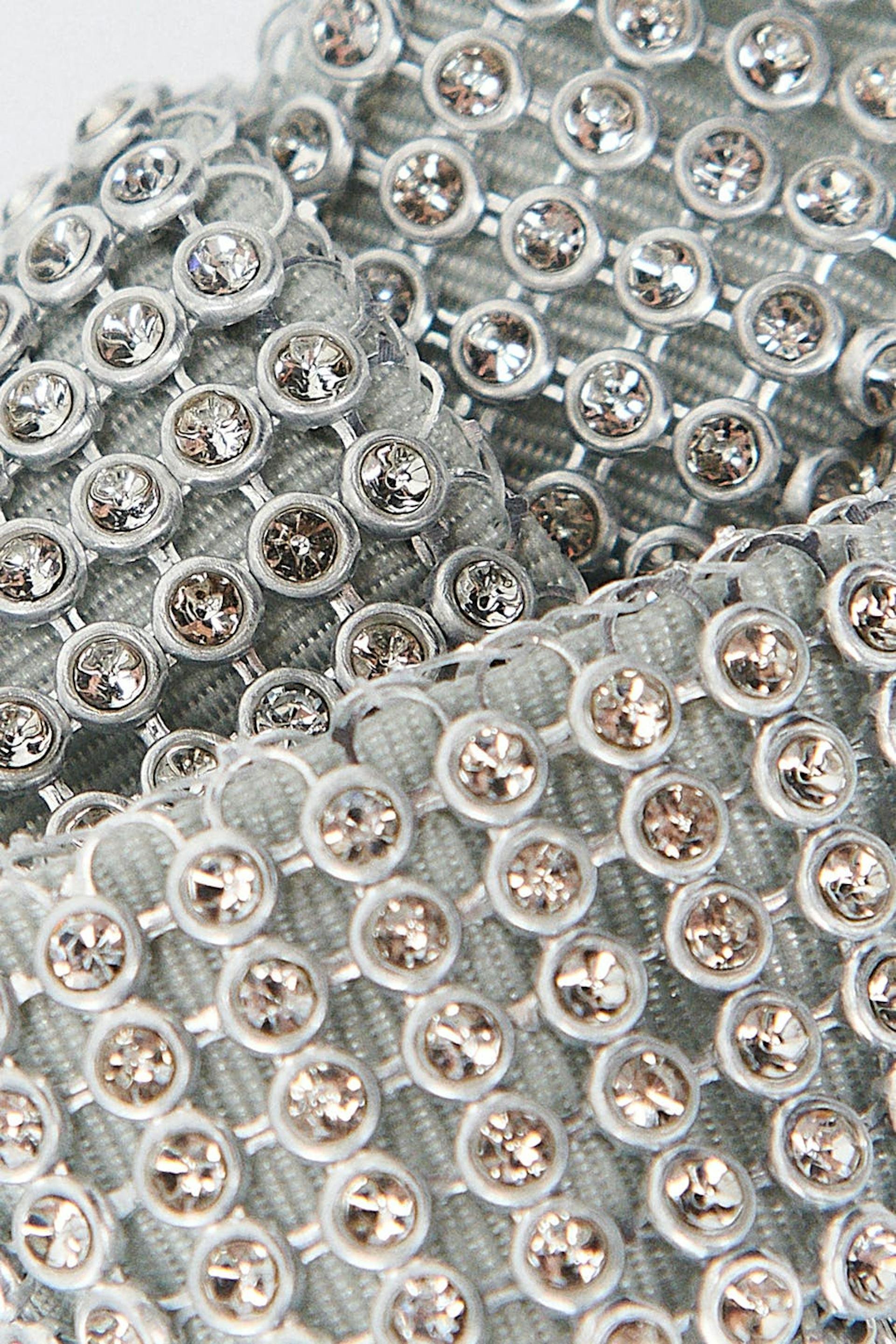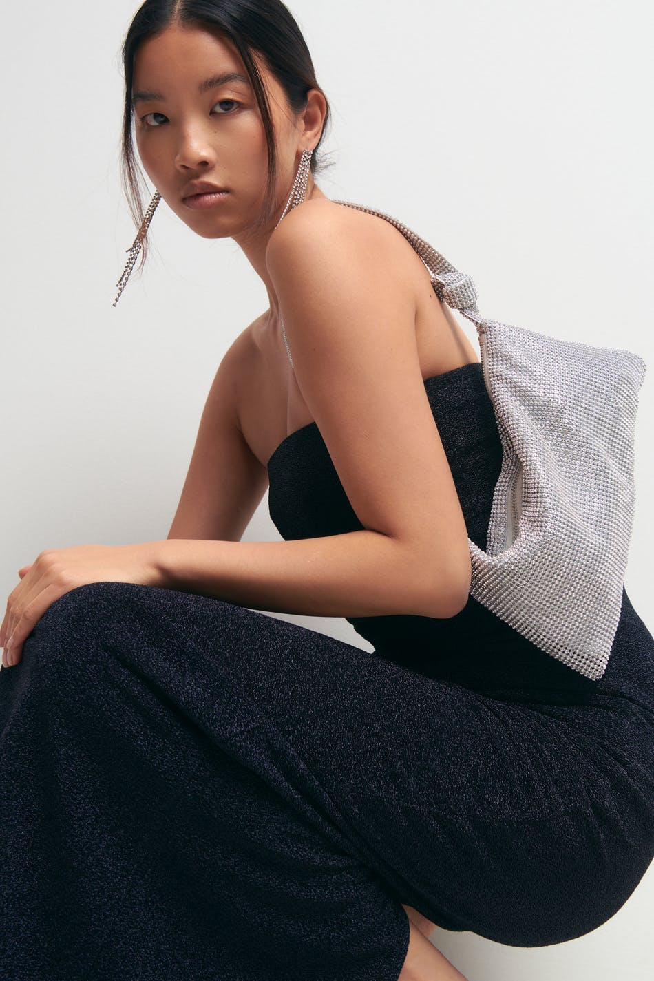 Vesken med strass. Veske er sølvfarget og har kort skulderstropp med dekorative knuter i sidene. Den har glidelåslukking på toppen.