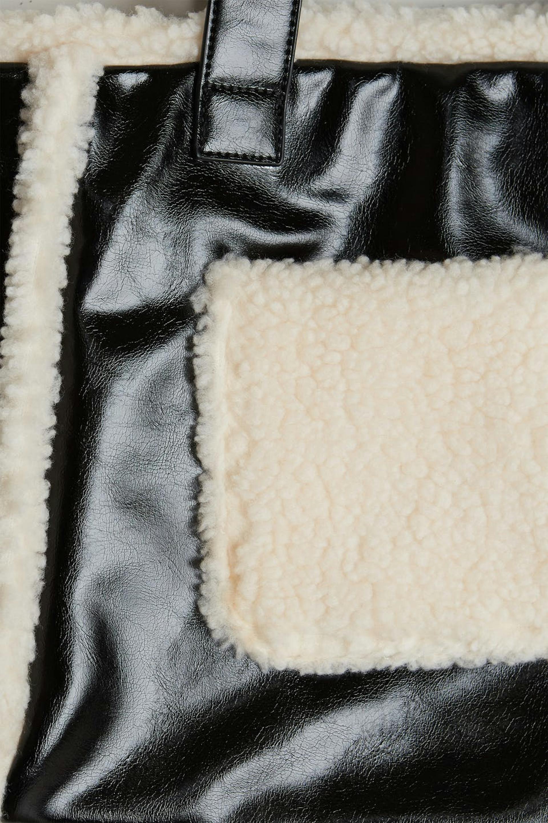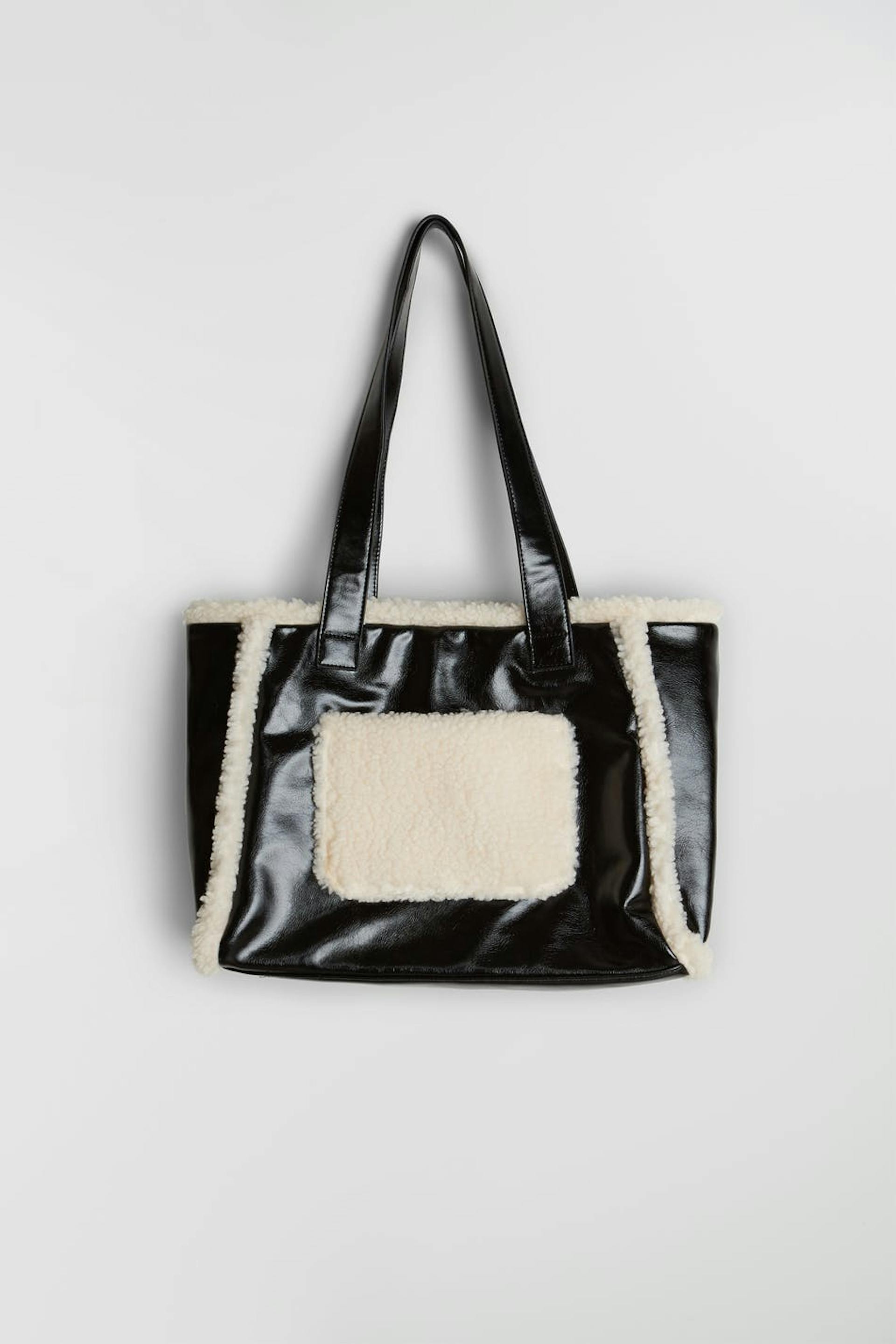 Handlepose med detaljer i kunstig skinn. Veske er svart. Den er laget av PU.