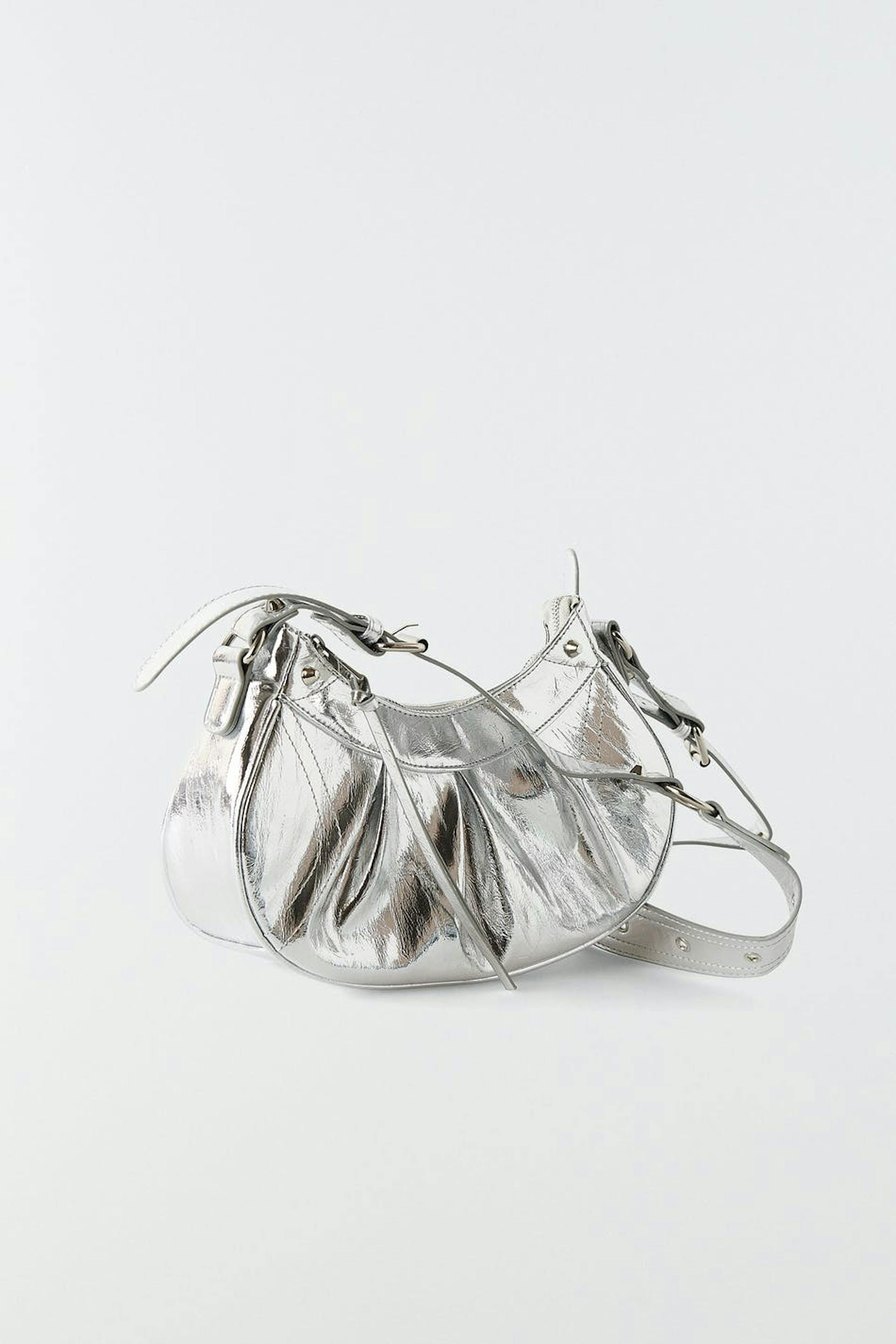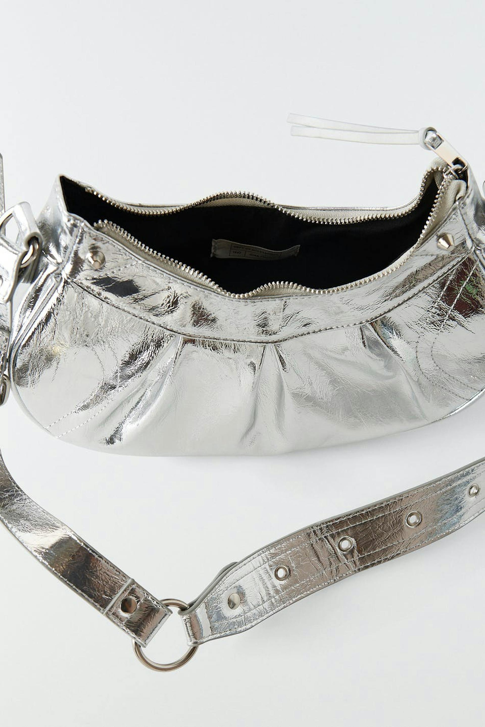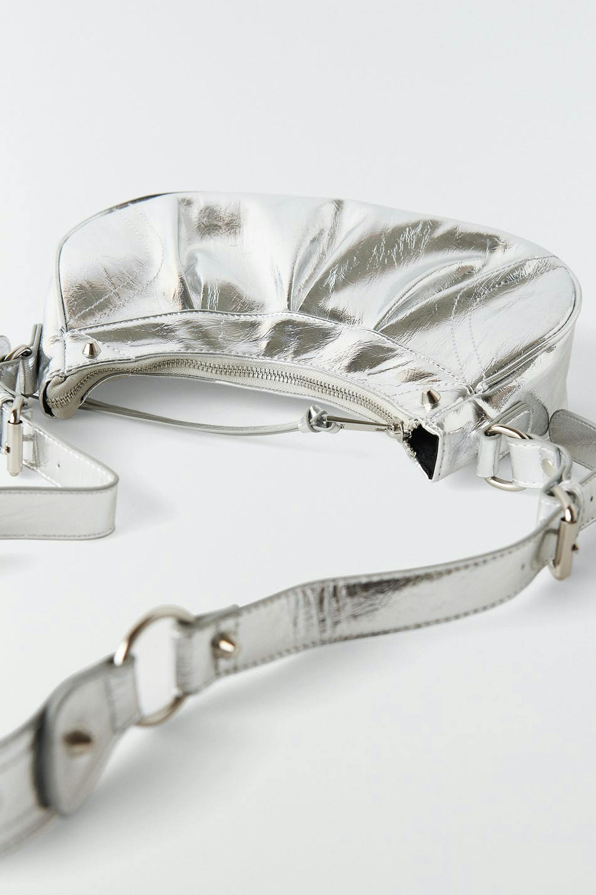 Metallic baguette-veske i PU med en skulderstropp. Veske er sølvfarget og har stifter.