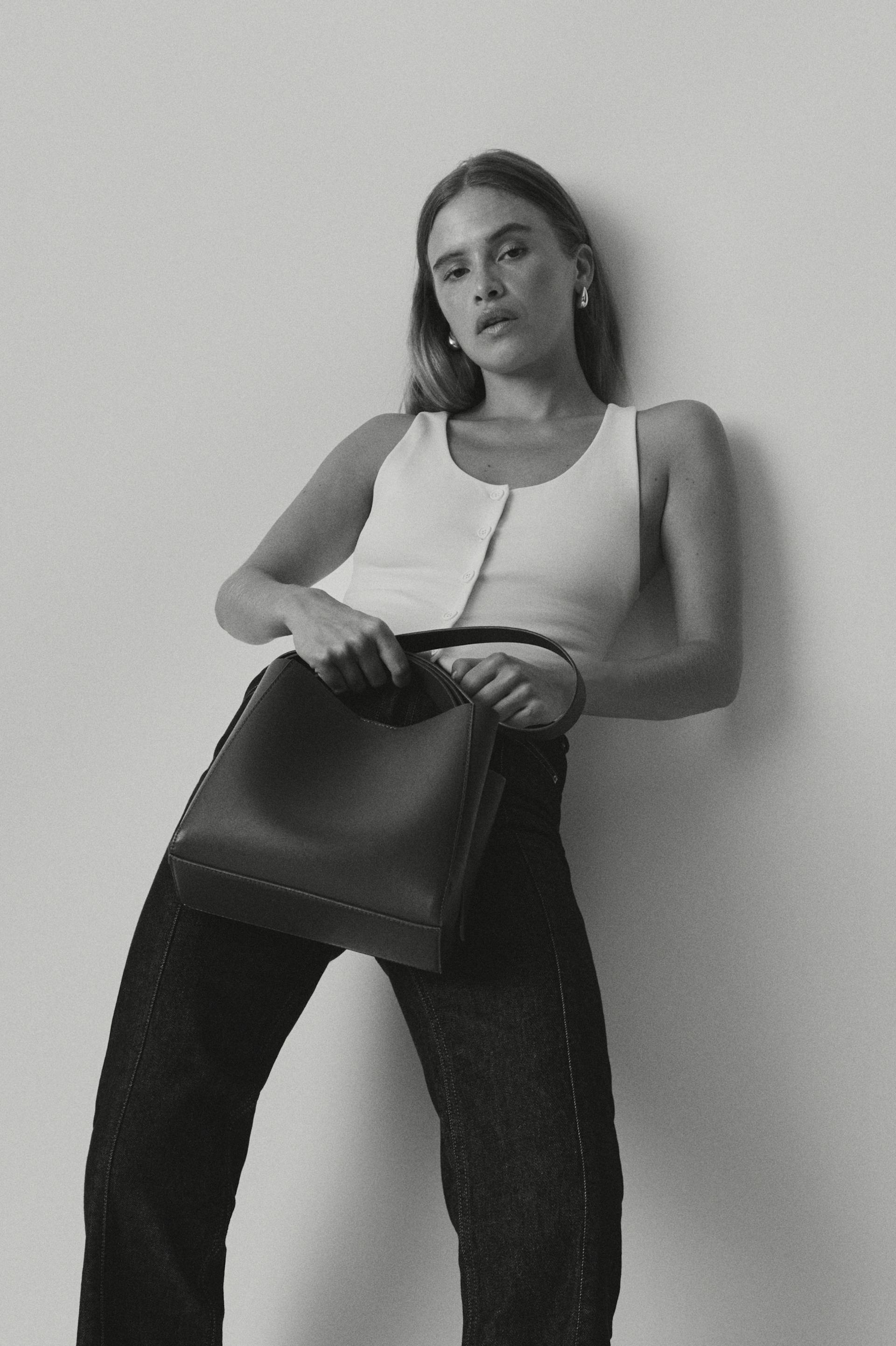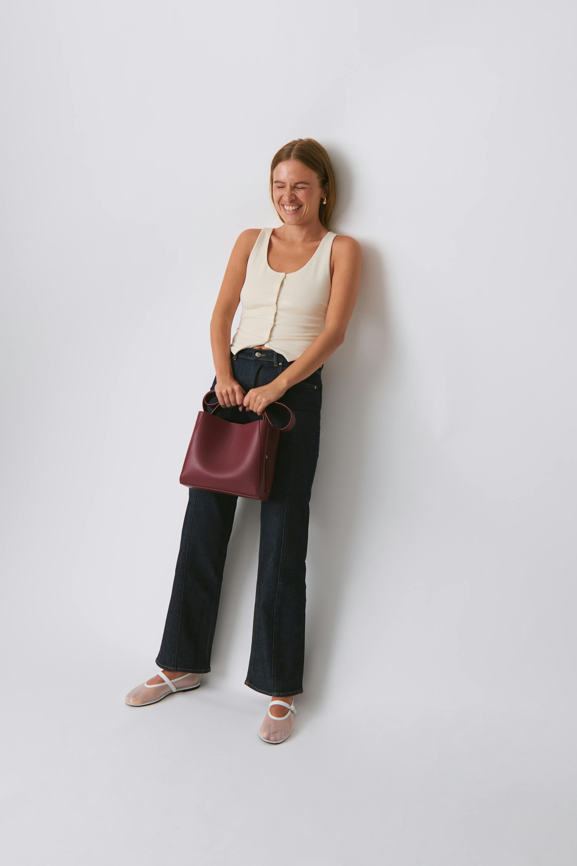 Skulerveske i skinnimitasjon med håndtak på toppen. Veske er rød og har lang skulderstropp. Den har magnetknapping og innerlomme med glidelås.