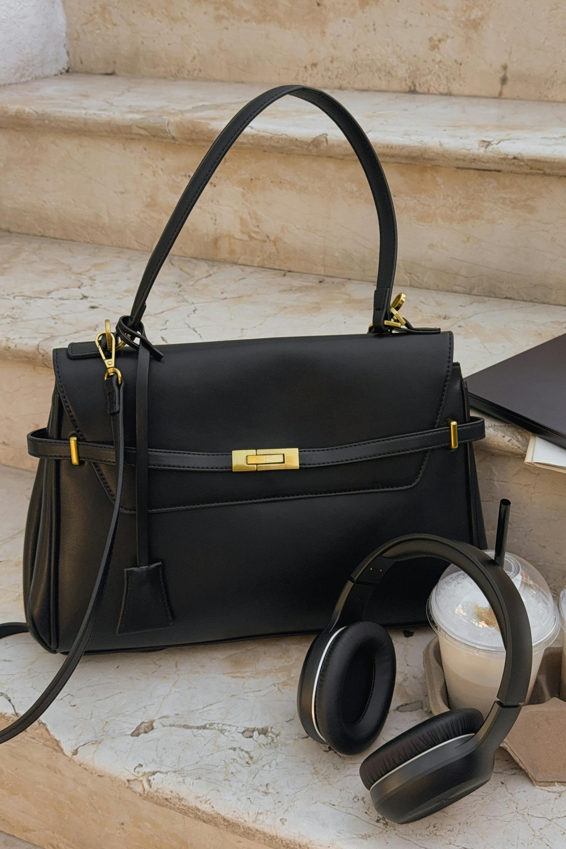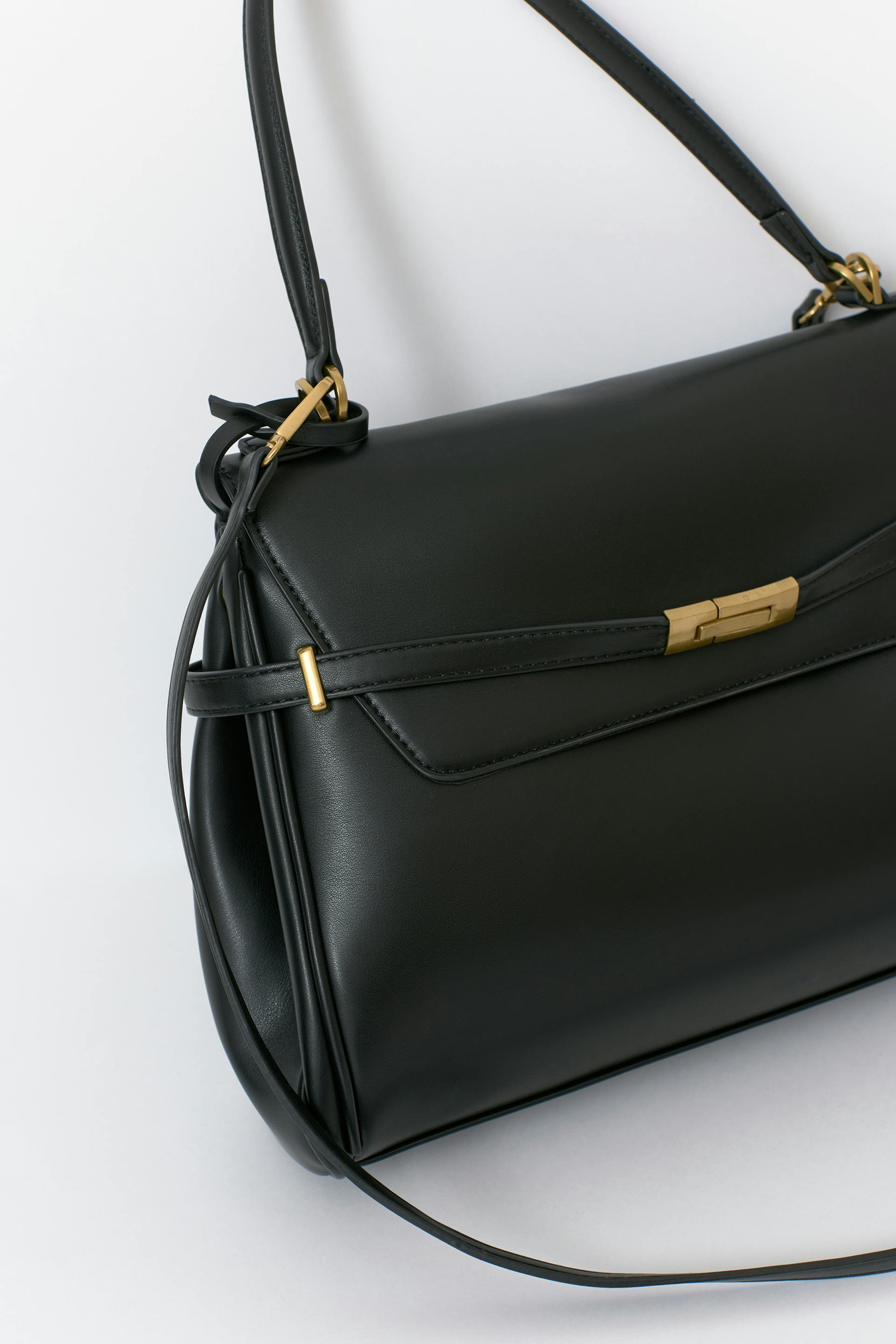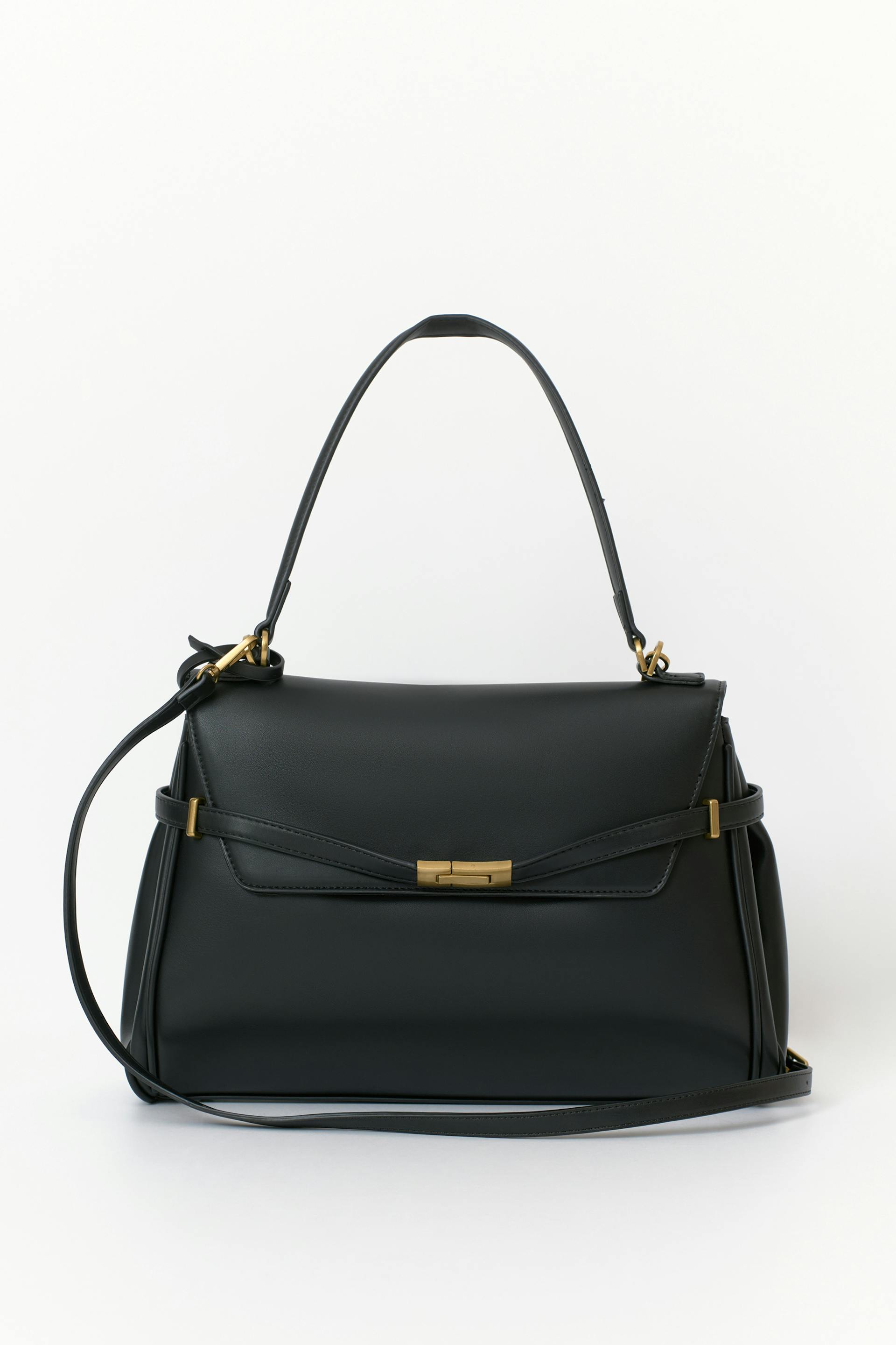 Flap-bag i imitert skinn med magnetknapping. Veske er svart og har et håndtak. Den har justerbar, avtagbar skulderstropp, gullfarget metallspenne, gullfargede detaljer, fôret innside med en stor glidelåslomme i midten og føtter i metall under.