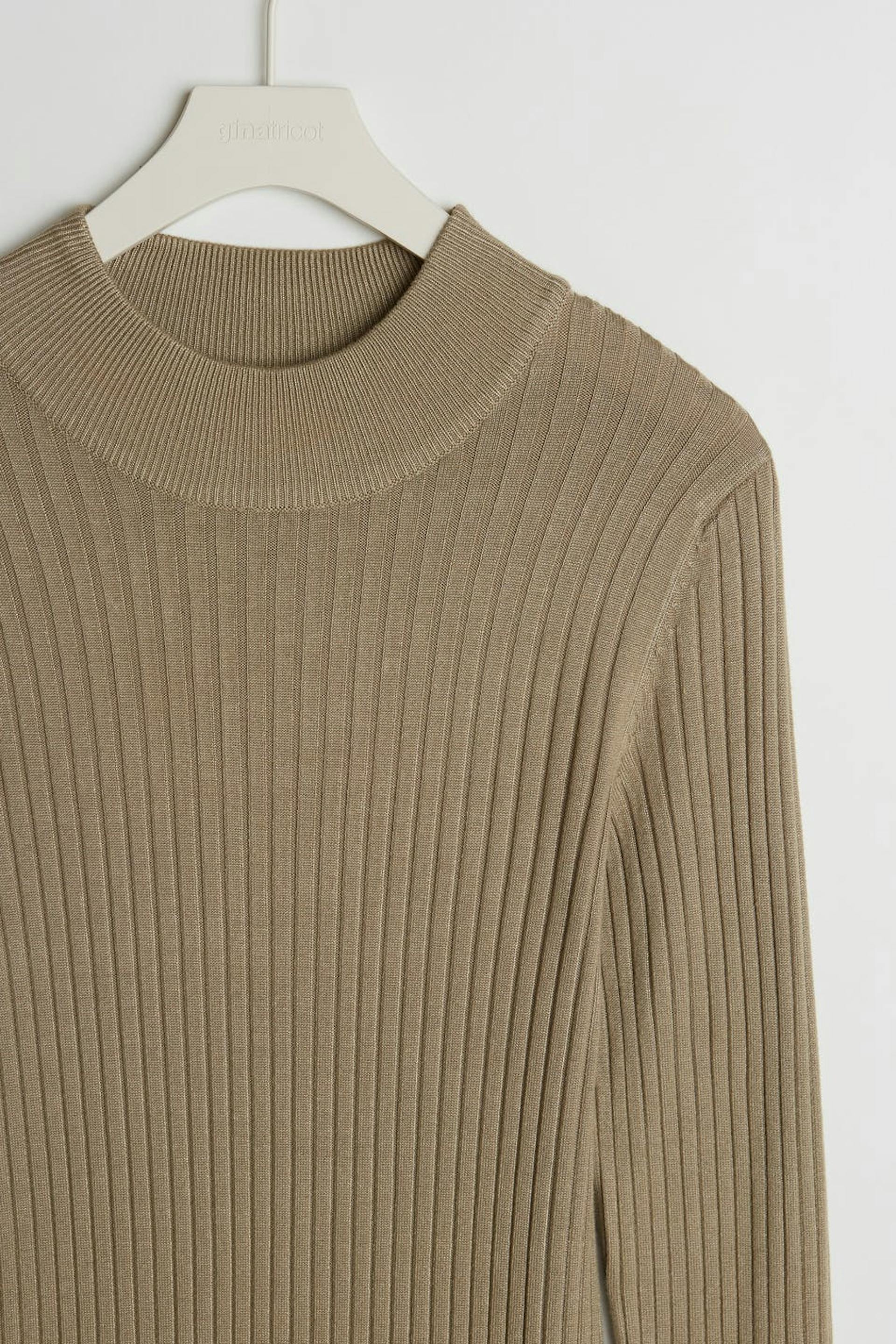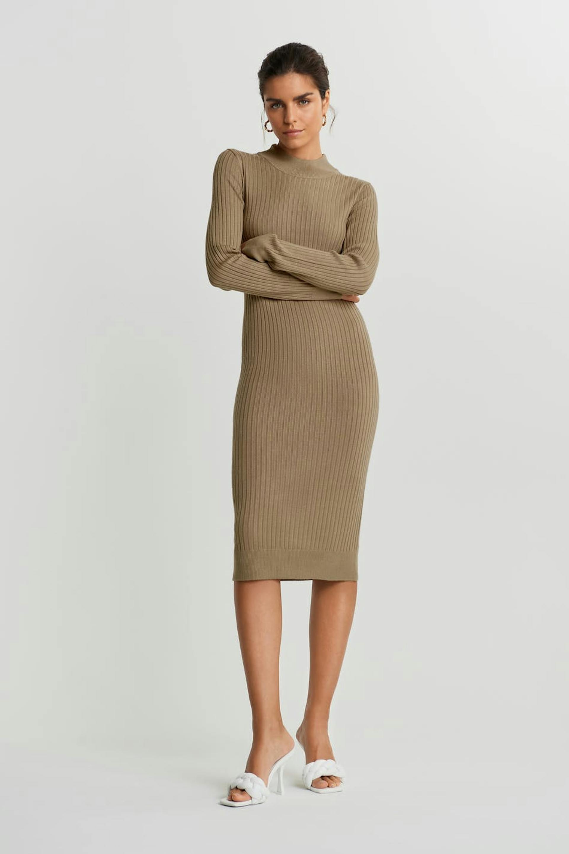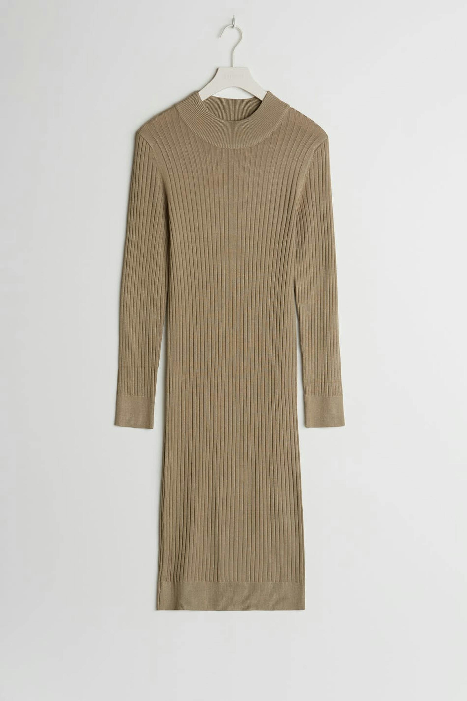 Lang kjole. Kjolen er beige og ribbestrikket.