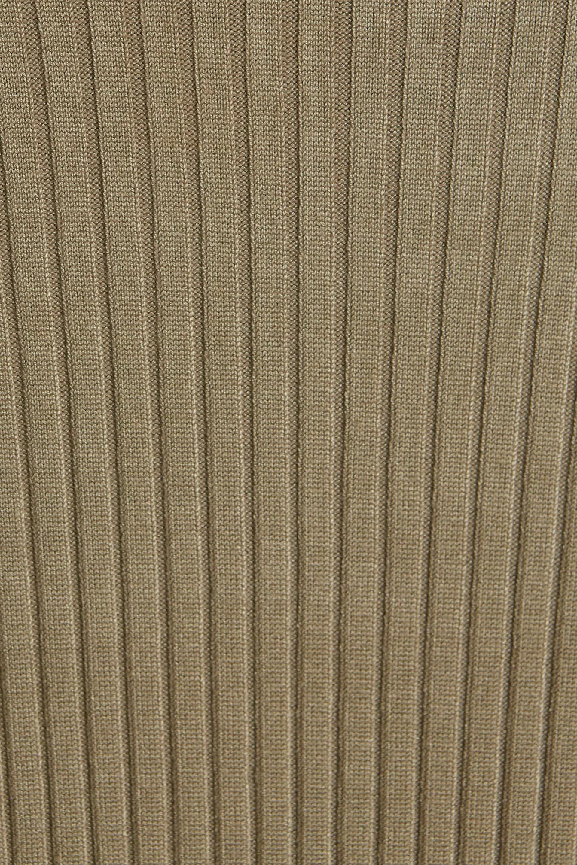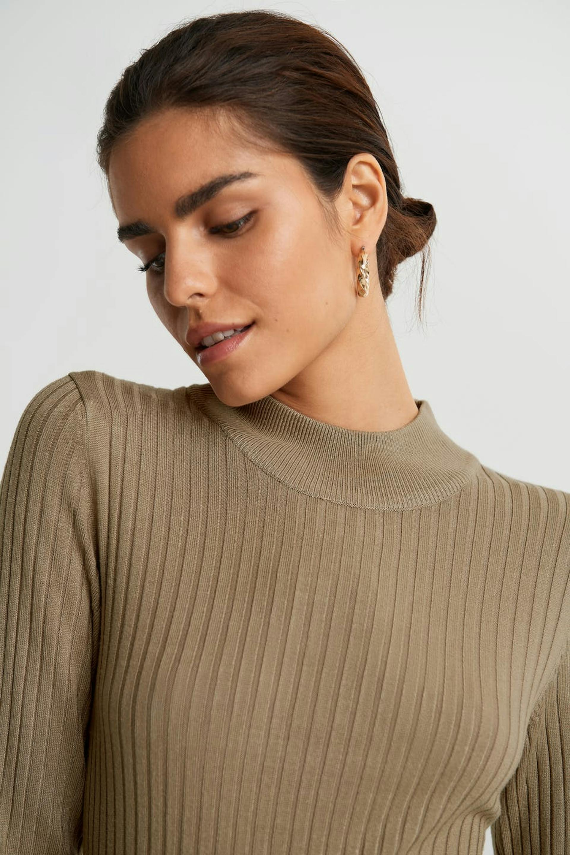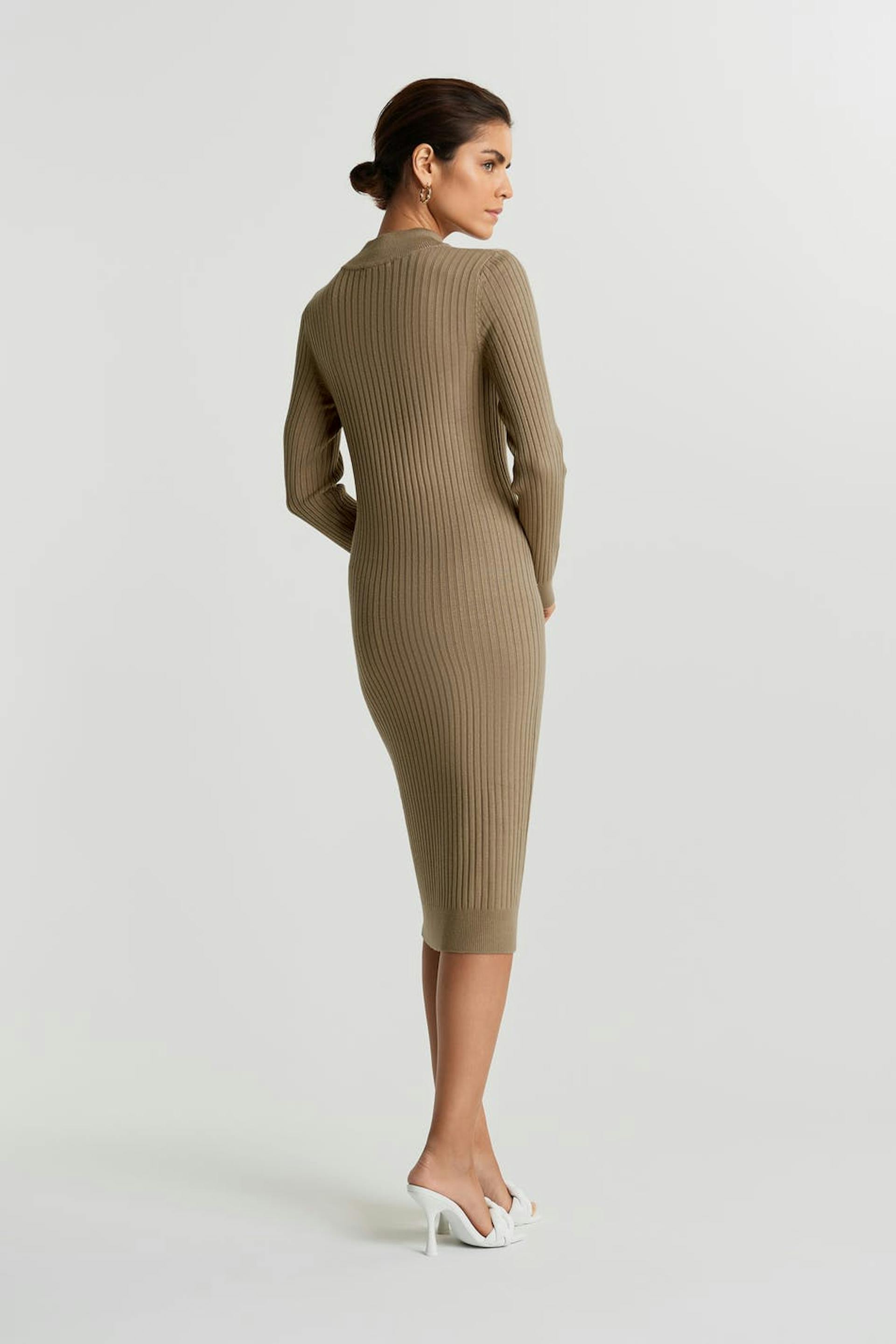 Lang kjole. Kjolen er beige og ribbestrikket.