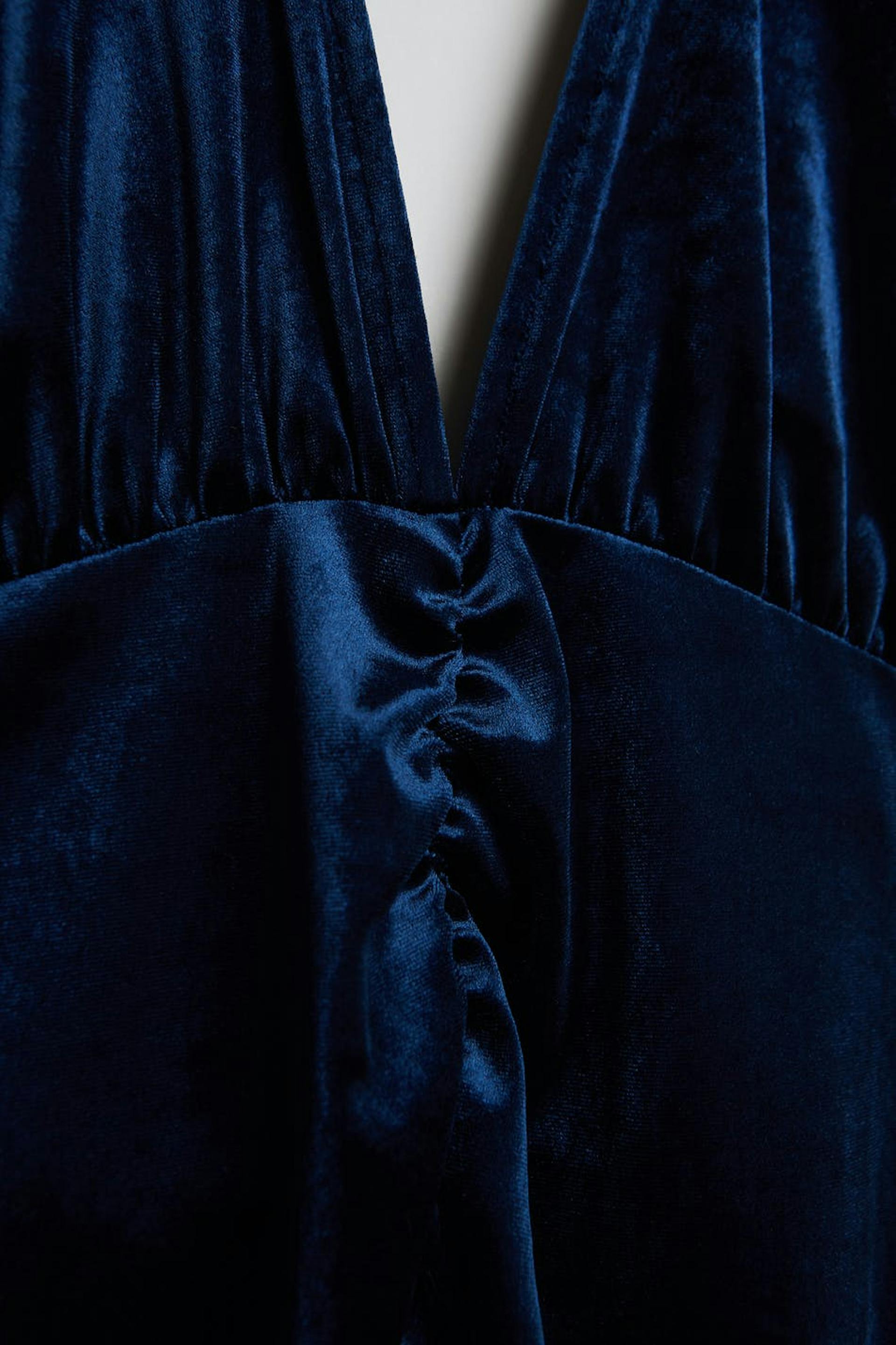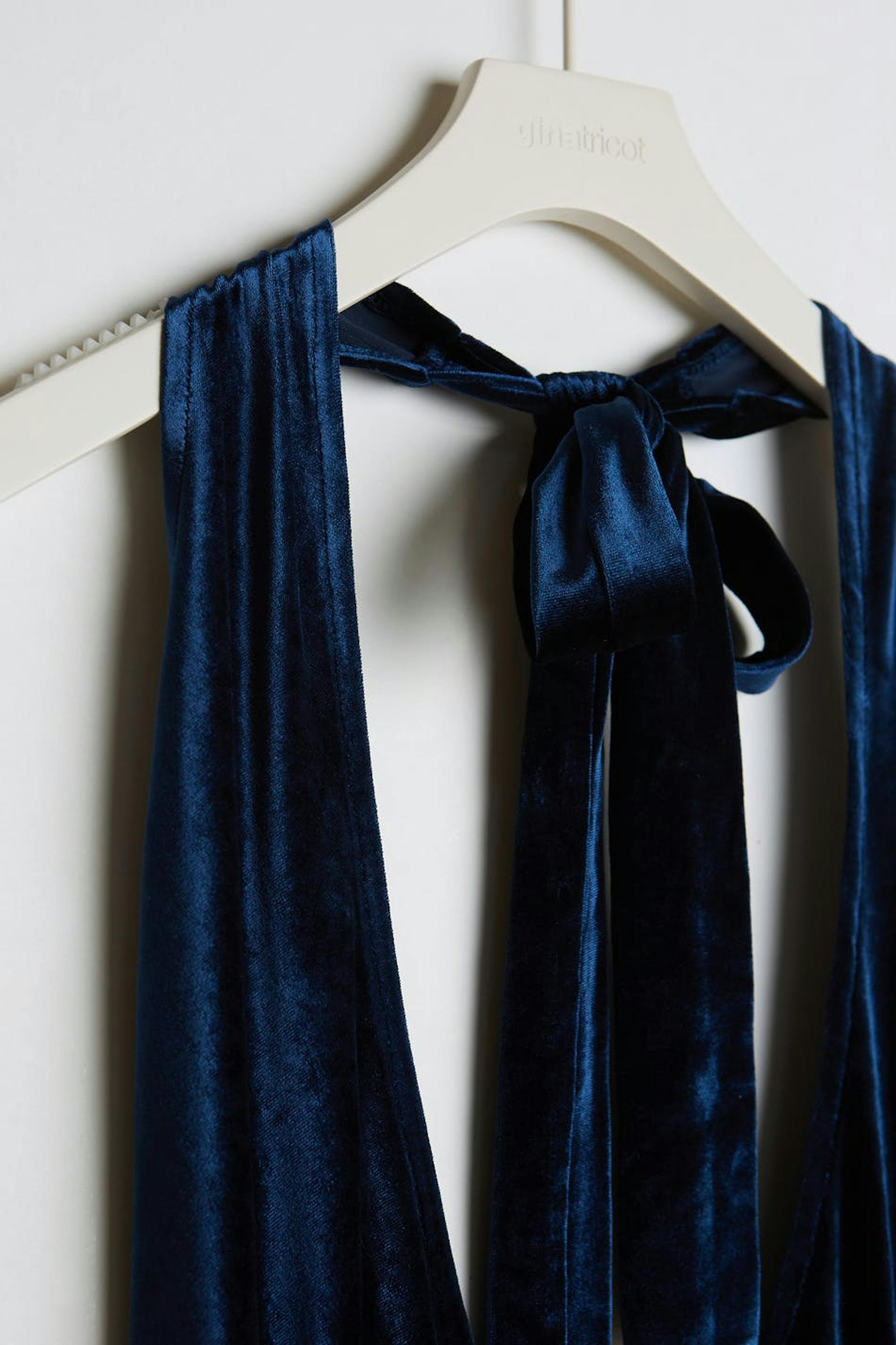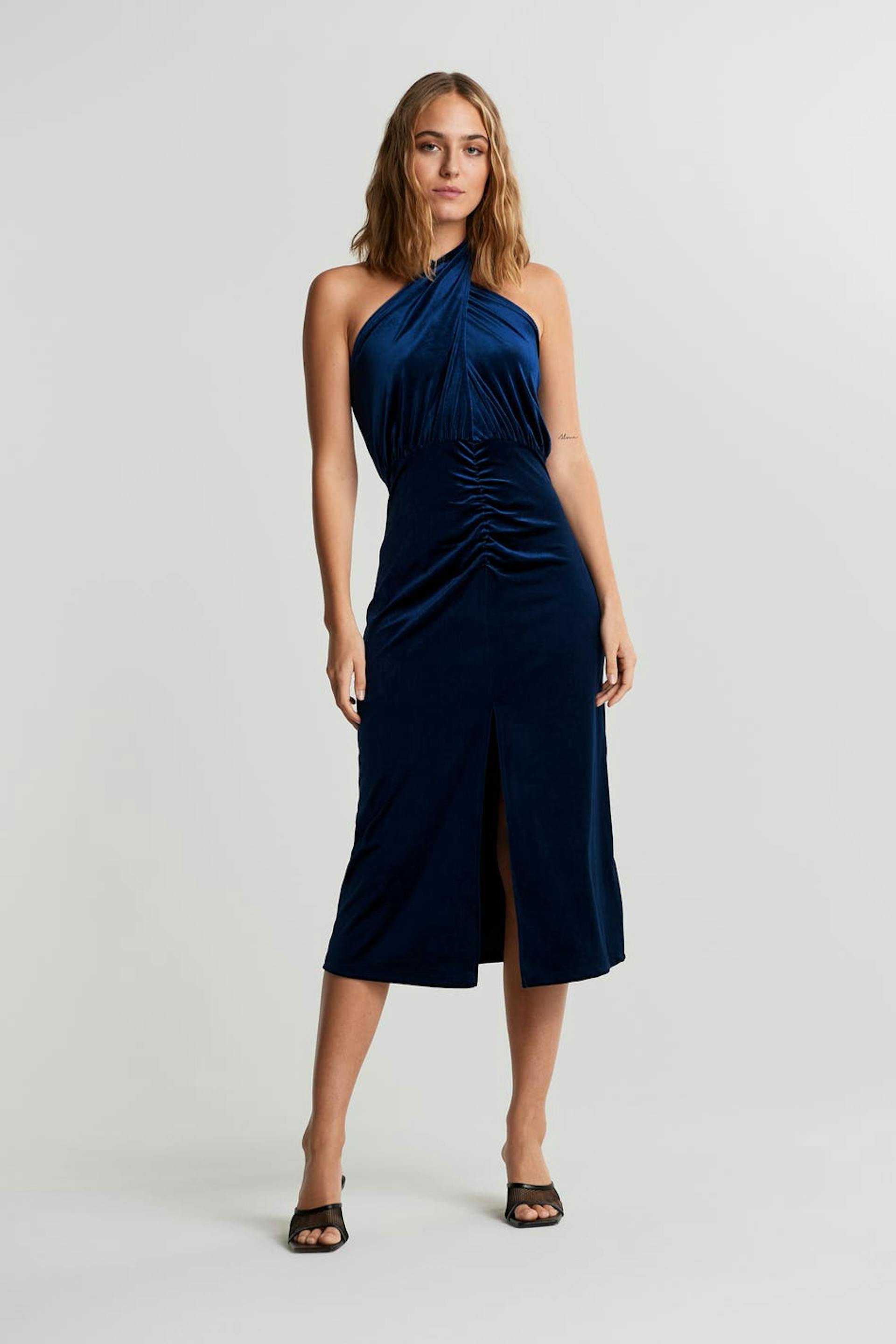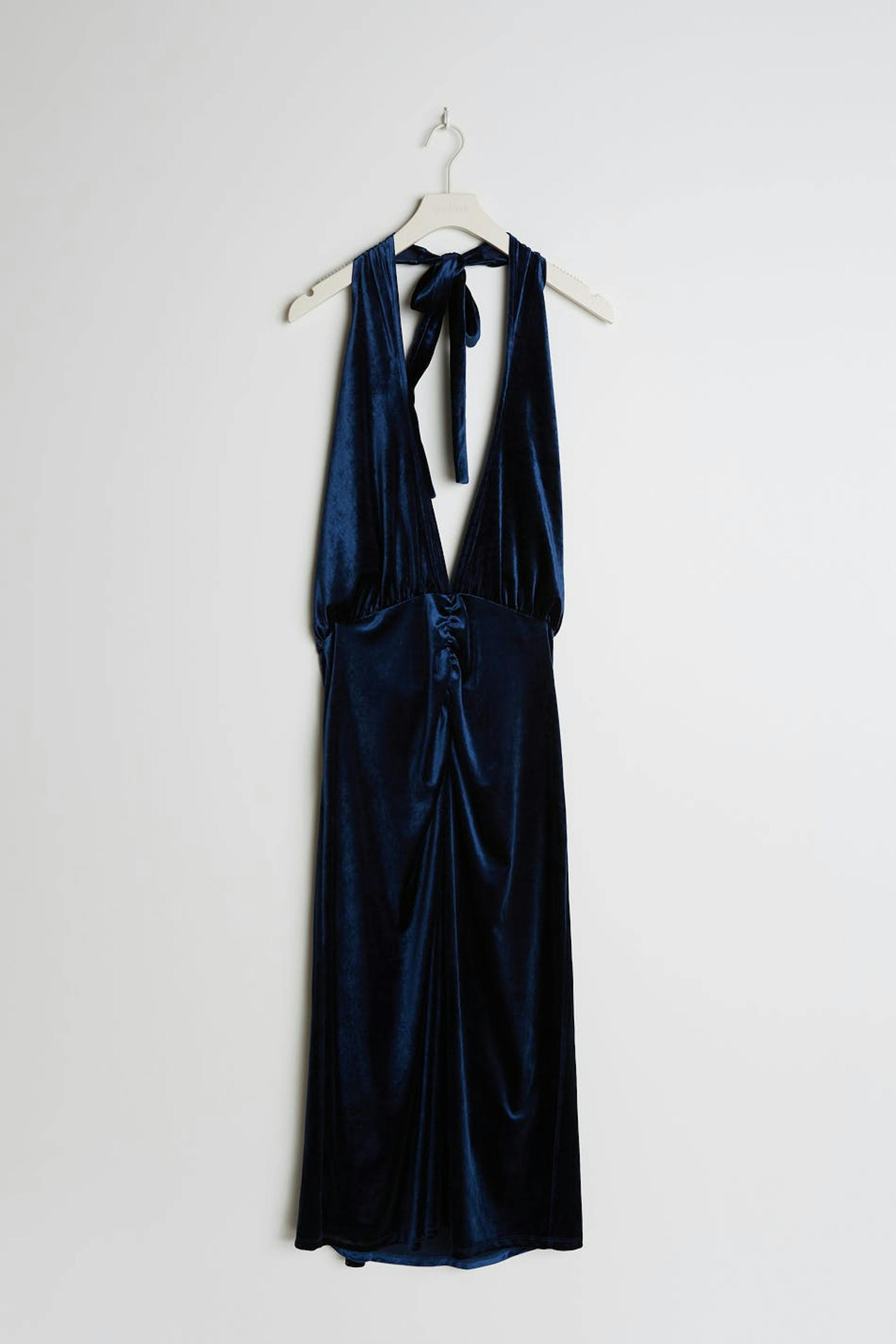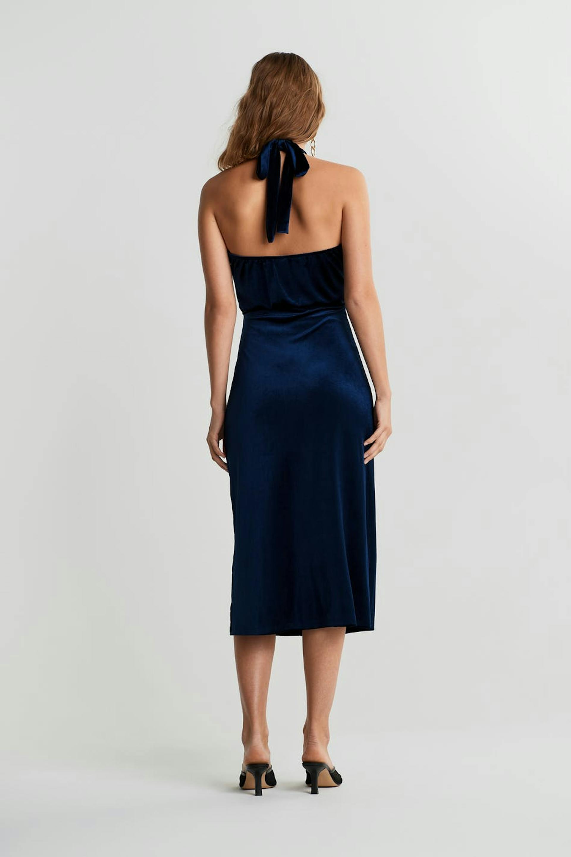 Kjole med en vanlig passform. Kjolen er perfekt for festen og mørkeblå og har en knyting på nakken. Den er laget av fløyel og har midi-lengde, rynke foran og en splitt på framsiden. Kan knytes på flere forskjellige måter.