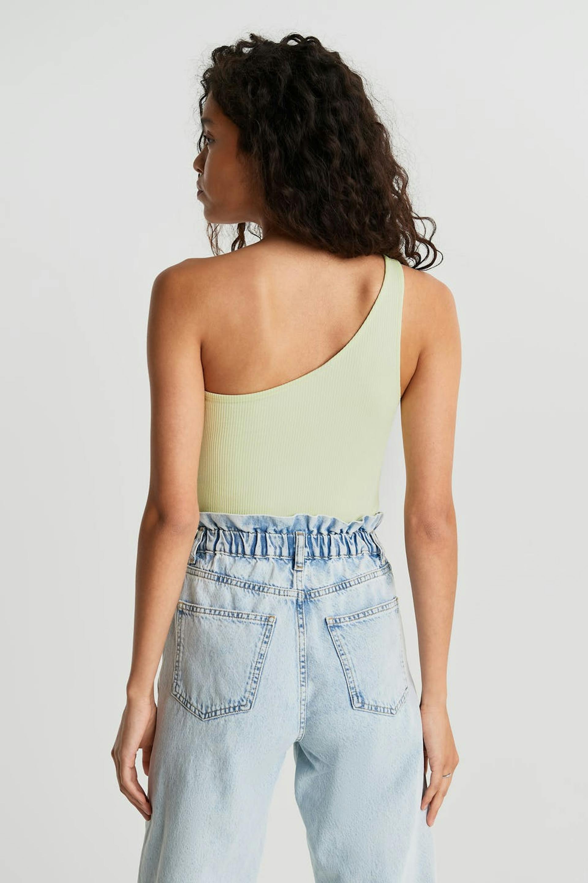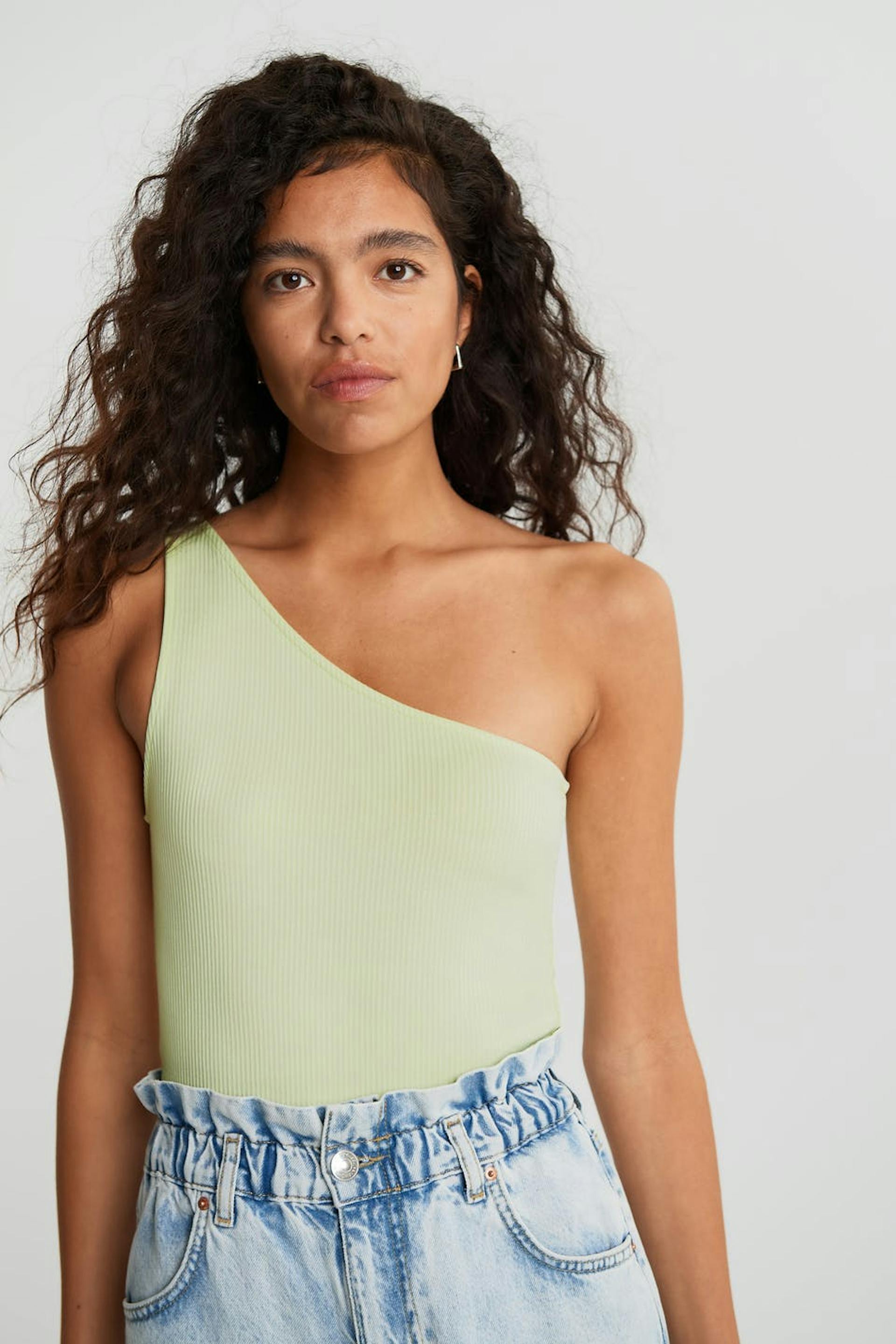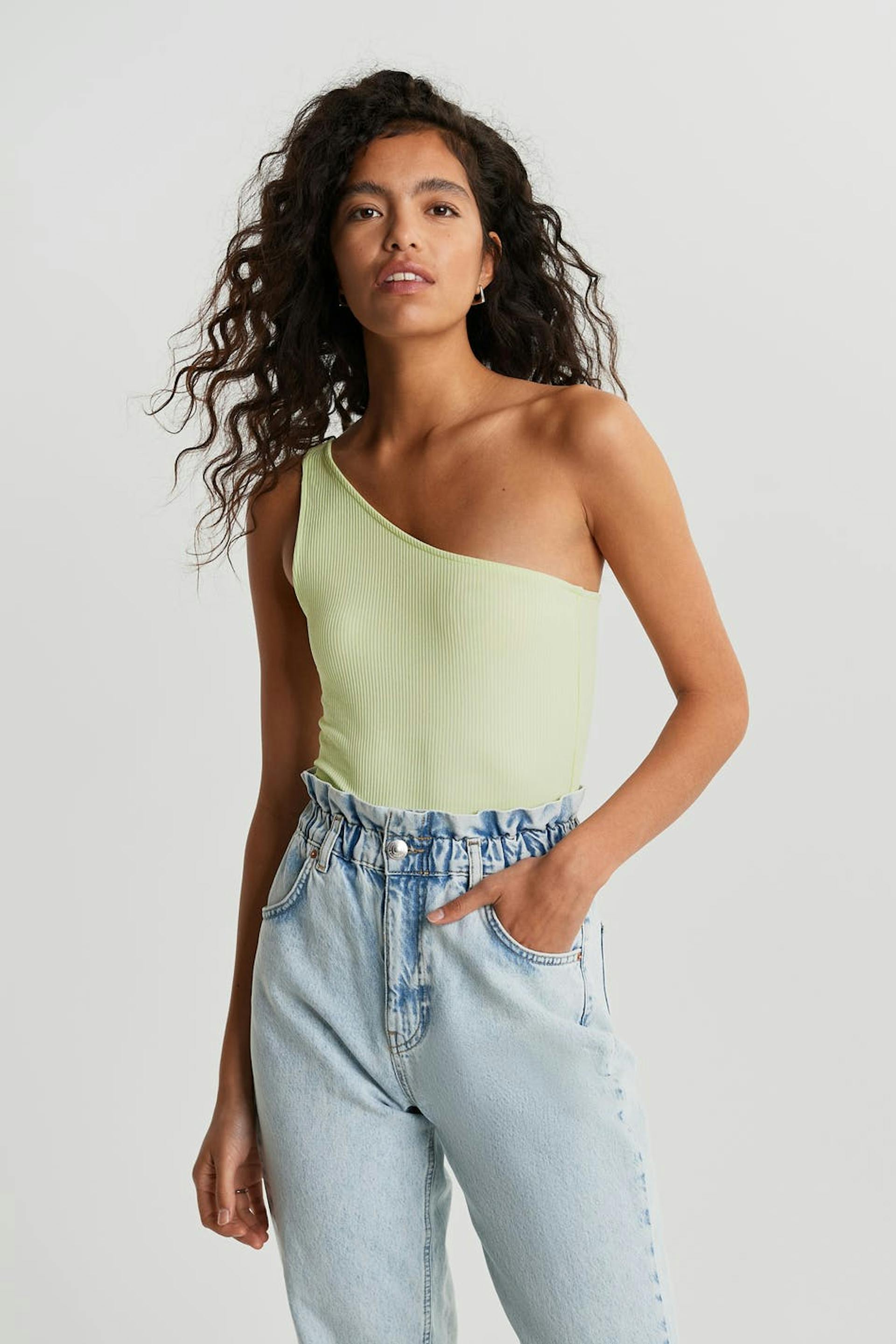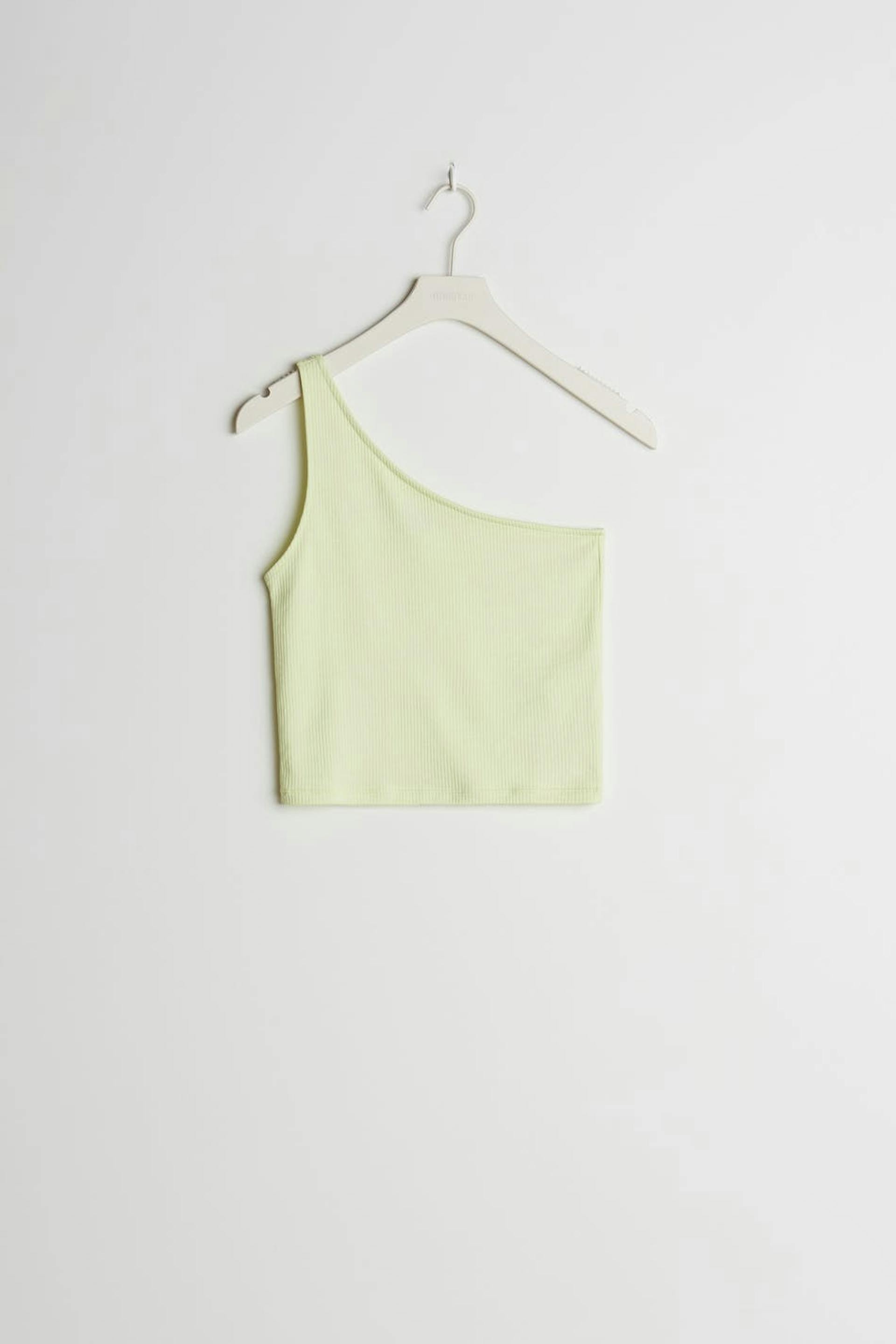 Topp i ribbestrikket jersey. One shoulder-modell. Figurnær passform. Leverandør: Kardem Tekstil San ve Tic A.S. Produksjonsenhet: Kardem Kesan Fabrikasi