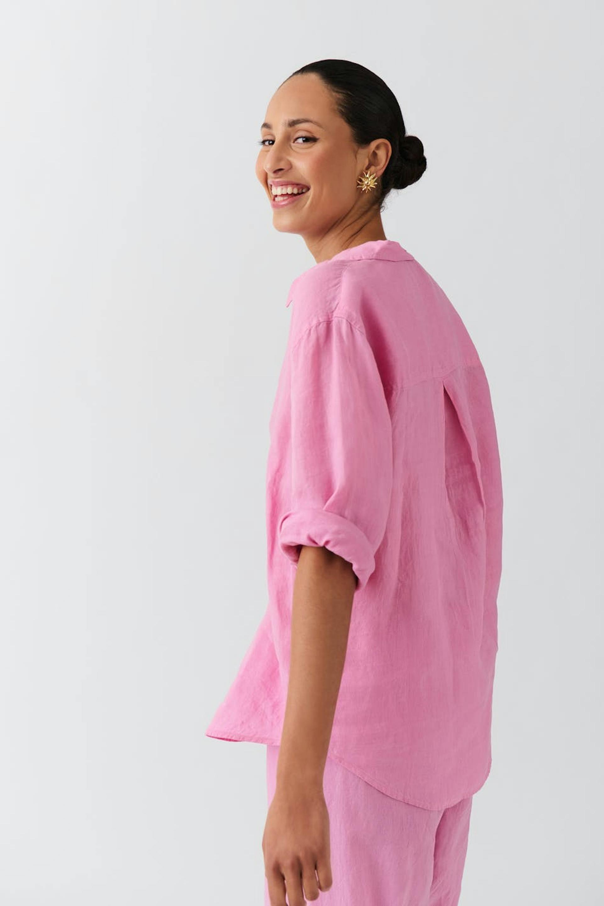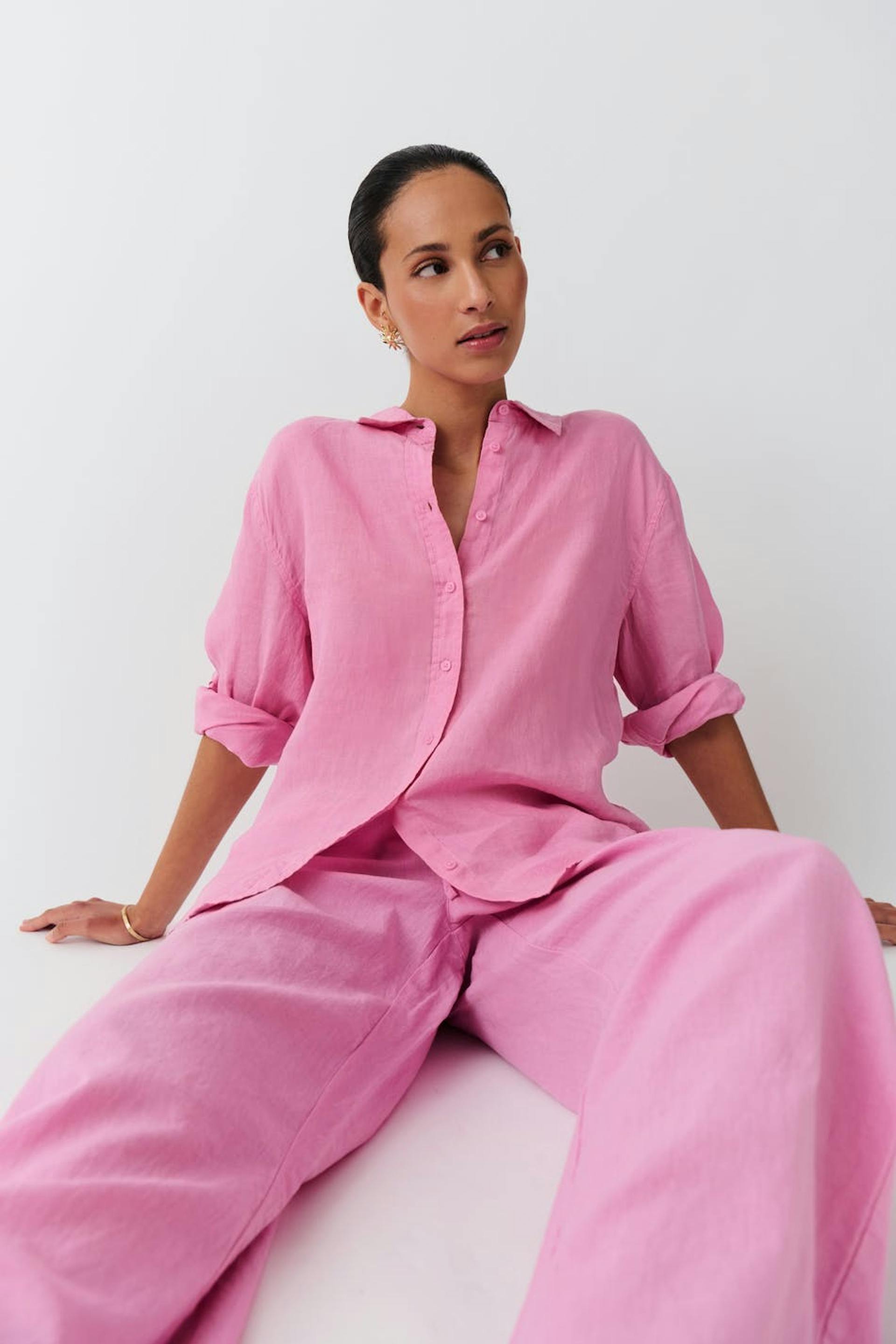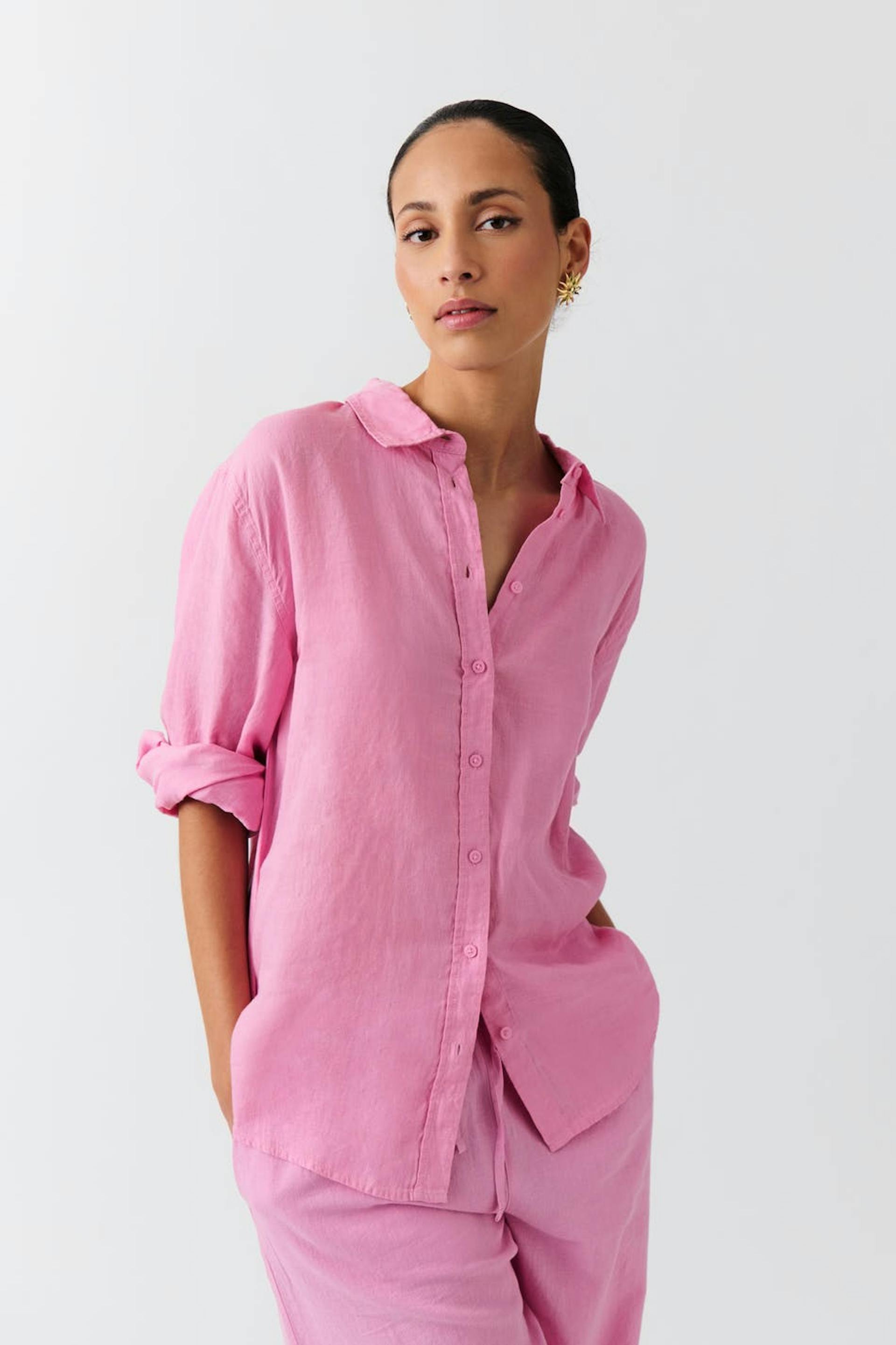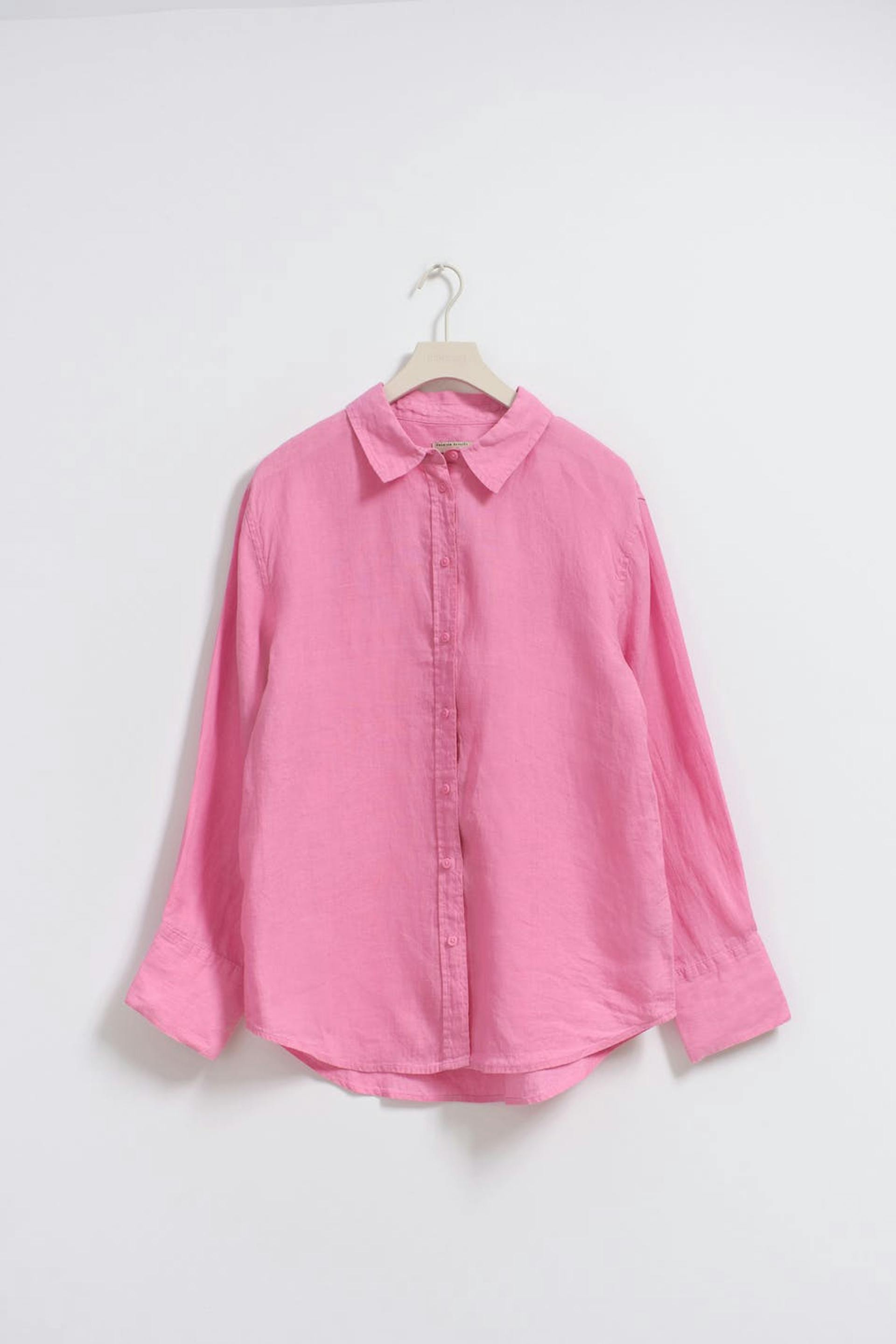 Linskjorte med oversized passform. Skjorten er rosa og har knapping på forsiden. Den har krage, bærestykke med folder baktil og langt erme med knapp og mansjett.