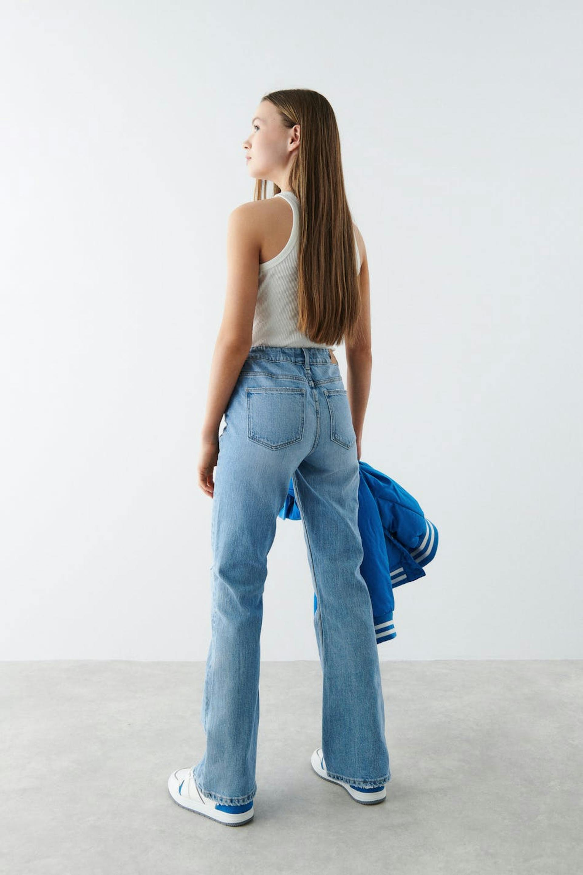 Jeans med en lav midje. Jeansene er lyseblåe og blå og har en autentisk look i stretch denim. De har en justerbar elastisk strikk ved midjen.