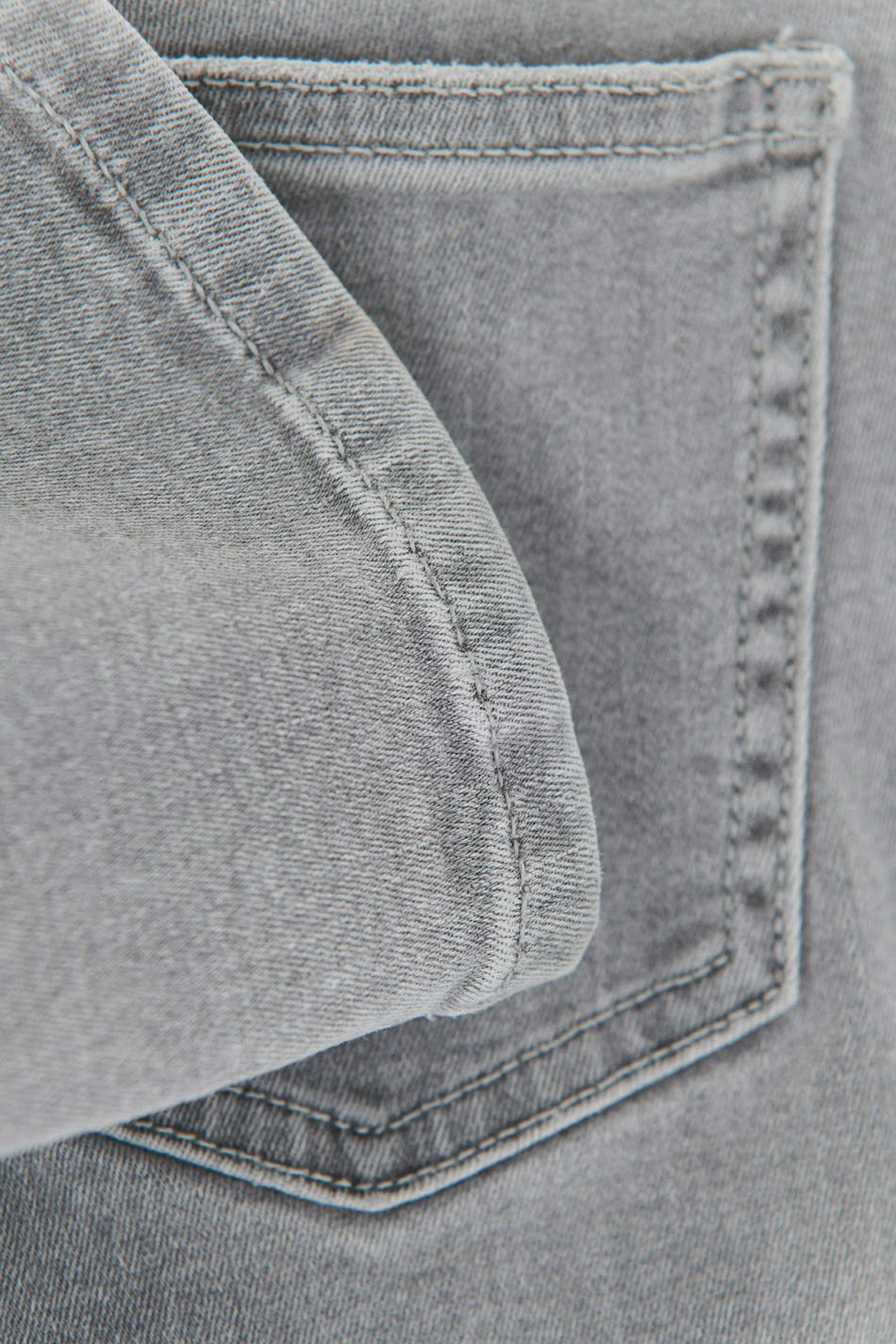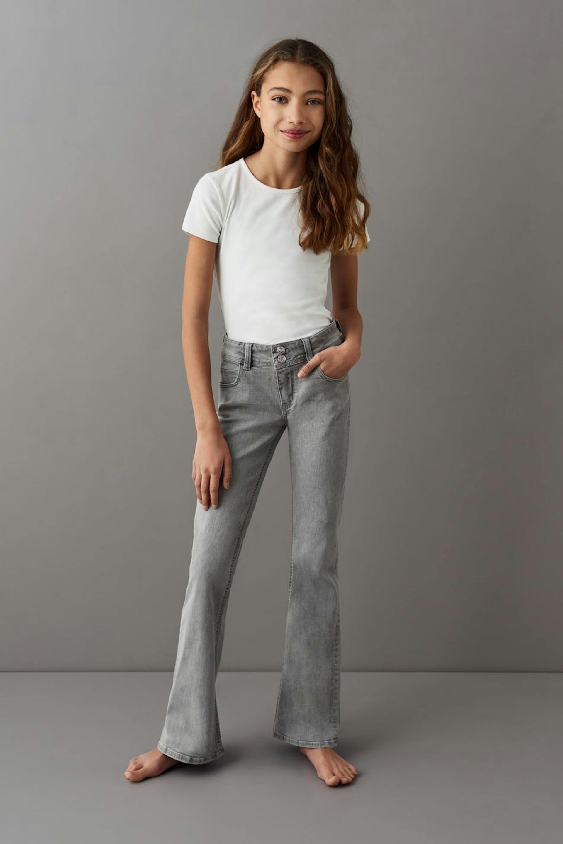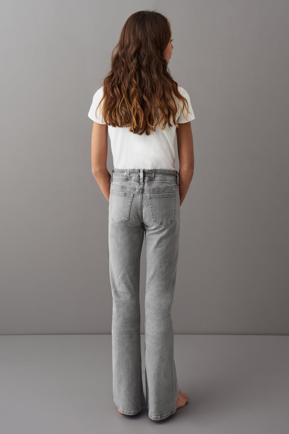 Boot cut jeans fra Gina Tricot Young med lav midje. Jeansene er grå og har utsvingte ben. De har lav stretch, justerbar gummistrikk ved midjen, lynlås med doble knapper foran og lommer foran og bak.