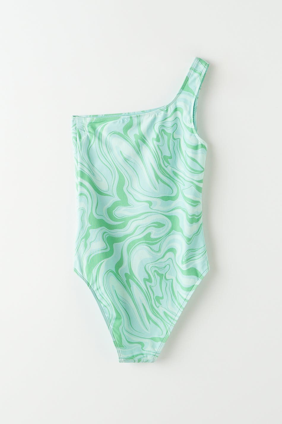 Virvelmønstret one shoulder-badedrakt fra Young-sortimentet vårt med fôret innside. Badedrakten er grønn og har en skulderstropp.