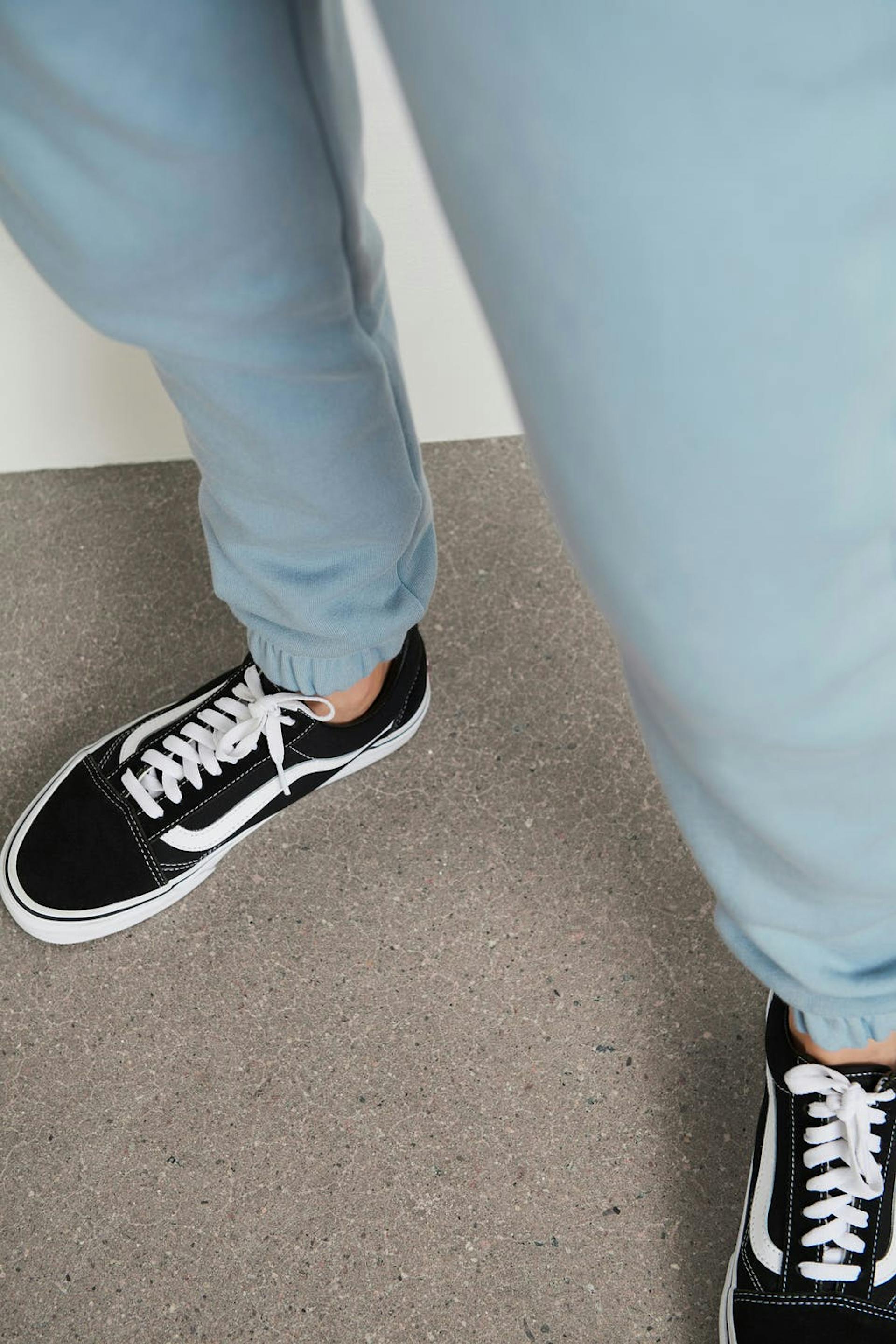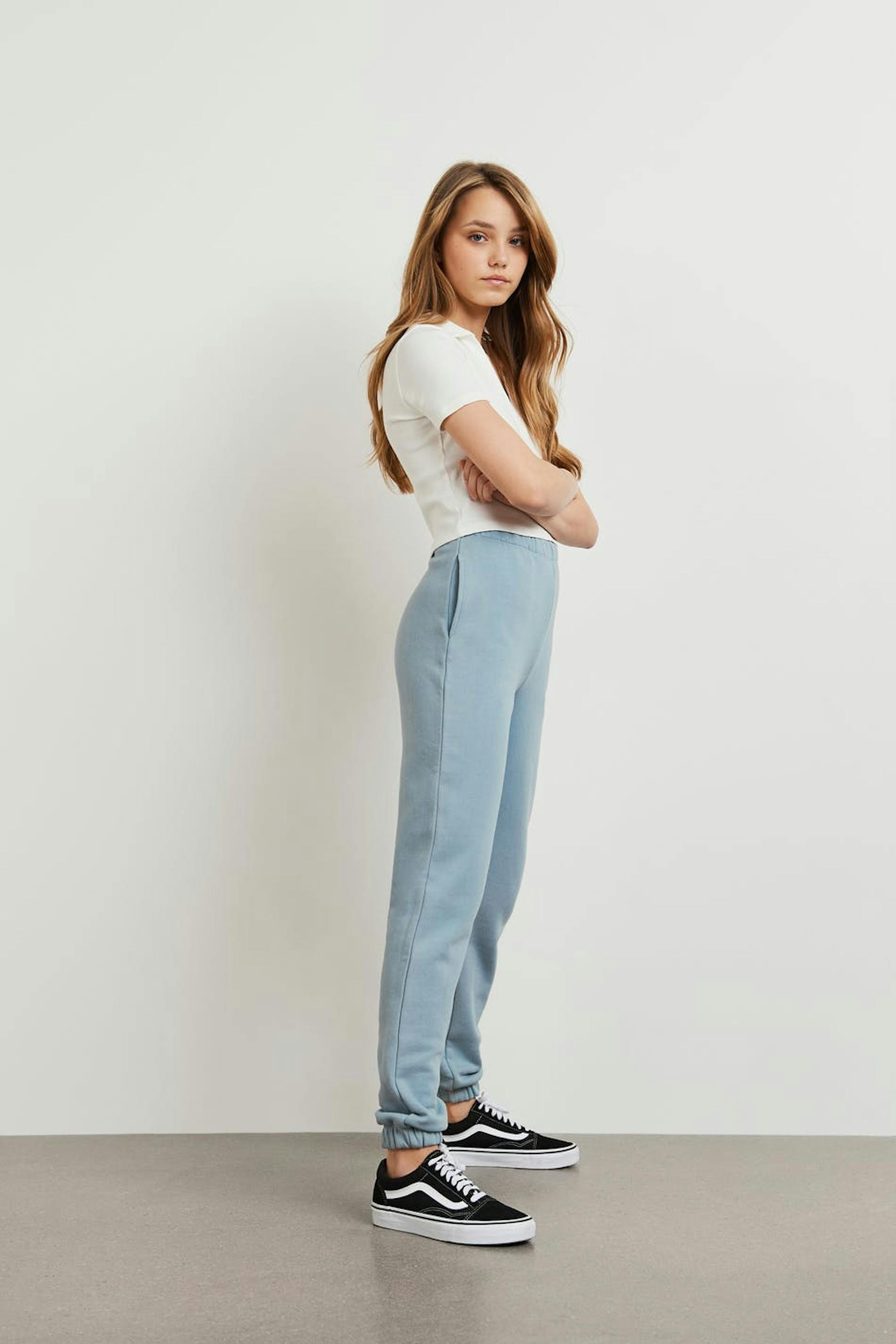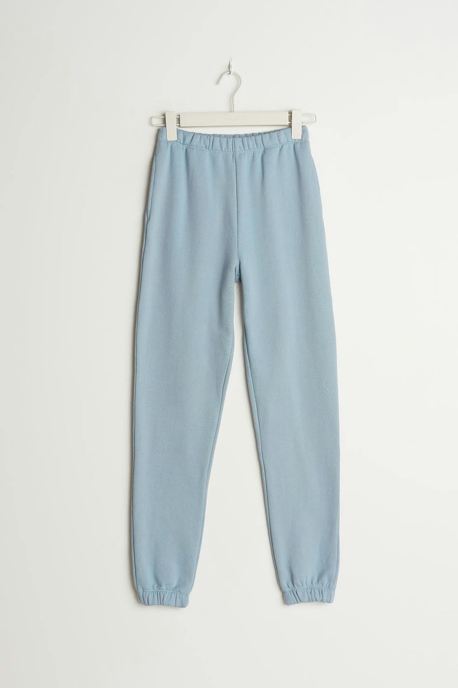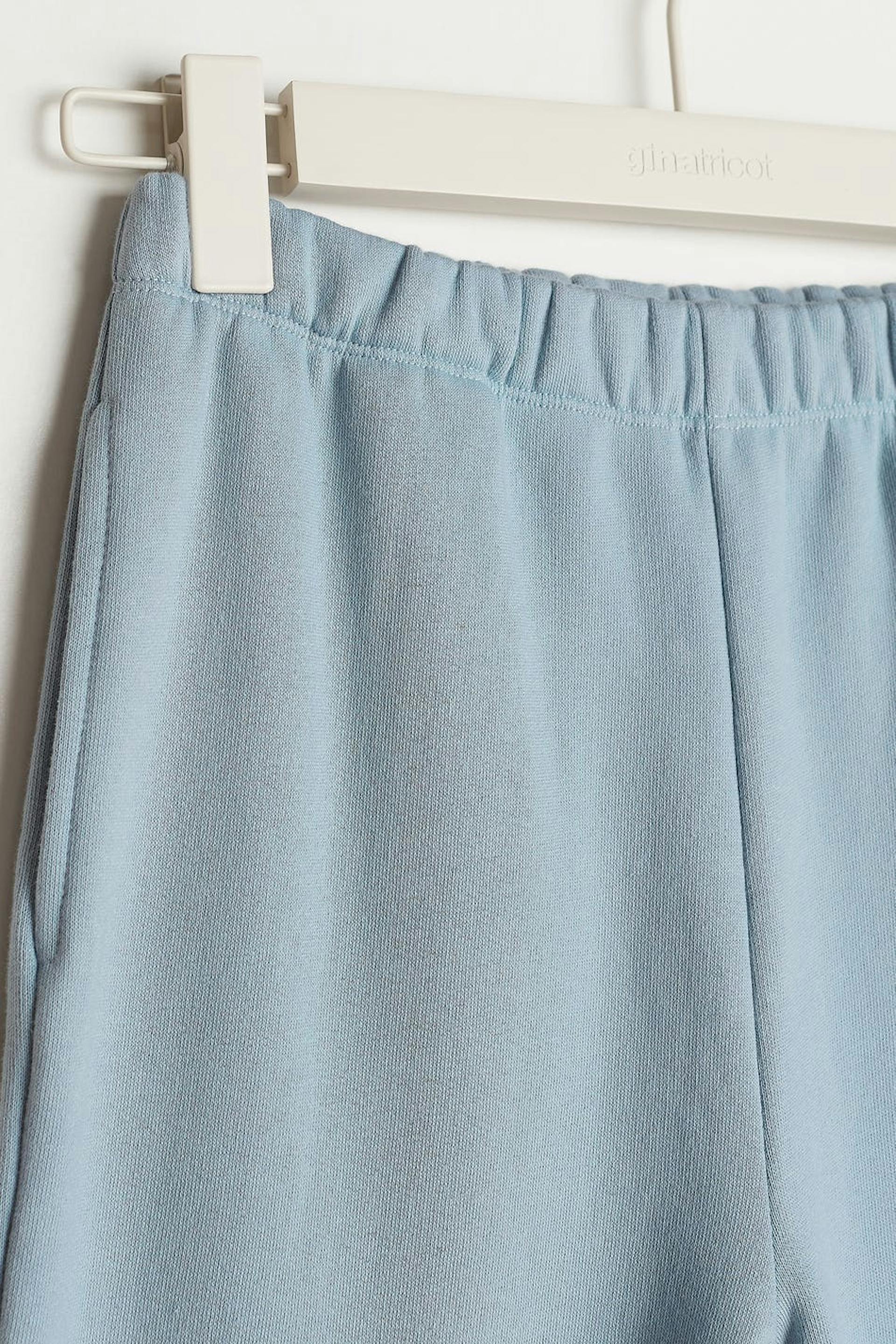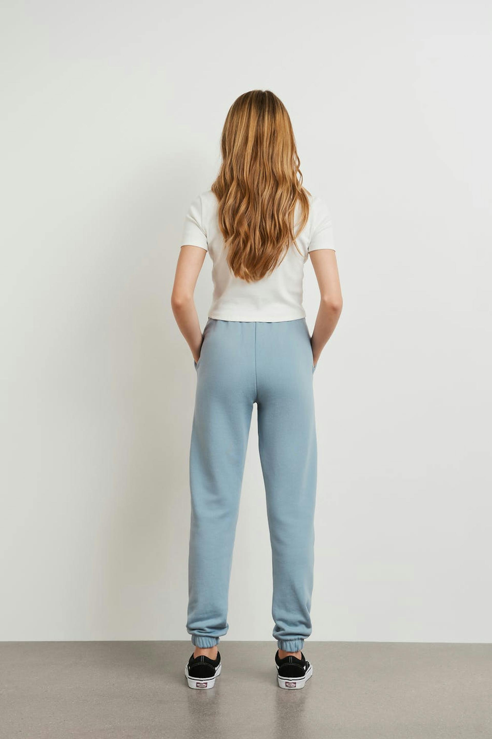 Treningsbukser fra Young-sortimentet vårt med en vanlig passform. Buksene er blå og har lommer i sidene. De har en elastisk strikk ved midjen og i enden av benet.