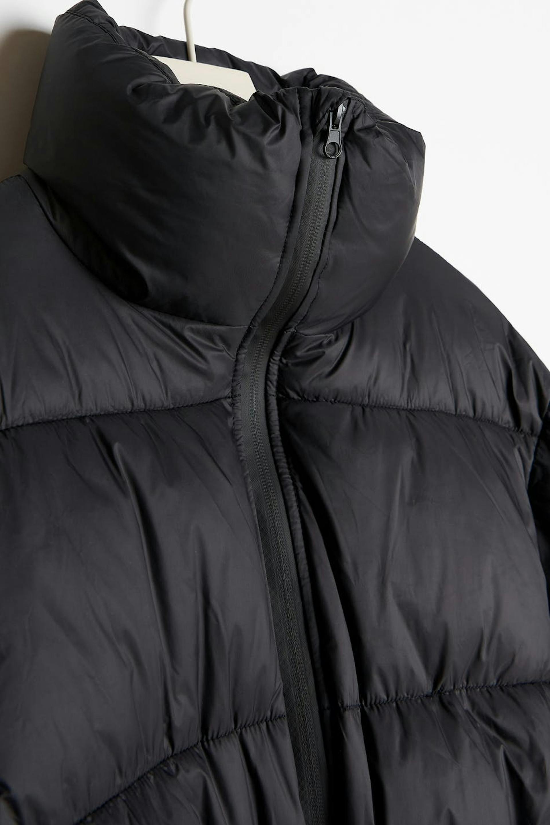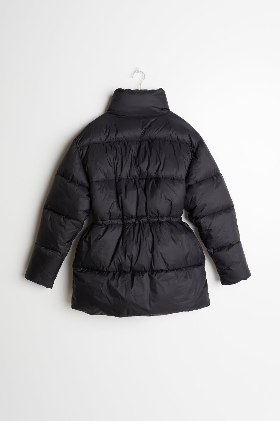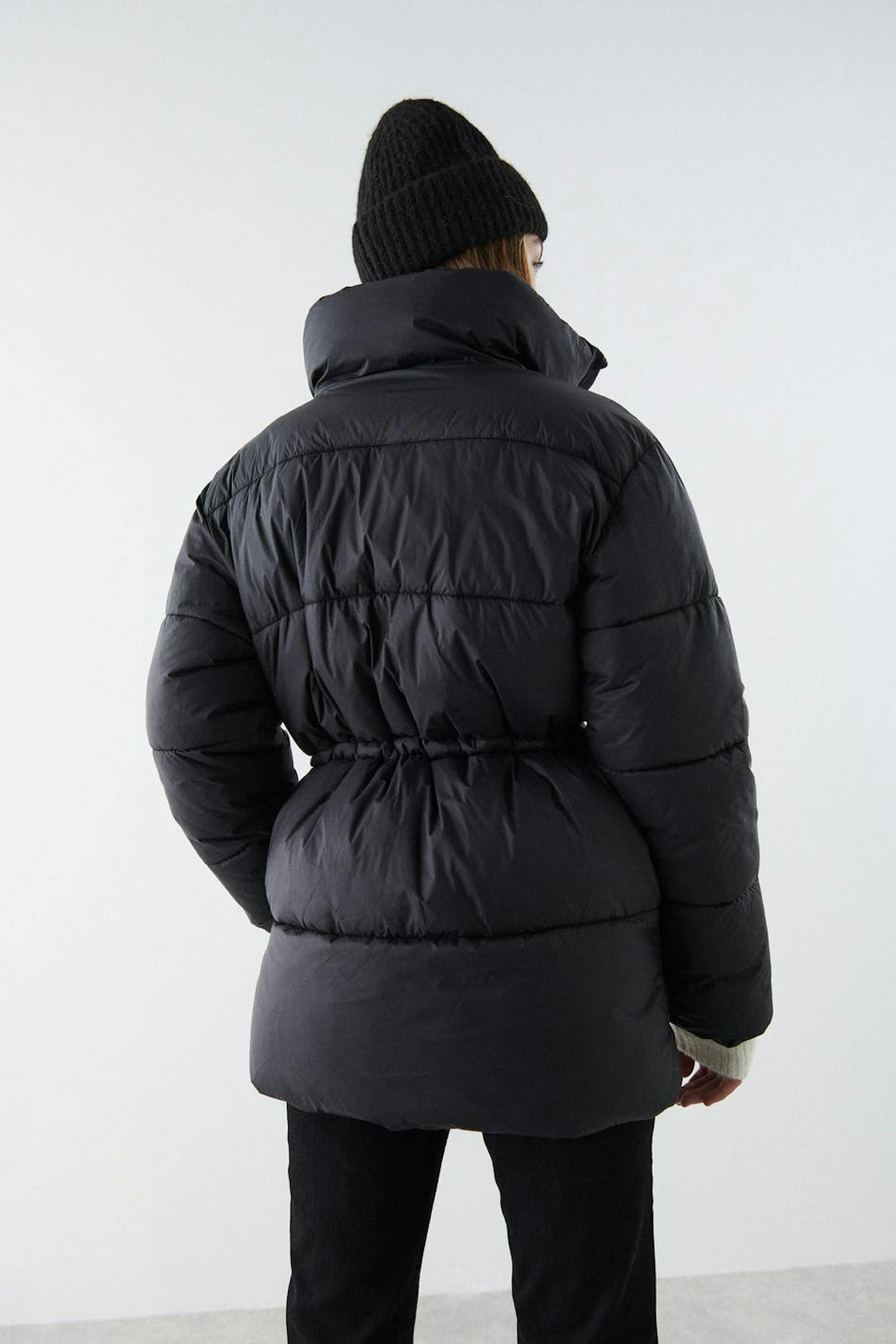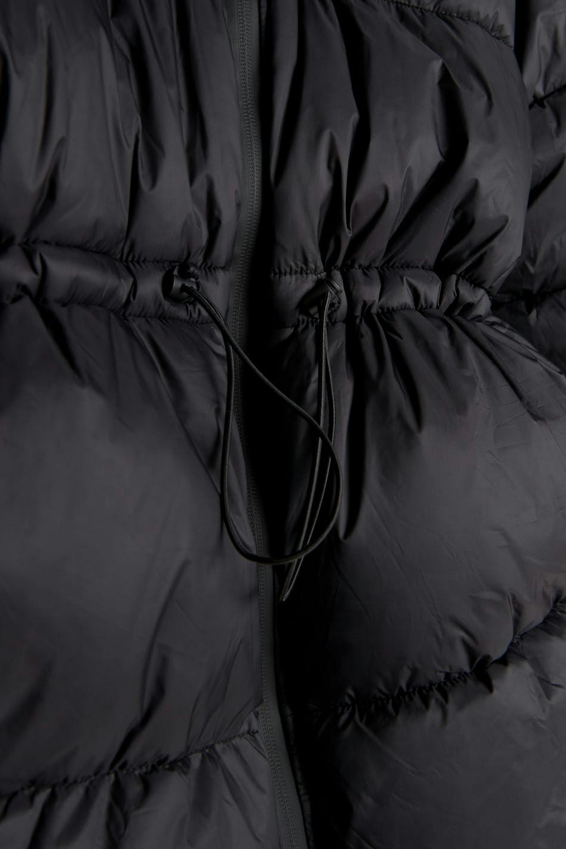 Polstre pufferjakke med høy krage. Jakken er svart og fôret og har halvskinnende kvalitet. Den har en elastisk snøring ved midjen, to-veis glidelås foran og lommer i sidene.