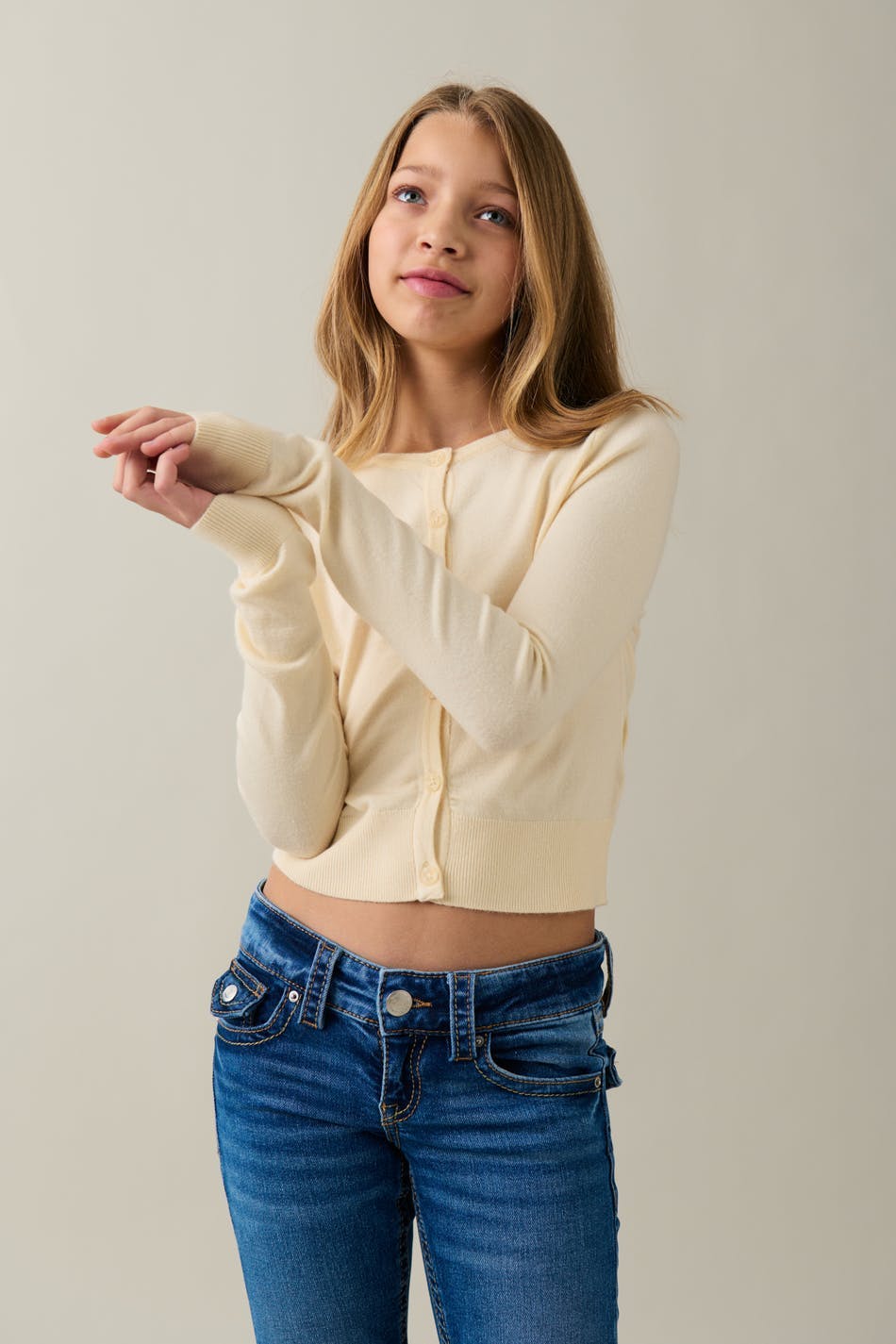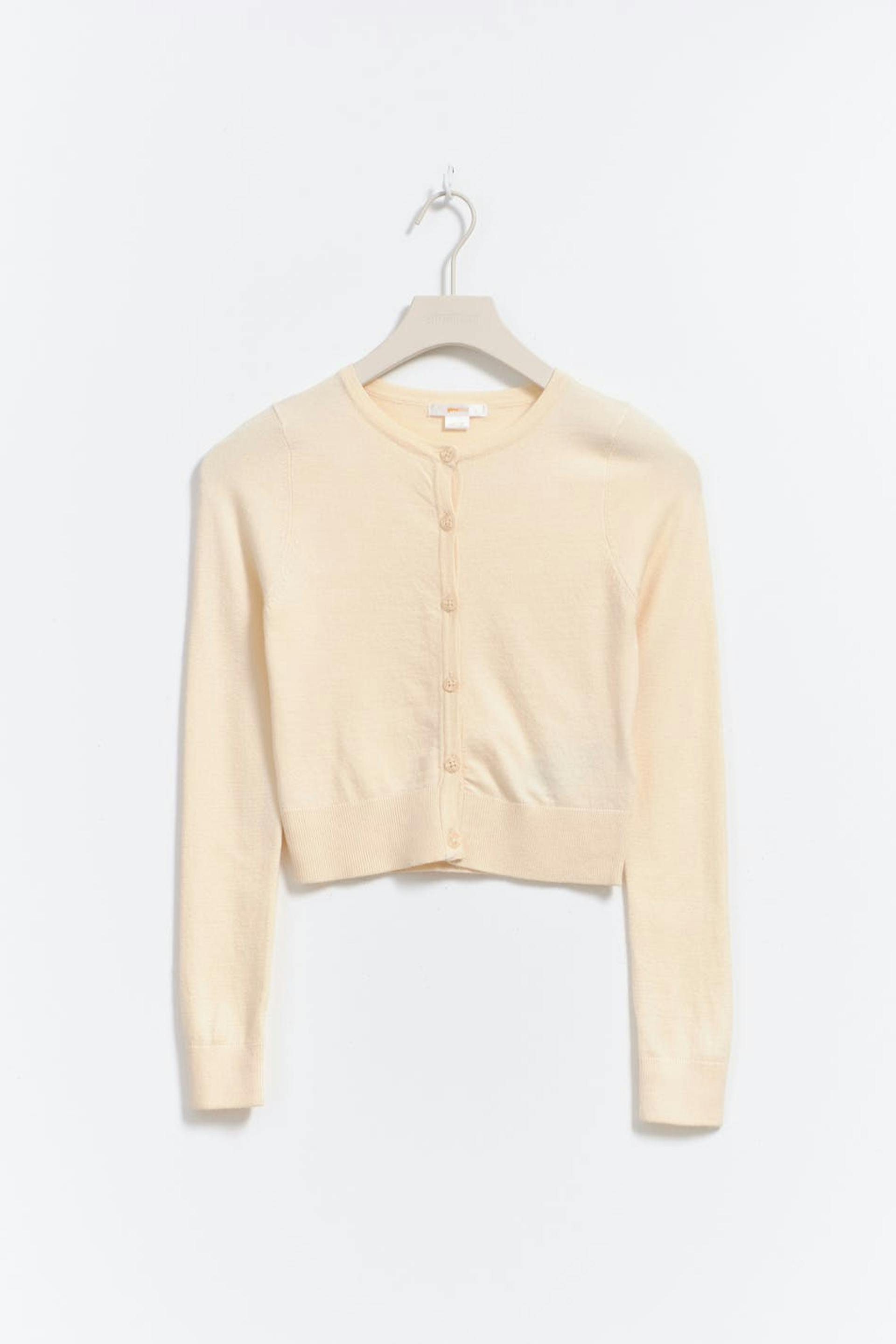 Strikket kardigan med en oversized passform. Kardiganen er hvit og har figurnær passform. Den har rund hals, knapping på forsiden, avkortet lengde og ribbestrikk ved ermeslutten og i nedre kant.