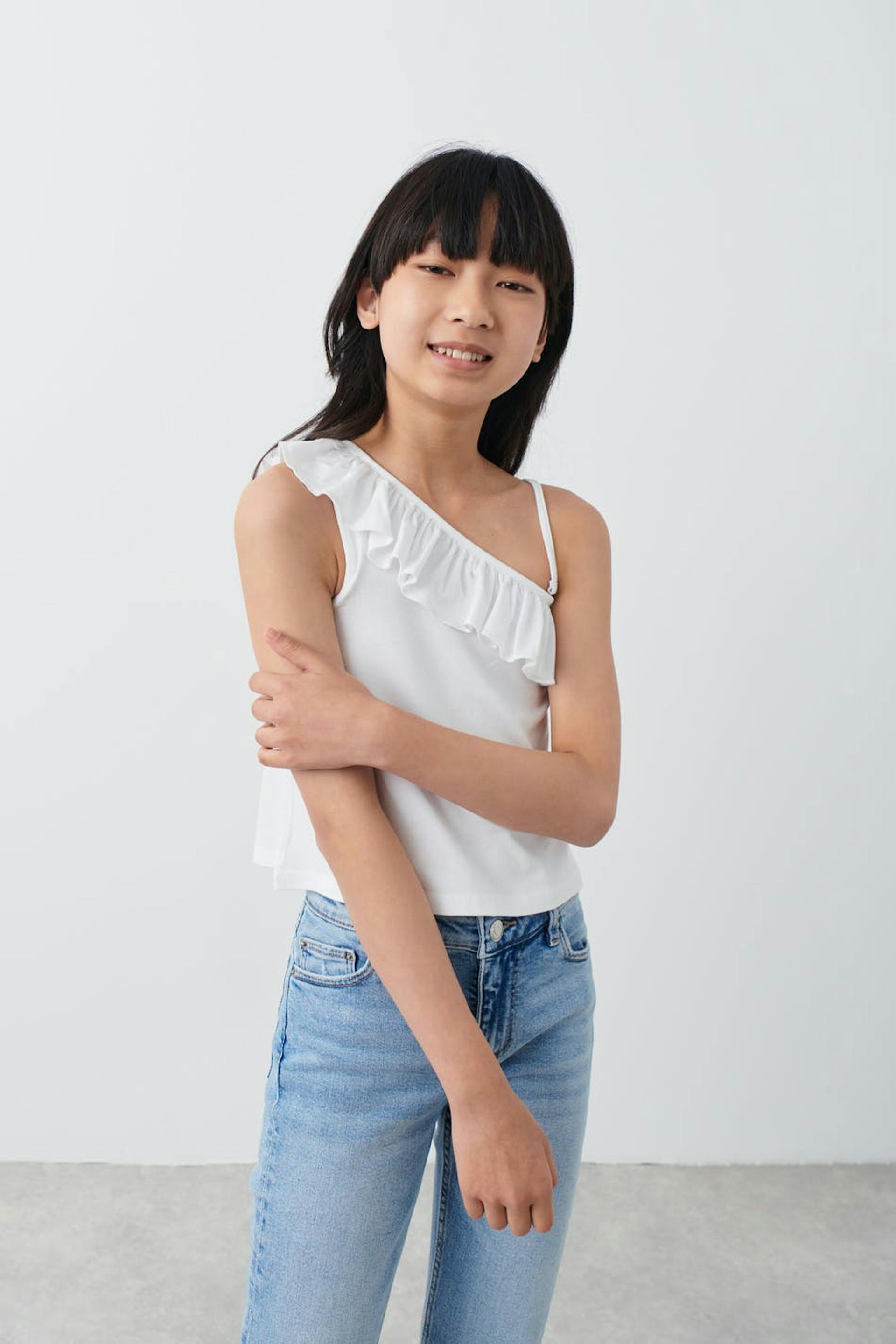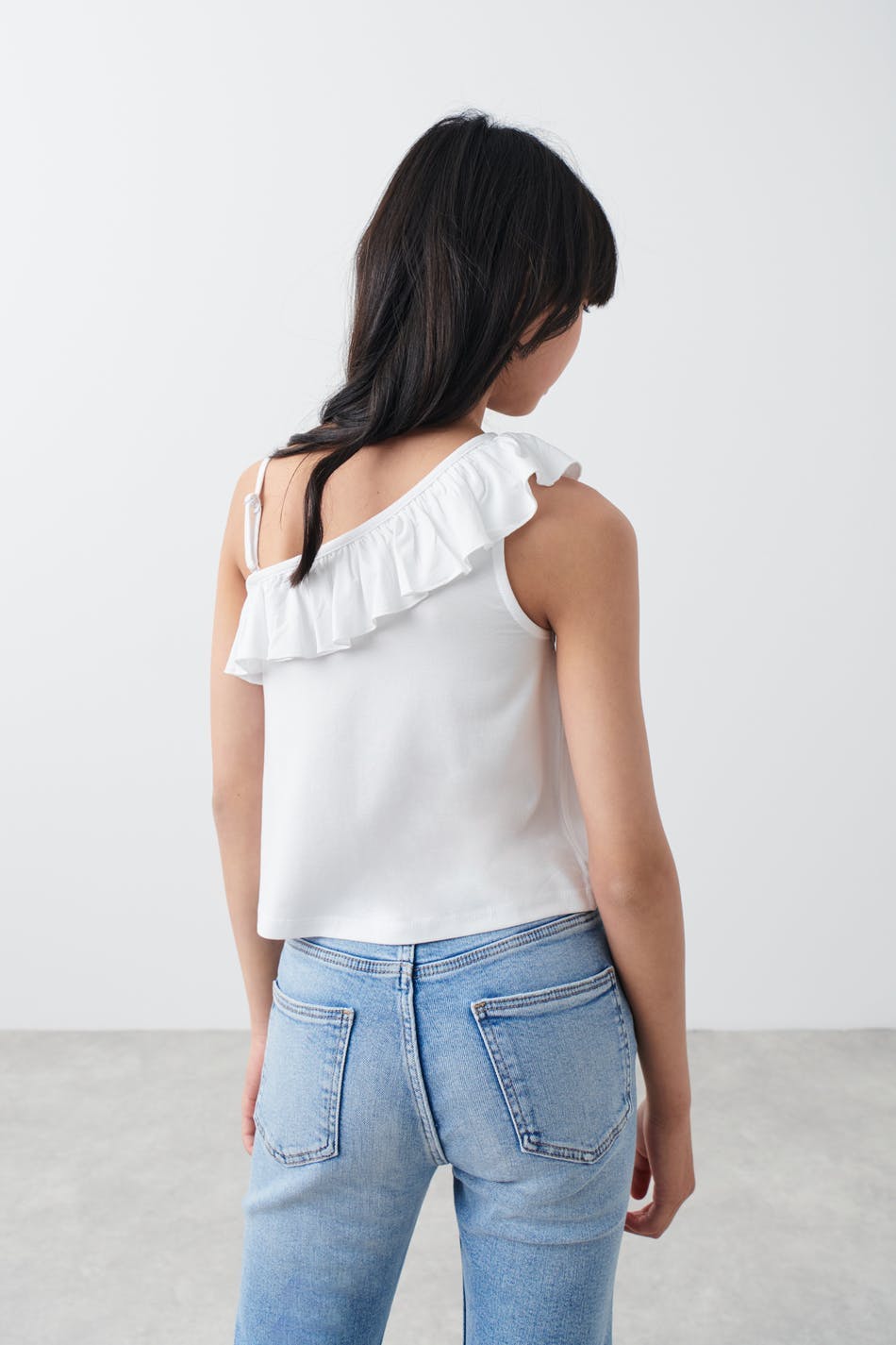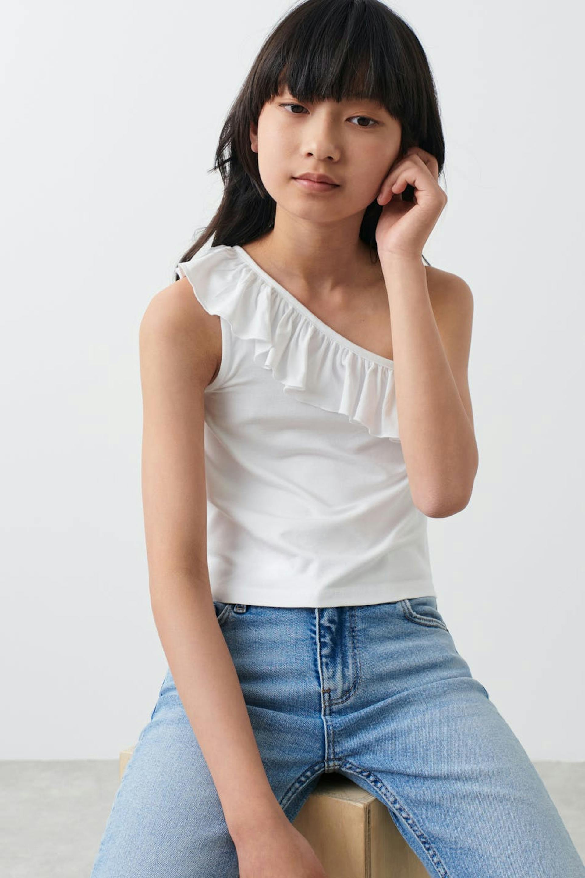 One shoulder-topp fra Gina Tricot Young med volang på halslinjen. Toppen er hvit og har avtakbare skulderstropper. Den har myk kvalitet i jersey.